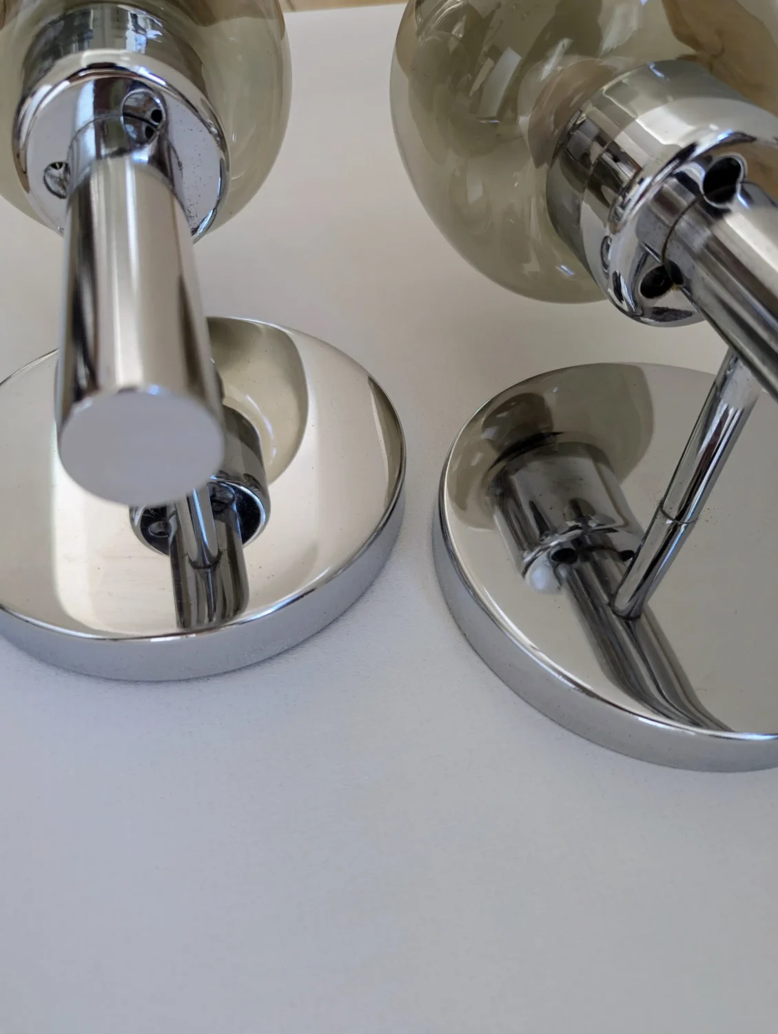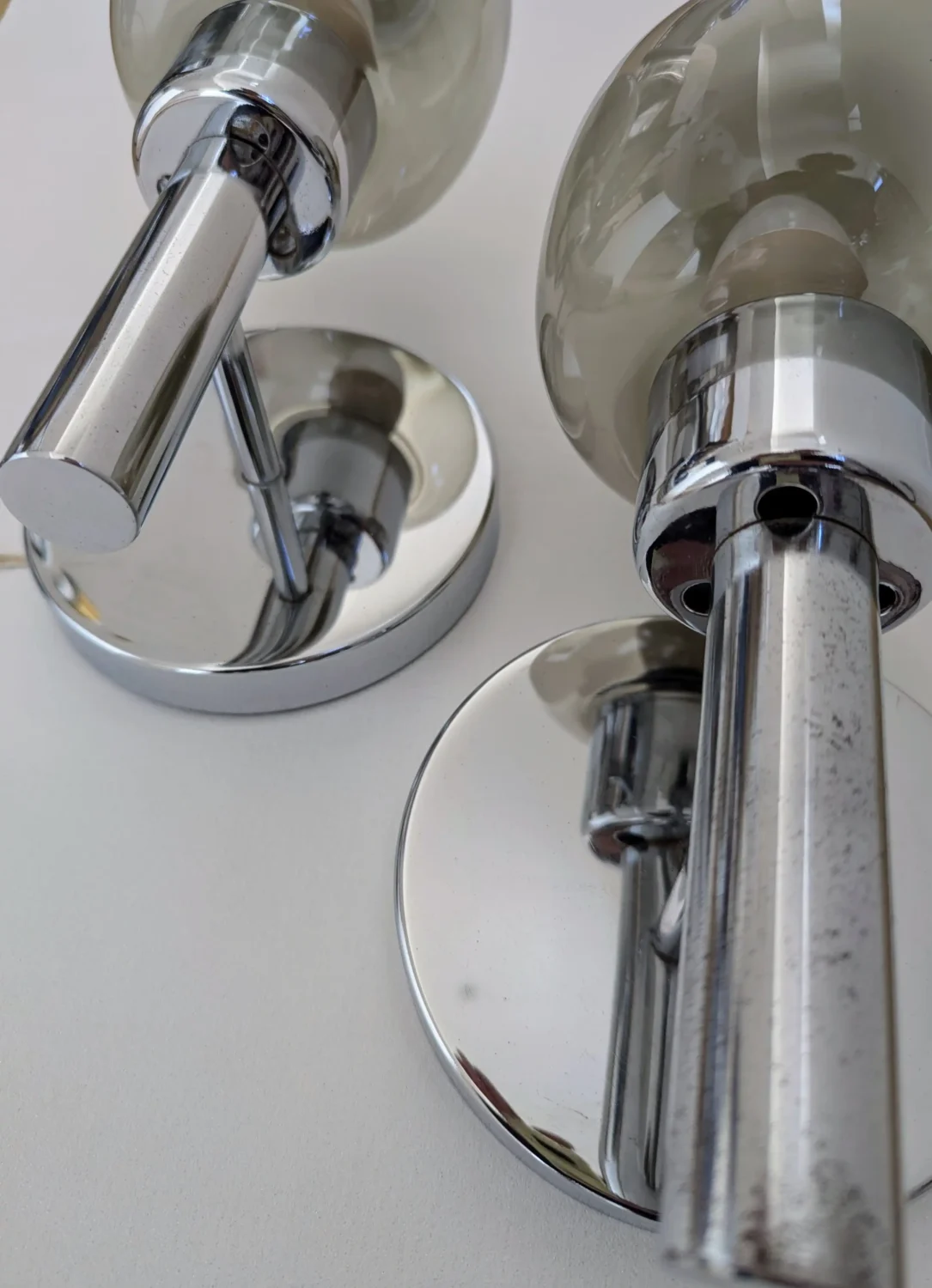 Chaque applique murale dispose d’un globe en verre fumé pour une atmosphère feutrée. Le support en chrome poli reflète subtilement l’éclairage, tout en conservant quelques marques du temps qui témoignent de leur authenticité.