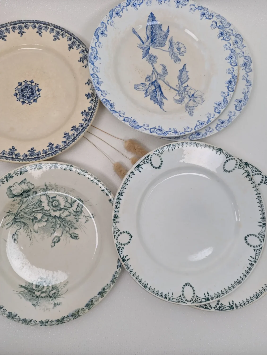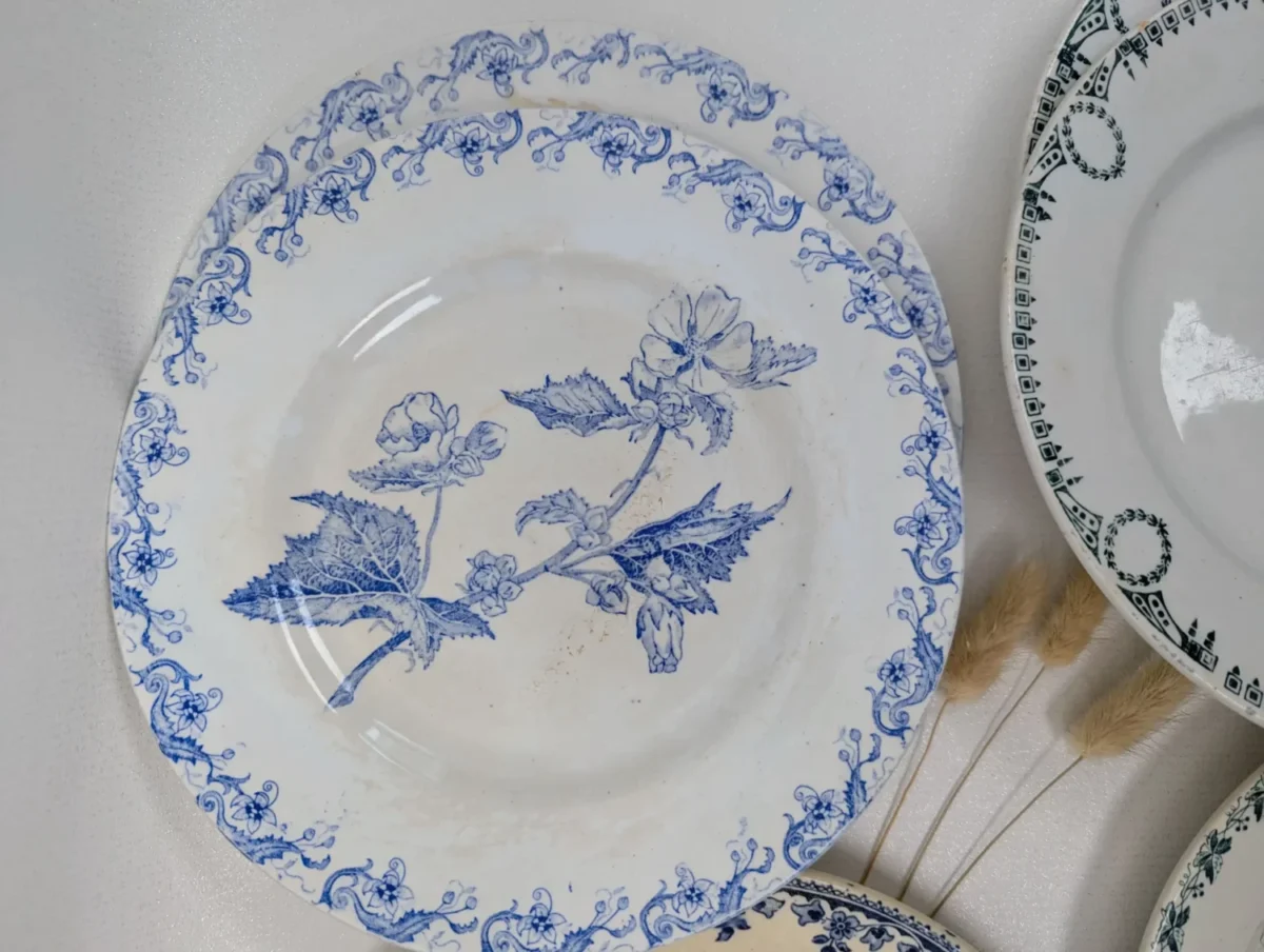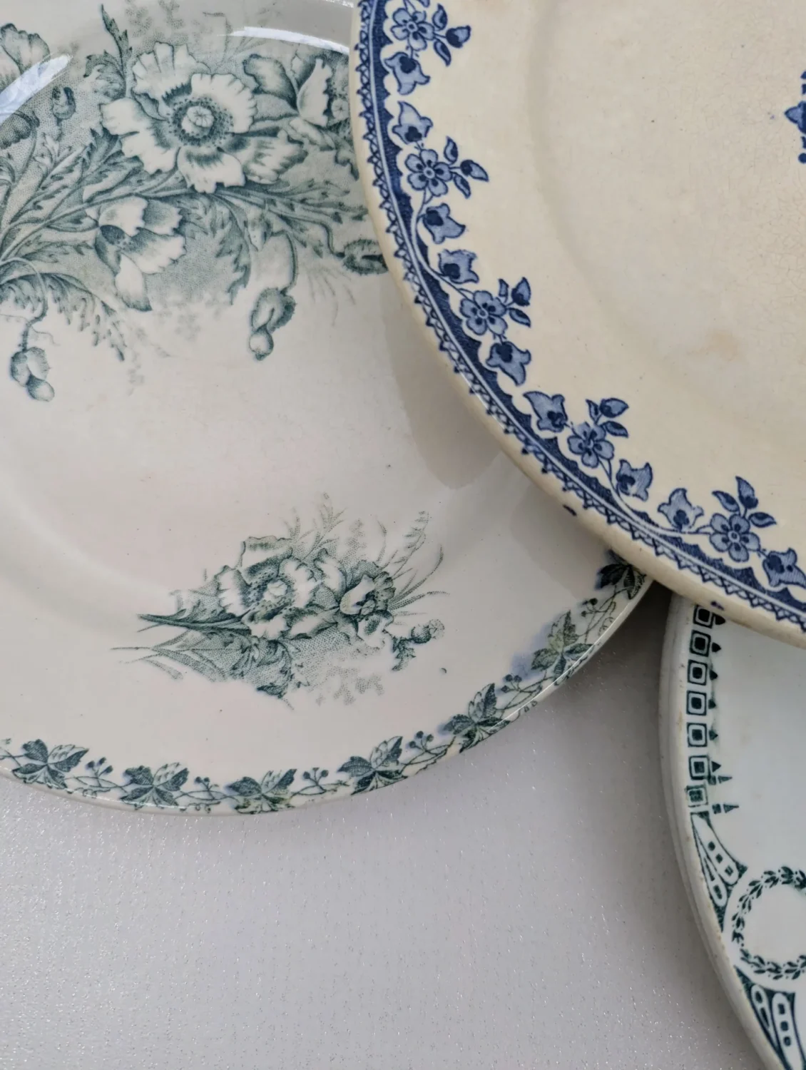 Ces assiettes dépareillées partagent un style décoratif cohérent : motifs floraux ou géométriques typiques du XIXe siècle, couleurs douces et pâtes anciennes à l’aspect légèrement ivoire.