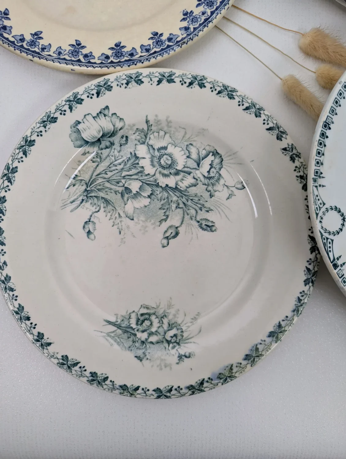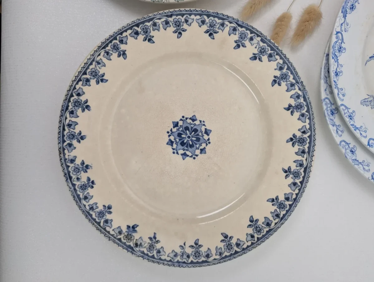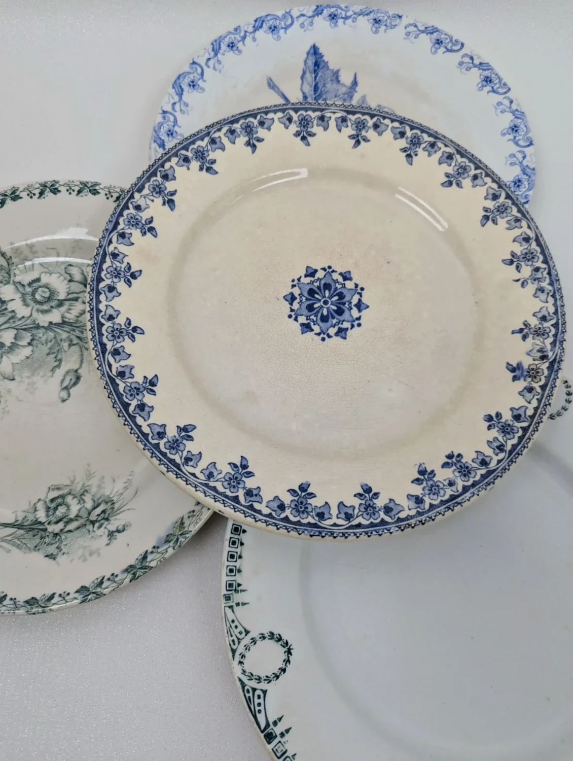 Ces assiettes dépareillées partagent un style décoratif cohérent : motifs floraux ou géométriques typiques du XIXe siècle, couleurs douces et pâtes anciennes à l’aspect légèrement ivoire.