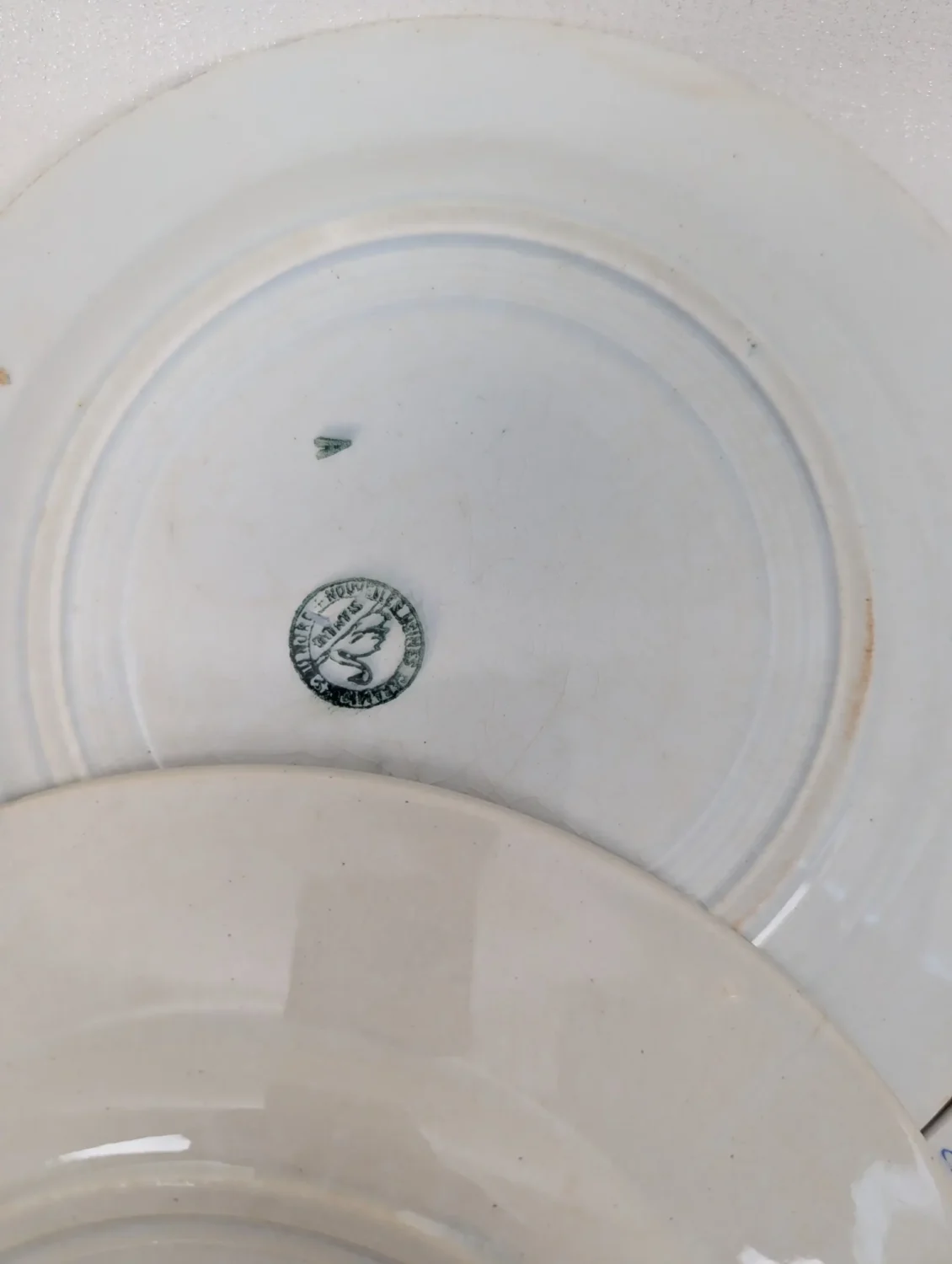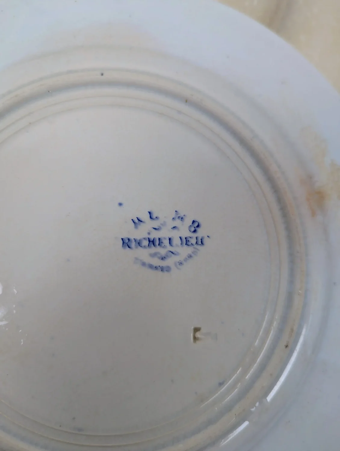 Bon état d’usage dans l’ensemble, chaque assiette a plus d’un siècle. A noter un cheveu sur l’assiette bleu et quelques traces jaunes sur les assiettes Richelieu.