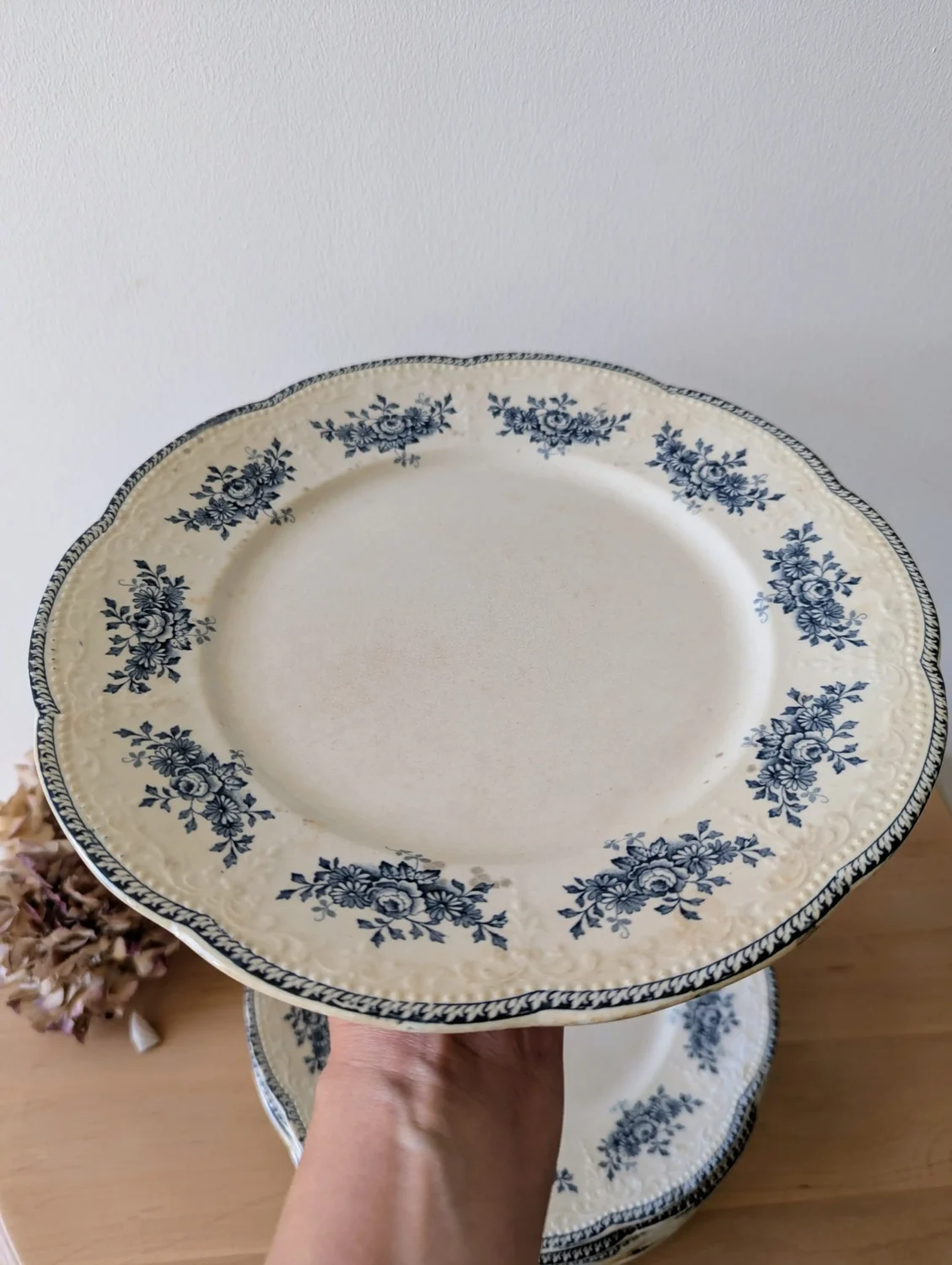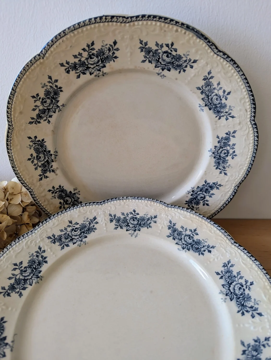 Avec leur diamètre d’environ 26 cm, ces assiettes conviennent à un usage quotidien. Toutefois, elles s’adaptent aussi très bien à une table de fête. Ensuite, leur patine naturelle ajoute une note douce et authentique. De plus, elles s’harmonisent avec du lin, de l’argenterie ou des verres anciens. Ainsi, elles créent une atmosphère slow déco, chaleureuse et très française.