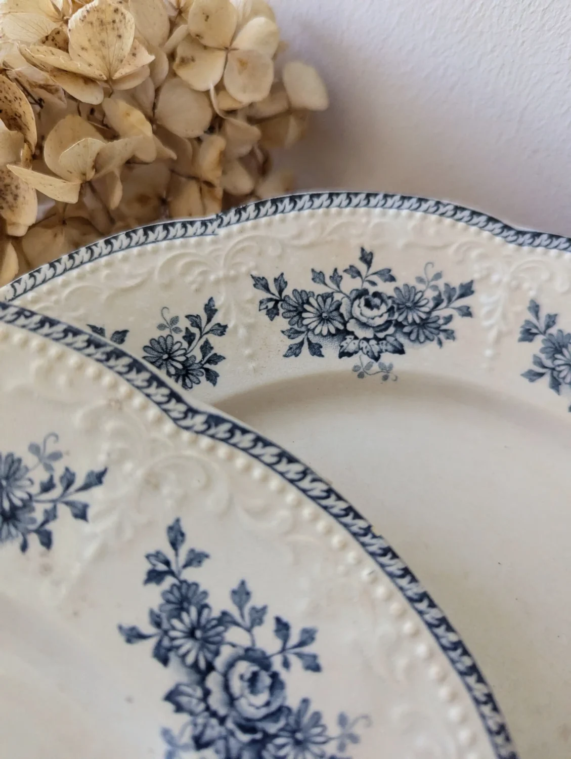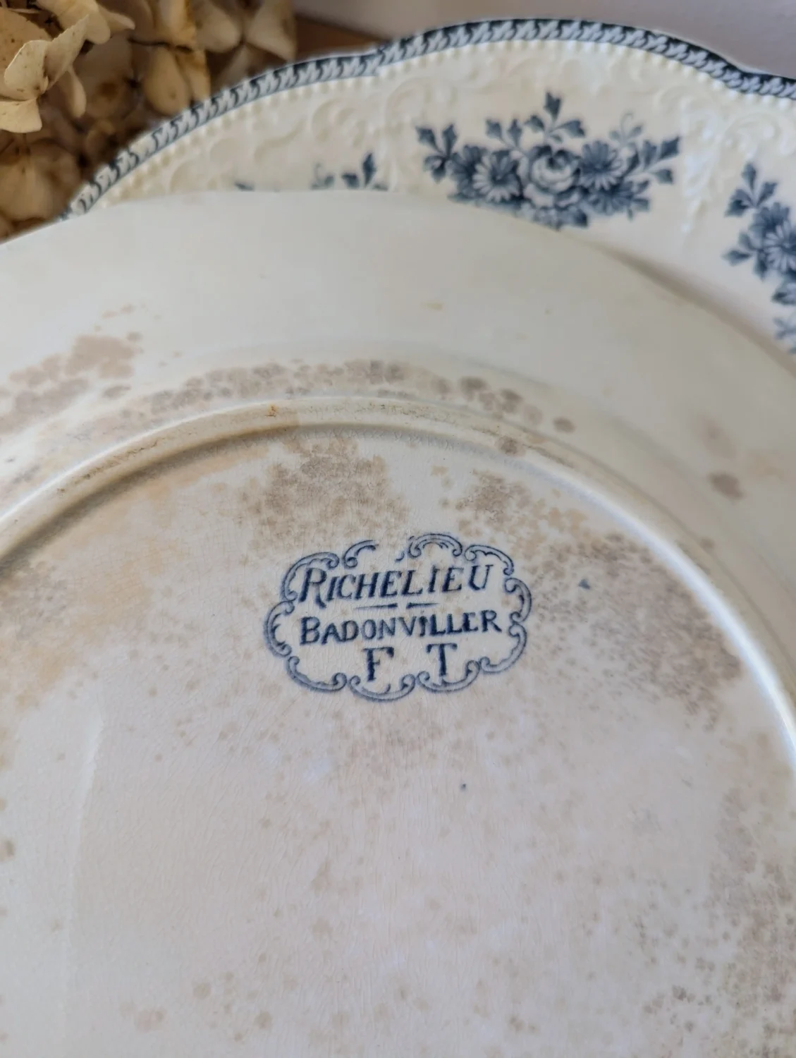 Les faïenceries de Badonviller, situées en Lorraine, cultivent un vrai héritage artisanal. En effet, elles utilisent la terre de fer, une faïence solide et raffinée, très appréciée au début du XXᵉ siècle. Par ailleurs, le modèle Richelieu fait partie des décors emblématiques de la manufacture. Ainsi, ses guirlandes fleuries, son relief perlé et son bleu profond évoquent la douceur des maisons bourgeoises françaises.