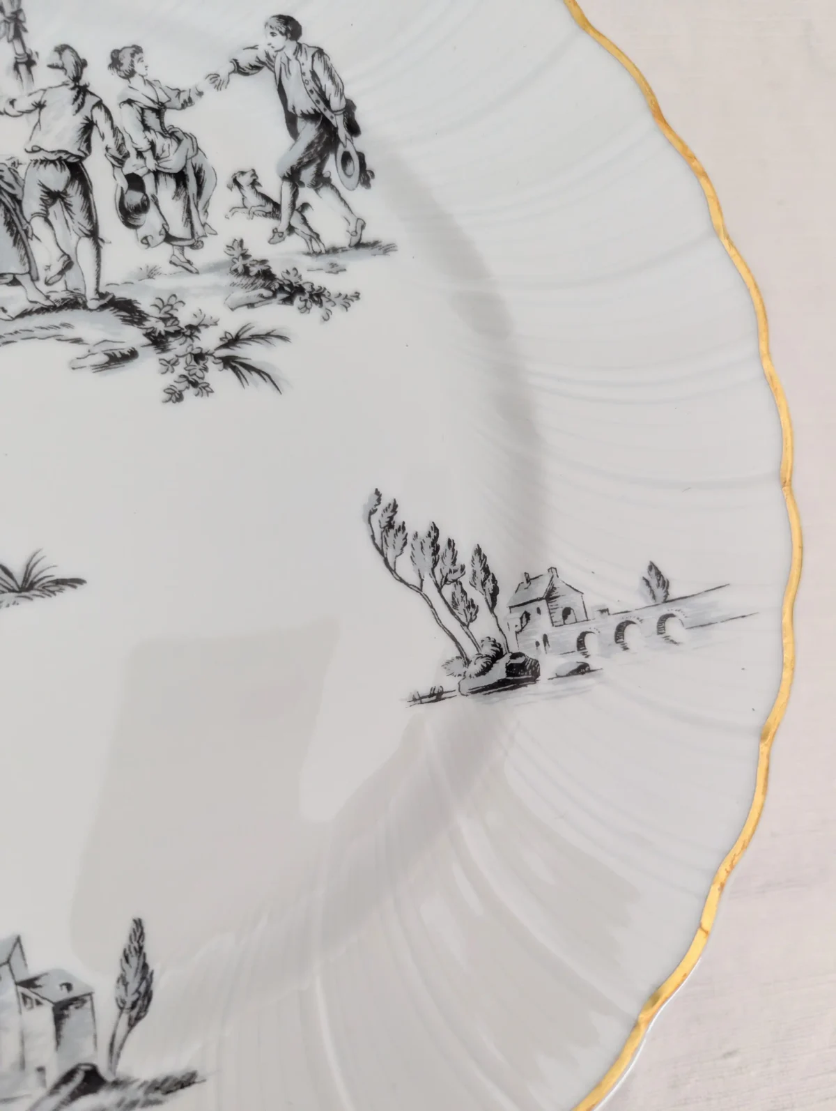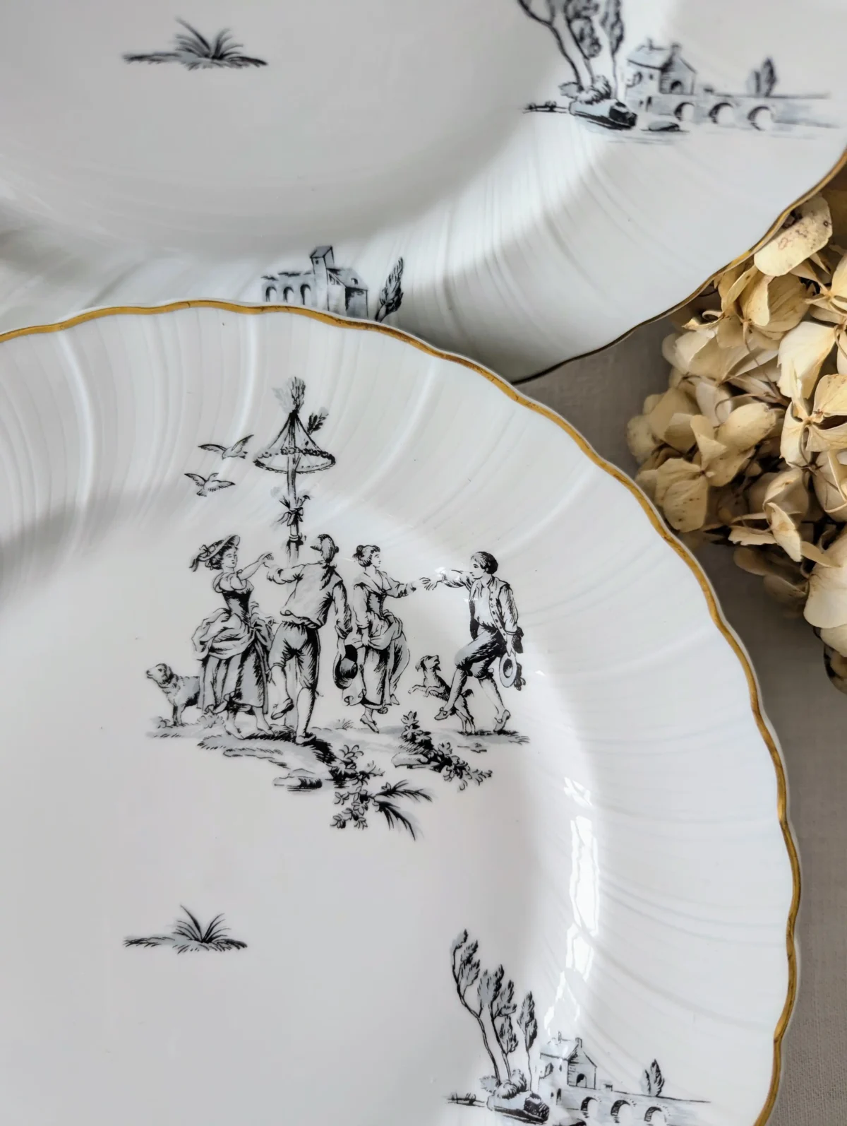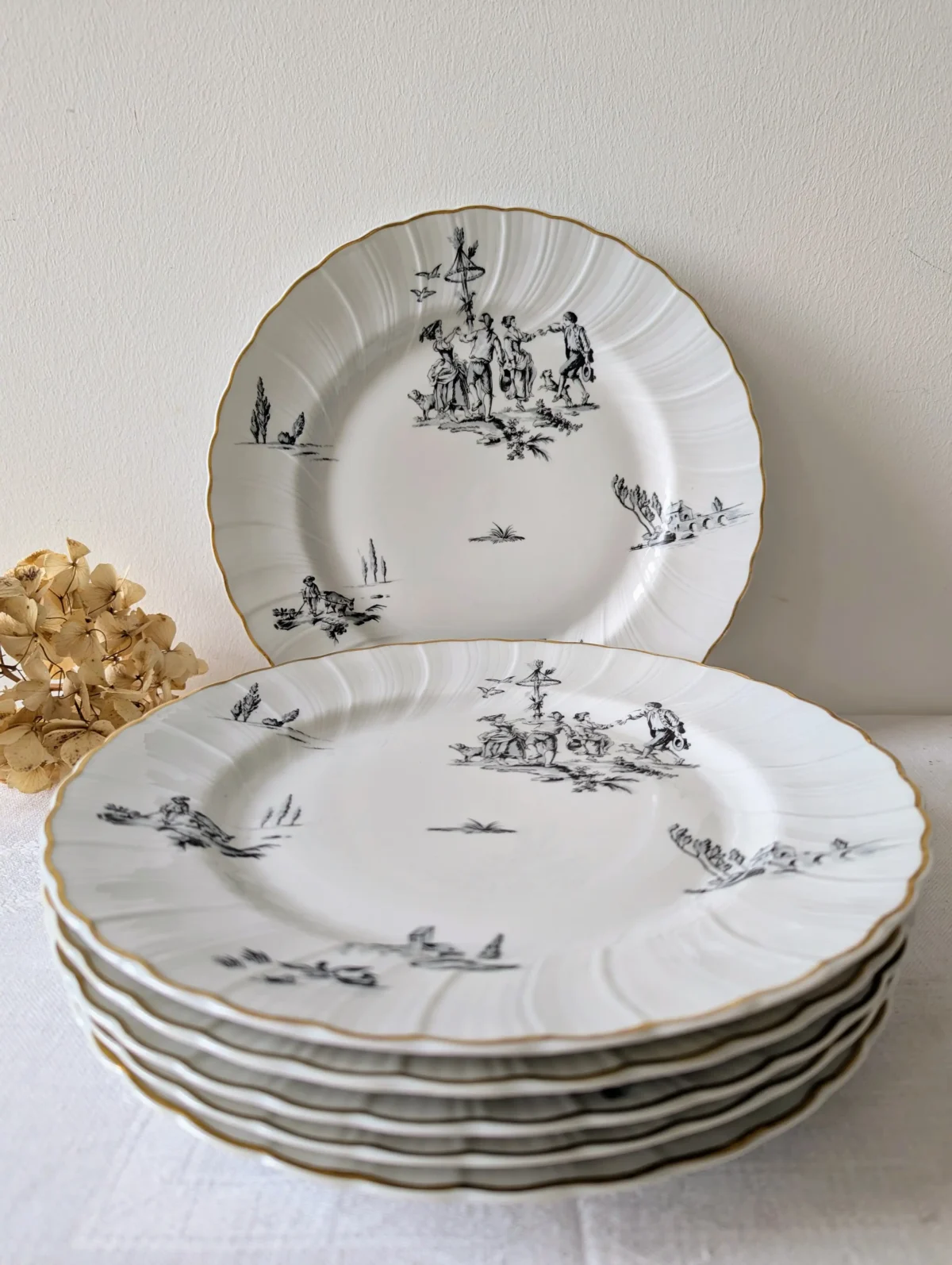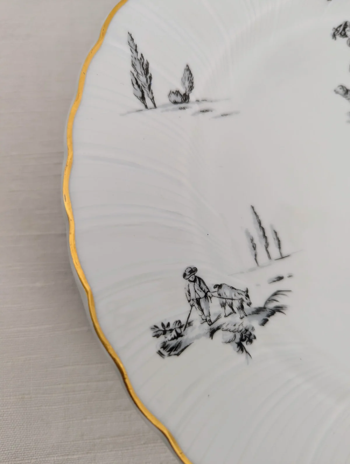 Chaque assiette illustre une scène champêtre animée : personnages, animaux et éléments architecturaux y sont finement représentés.