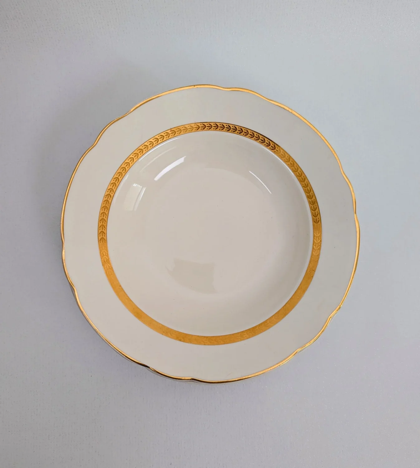Les assiettes creuses de 24 cm présentent une ligne classique rehaussée de décors dorés. Deux filets soulignent le contour : l’un épuré, l’autre finement décoré de motifs de feuillage stylisés, apportant une note précieuse sans ostentation.