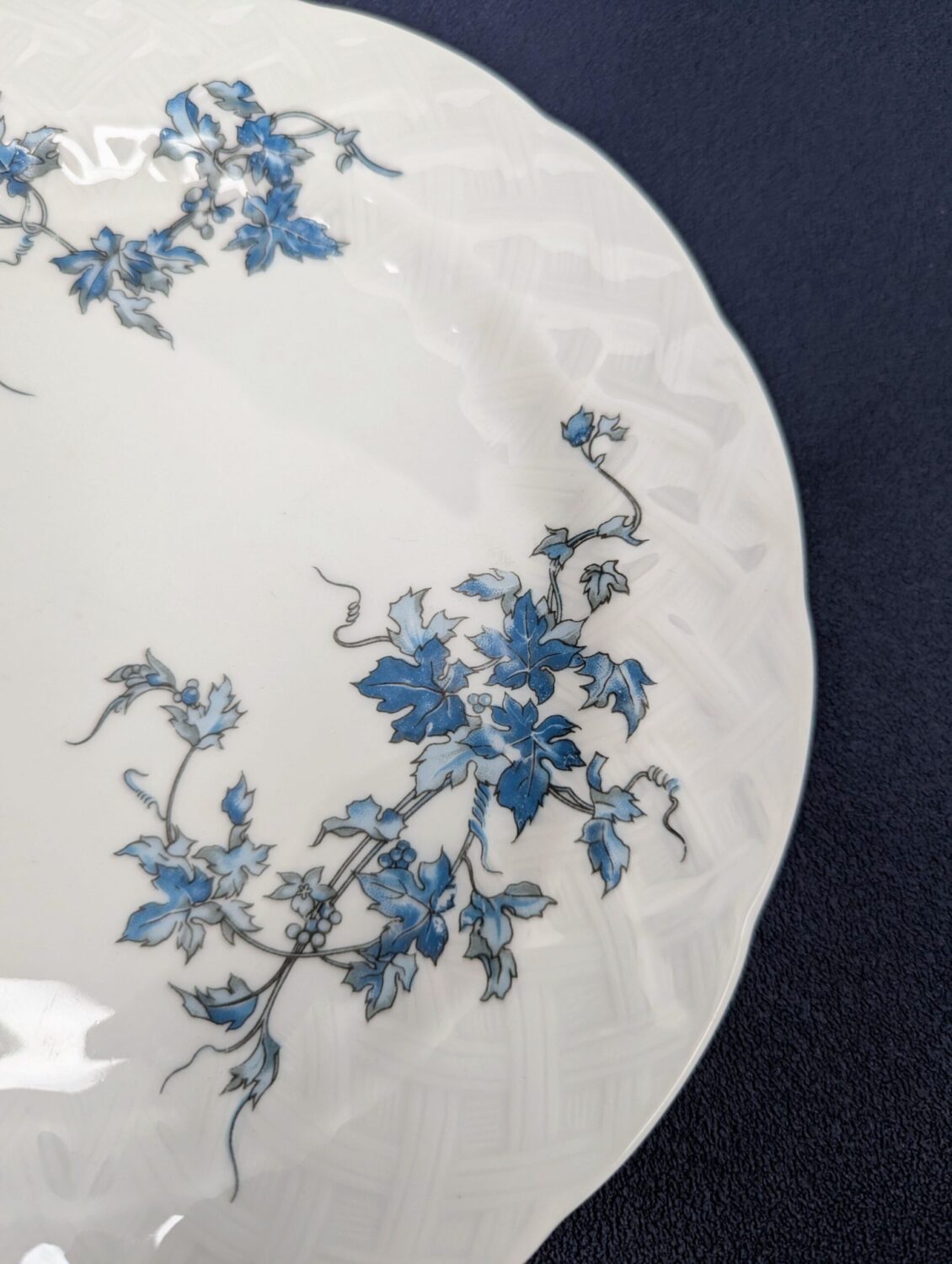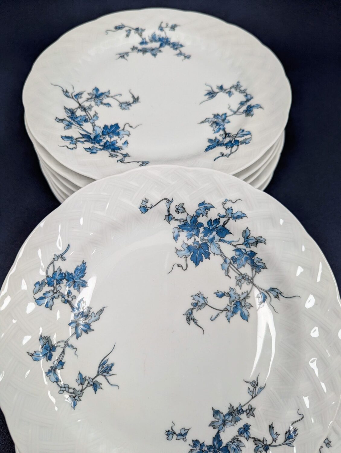Sublimez vos instants gourmands avec ce raffiné service d’assiettes à dessert en porcelaine de Limoges, composé de 9 pièces élégantes, toutes signées L. Bernardaud & Co, l’un des plus grands noms de la porcelaine française. Ce modèle, baptisé St Saëns, se démarque par la délicatesse de ses motifs floraux en forme de vignes, minutieusement peints à la main dans un ton bleu doux, qui évoque à la fois la fraîcheur du jardin et la sobriété classique d’une table élégante.