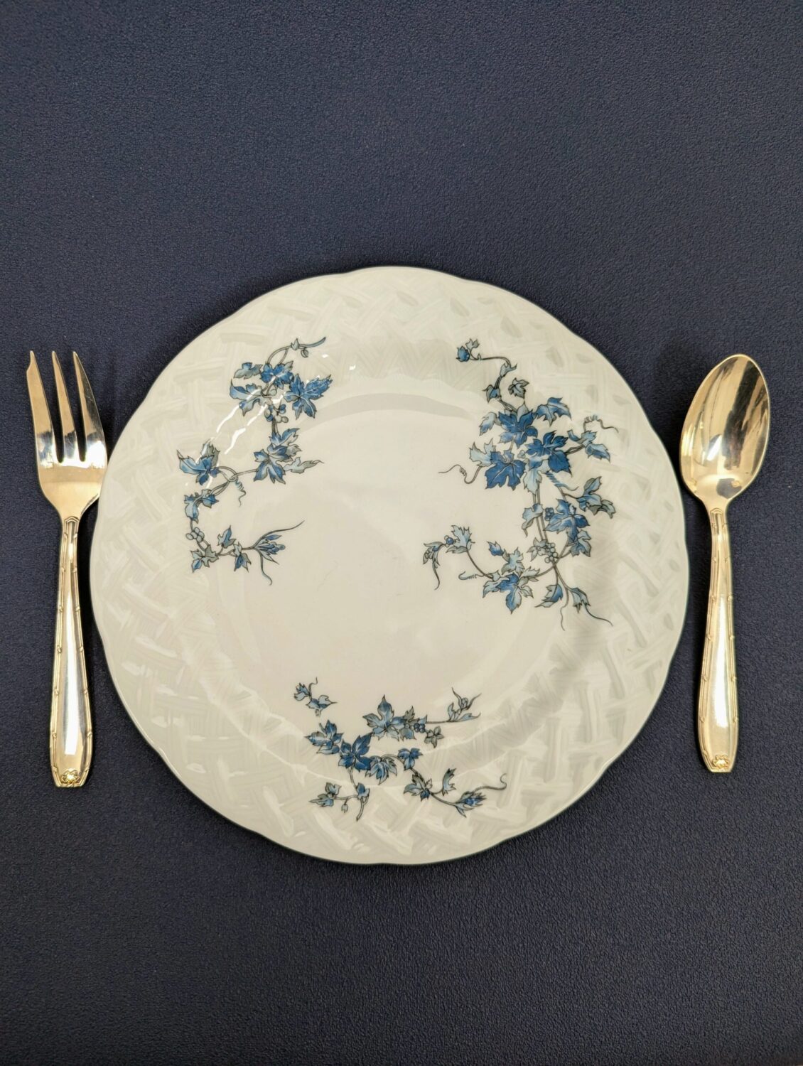 Ce qui rend ce service si particulier, c’est aussi la délicatesse des vignes bleues, qui, bien qu’ornementales, restent sobres et aériennes. Ainsi, il s’intègre aussi bien dans une vaisselle classique que dans un univers plus contemporain. De plus, le motif St Saëns, à la fois poétique et discret, confère à chaque assiette une dimension artistique subtile.