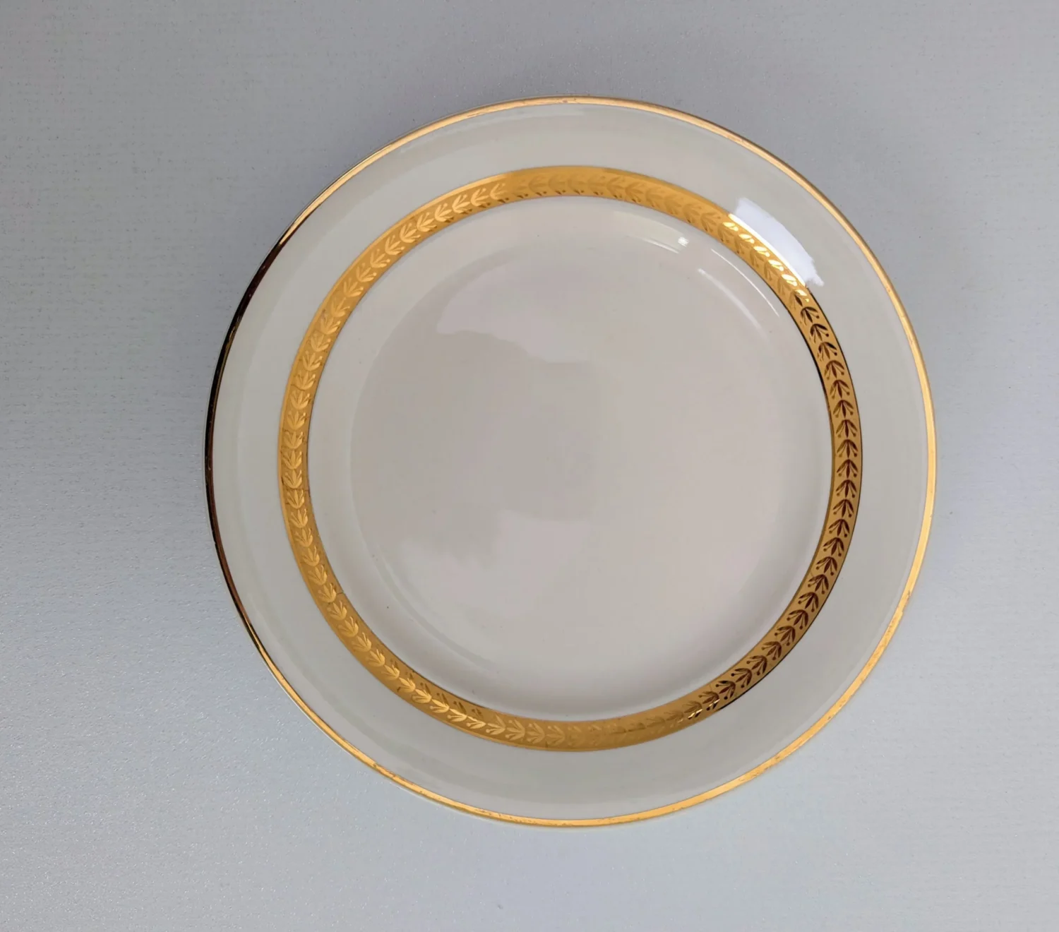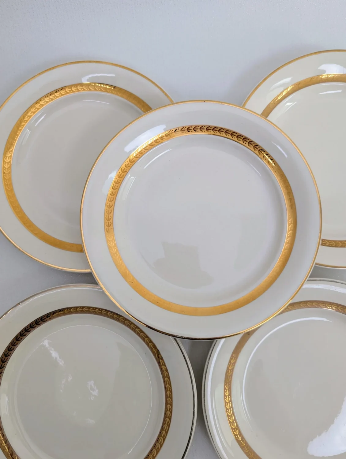 Oui, les six assiettes appartiennent au même modèle 7301 et présentent le même décor ivoire avec double liseré doré, dont un feuillagé. De légères variations liées à l’âge peuvent exister mais elles forment bien un service homogène.