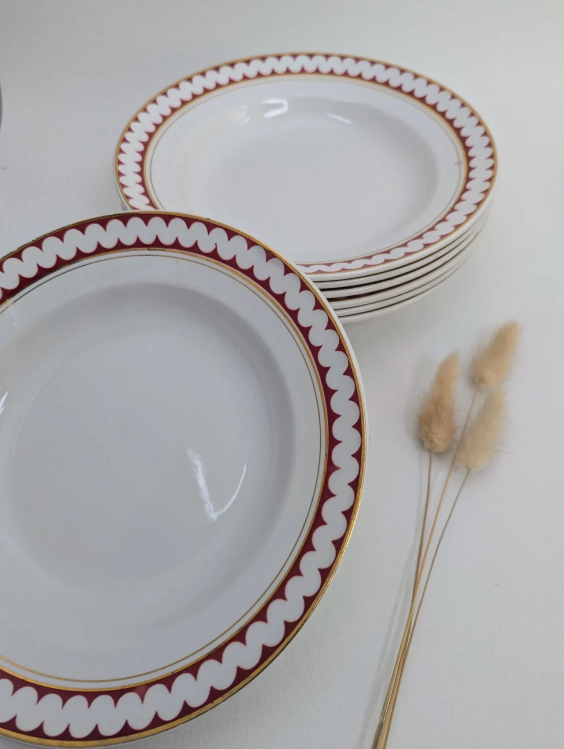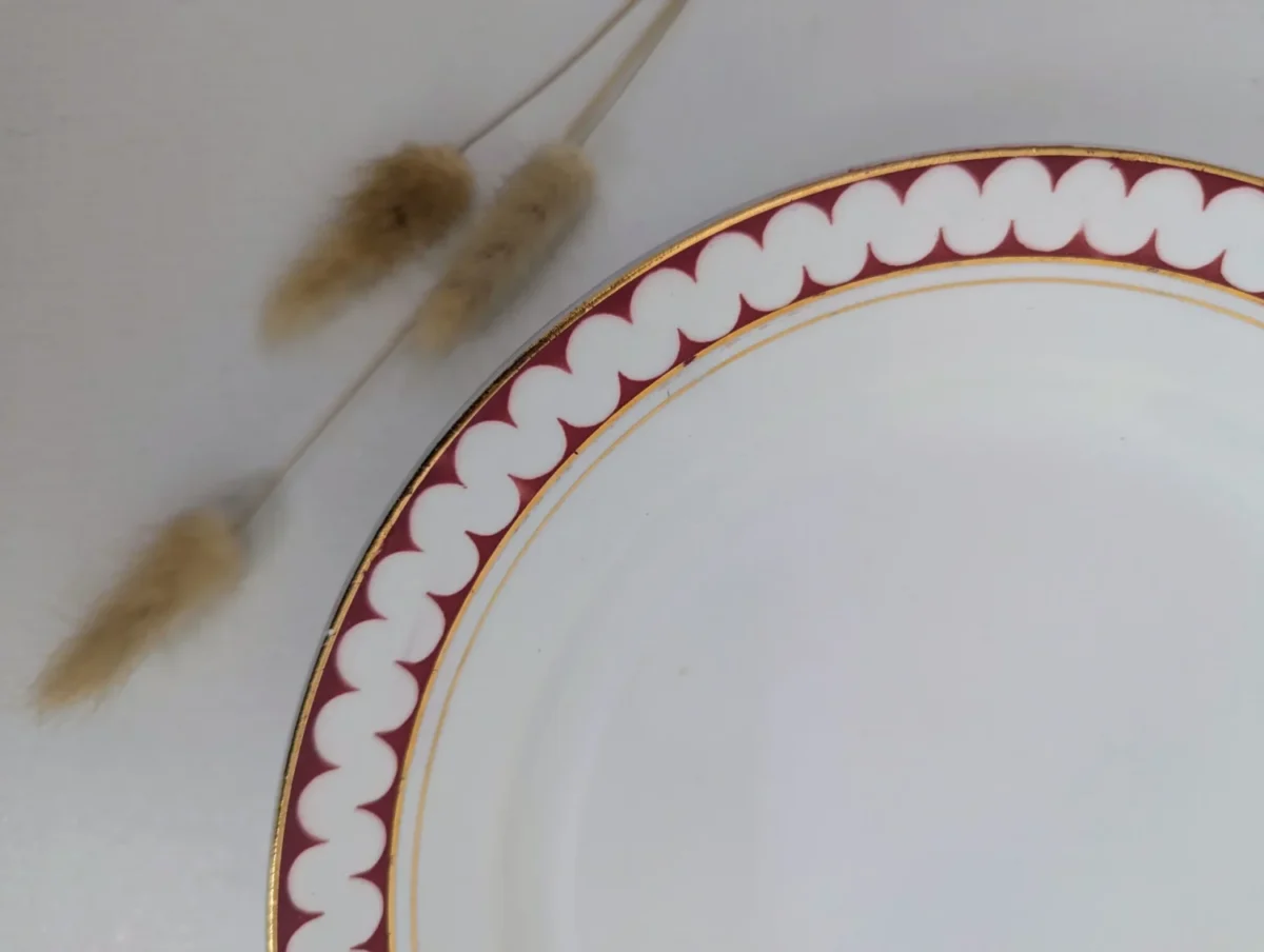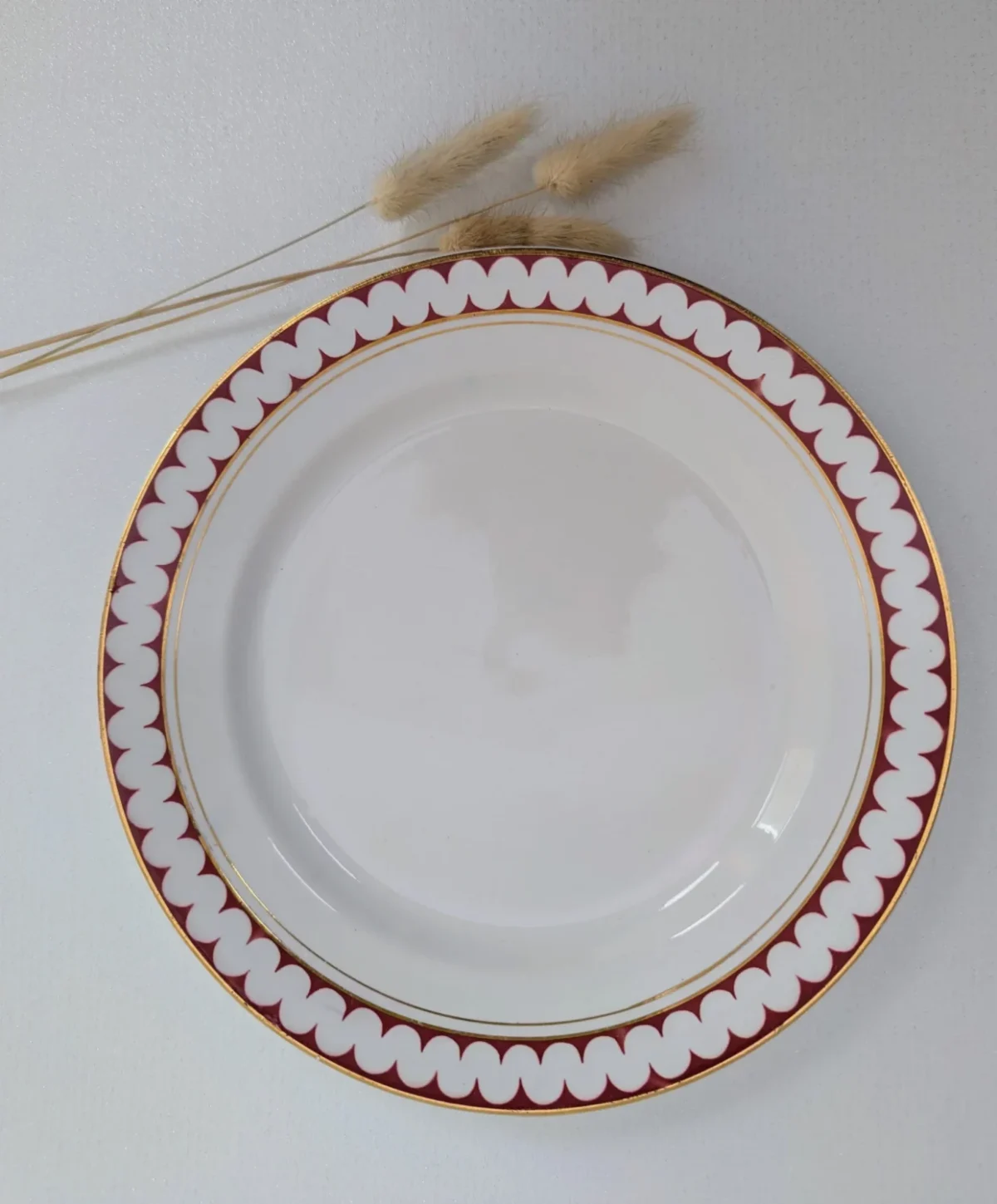Ces assiettes plates de 23 cm de diamètre arborent un décor travaillé composé de motifs ondulants, formant un élégant contraste sur un fond rouge profond rehaussé de détails dorés. Le design, à la fois riche et équilibré, fait de ce service un véritable hommage à l’esthétique de la première moitié du XXe siècle.