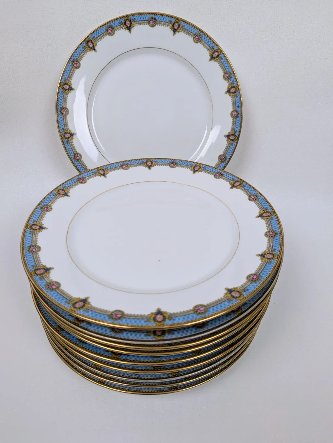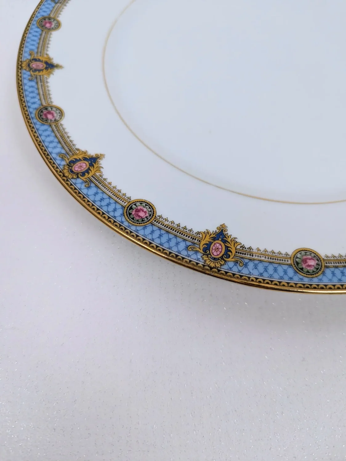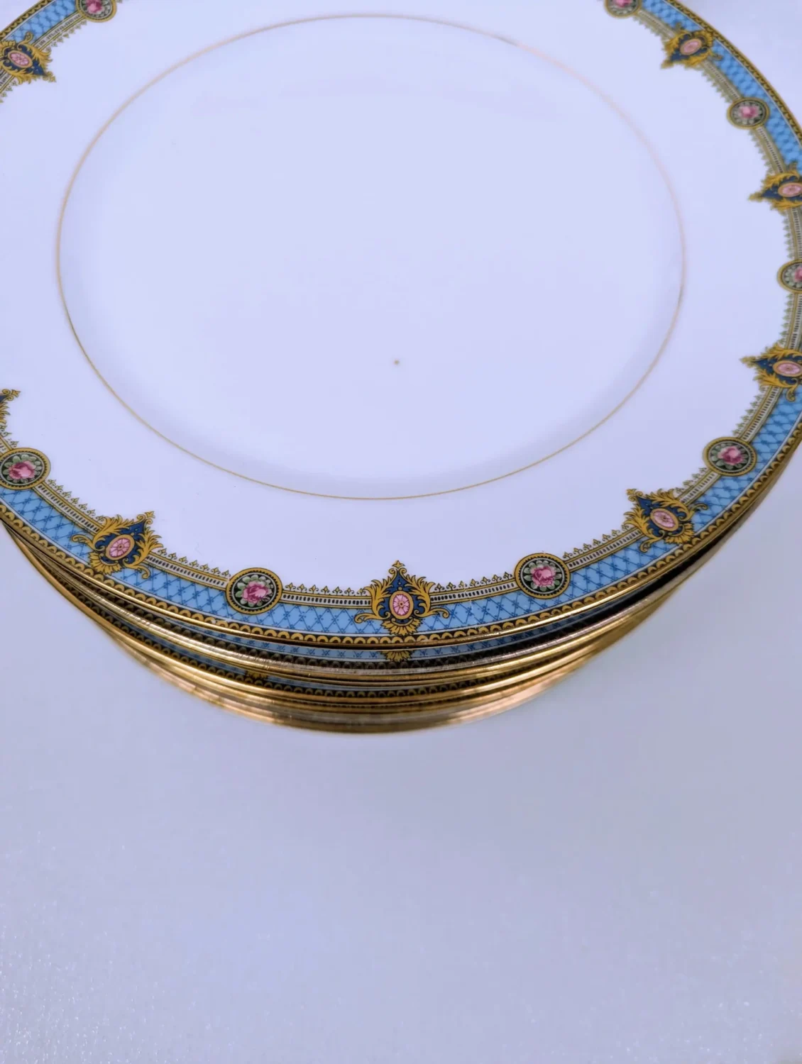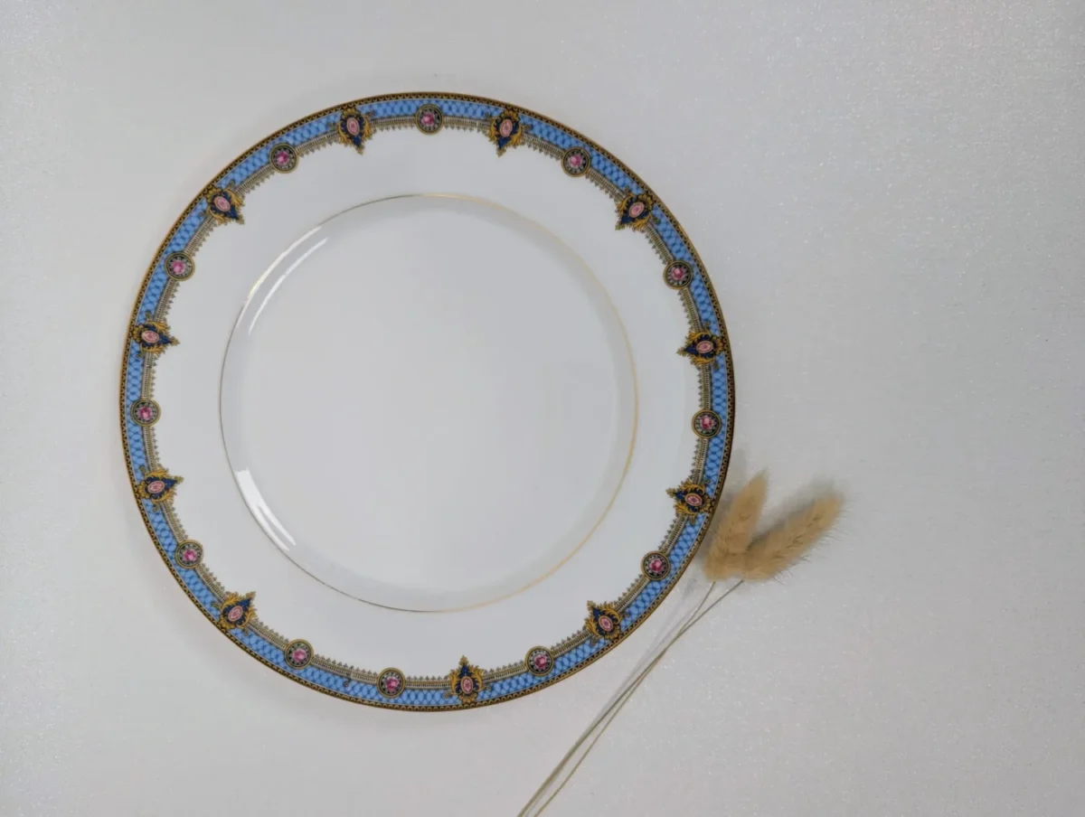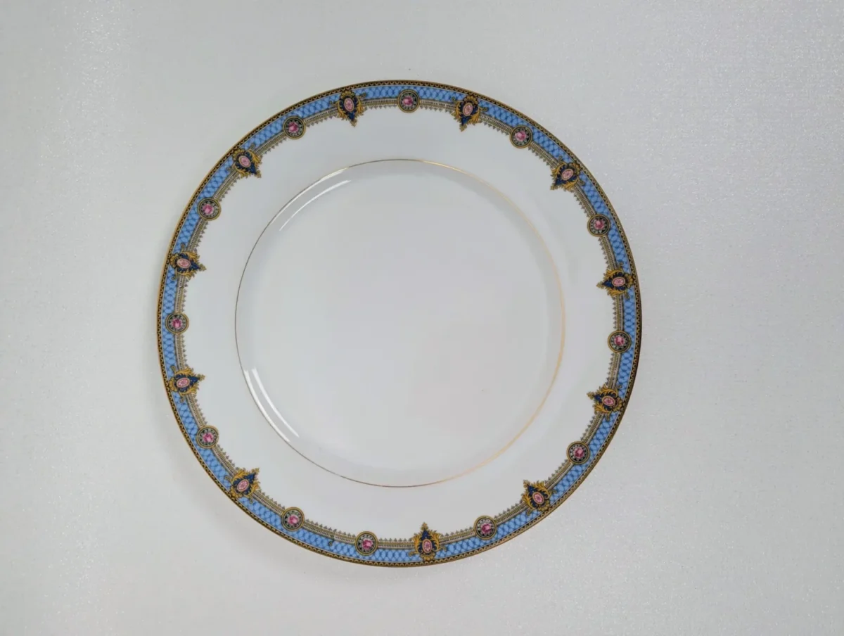 Ce service de 10 assiettes plates en porcelaine de Limoges, signé Robert Picard France, incarne l’élégance intemporelle de l’art de la table français. Chaque assiette est une pièce unique, délicatement ornée de motifs floraux d’inspiration classique, dans une harmonie subtile de bleu, de rose et de doré. Une brillance éclatante vient sublimer l’ensemble et reflète avec grâce la lumière naturelle ou celle de vos bougies.