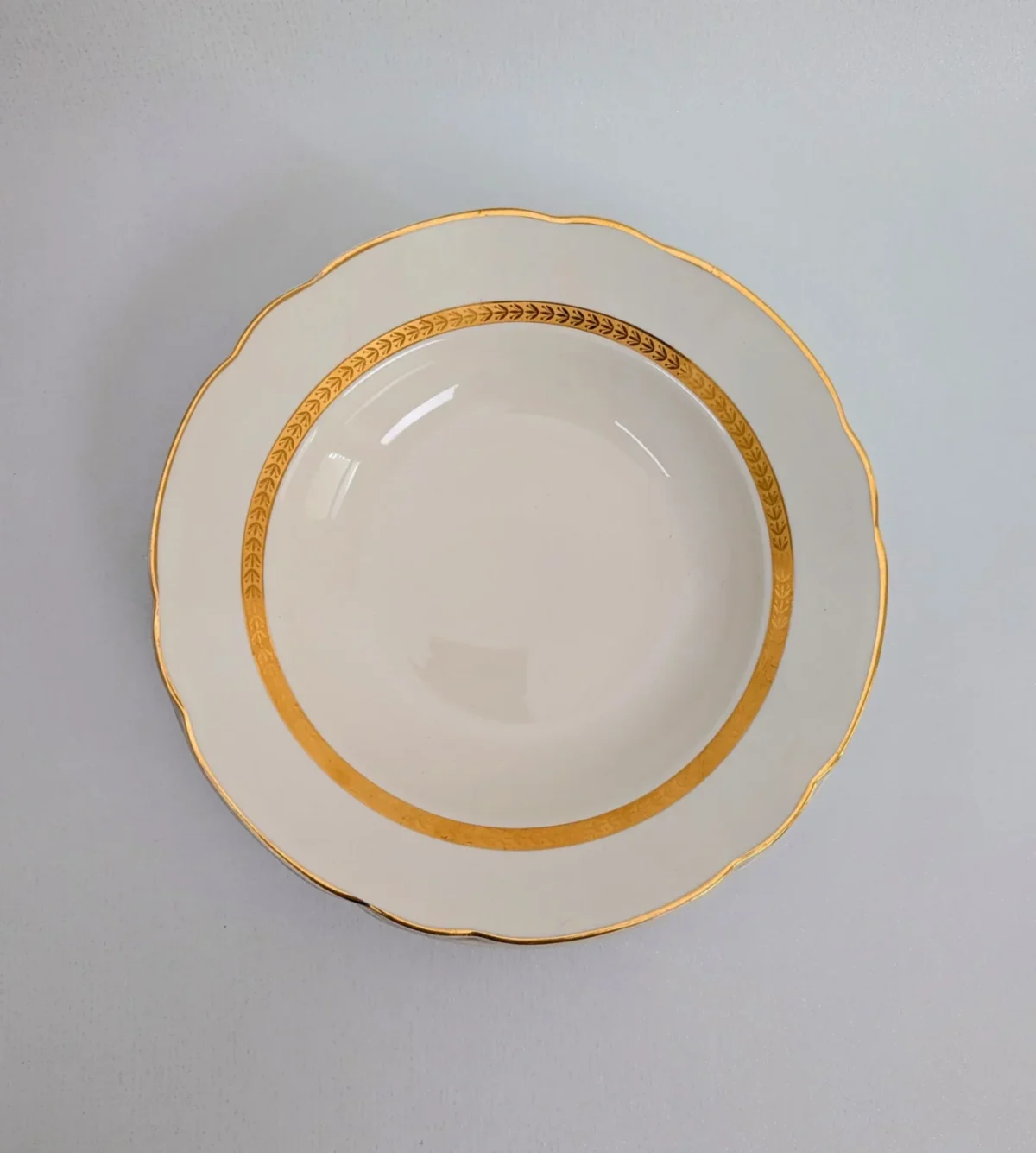 Non seulement chaque assiette est rehaussée de deux liserés dorés, mais en plus, l’un d’eux est orné de fins motifs feuillagés. Ainsi, le premier filet encadre subtilement l’assiette, tandis que le second attire le regard par sa richesse décorative. Par conséquent, ces détails confèrent à l’ensemble une élégance discrète et intemporelle.
