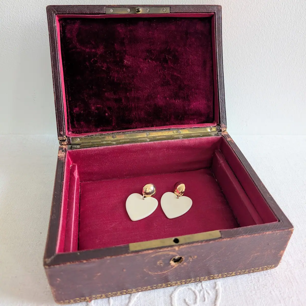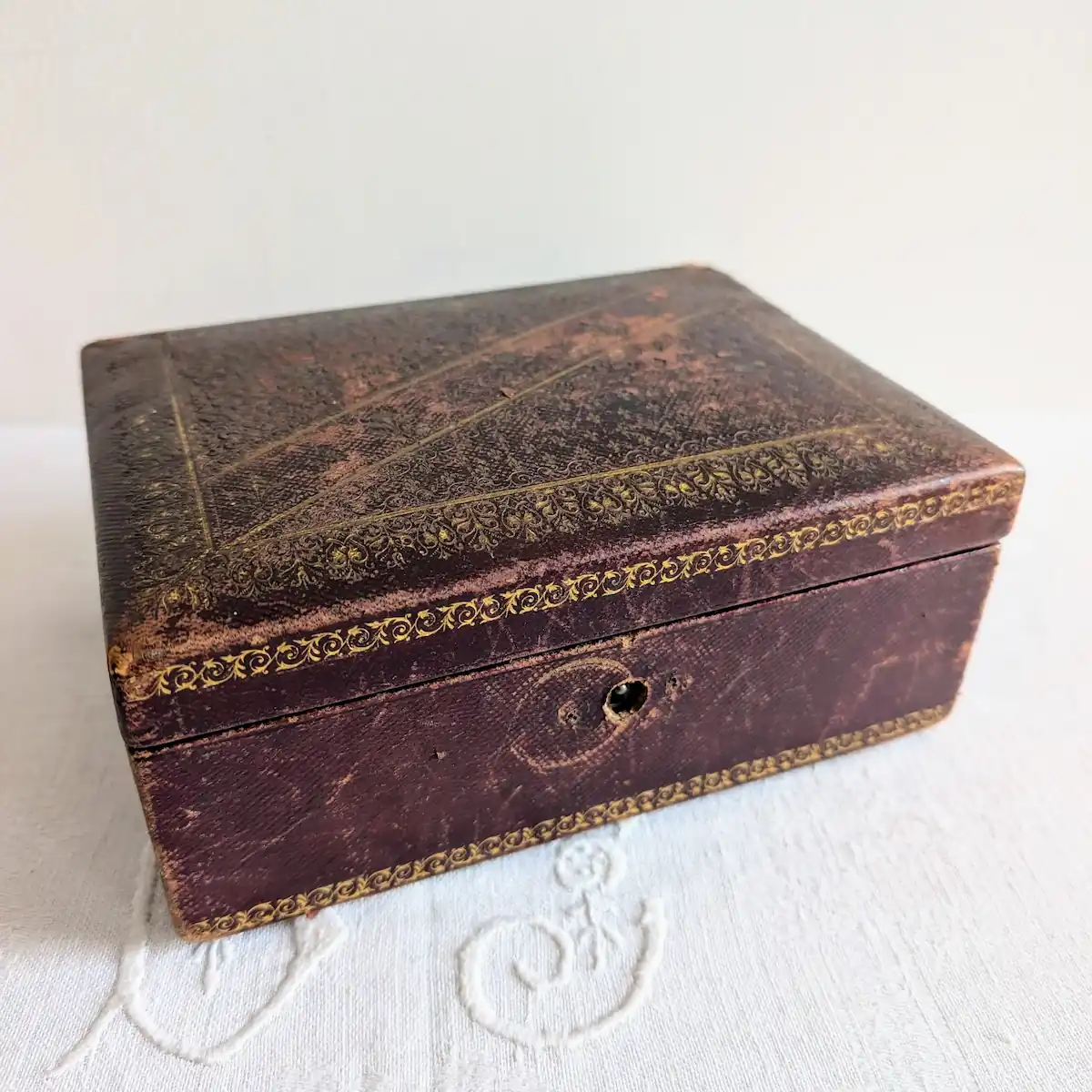 Boîte à bijoux en cuir ancienne gaufré et velours bordeaux XIXe siècle