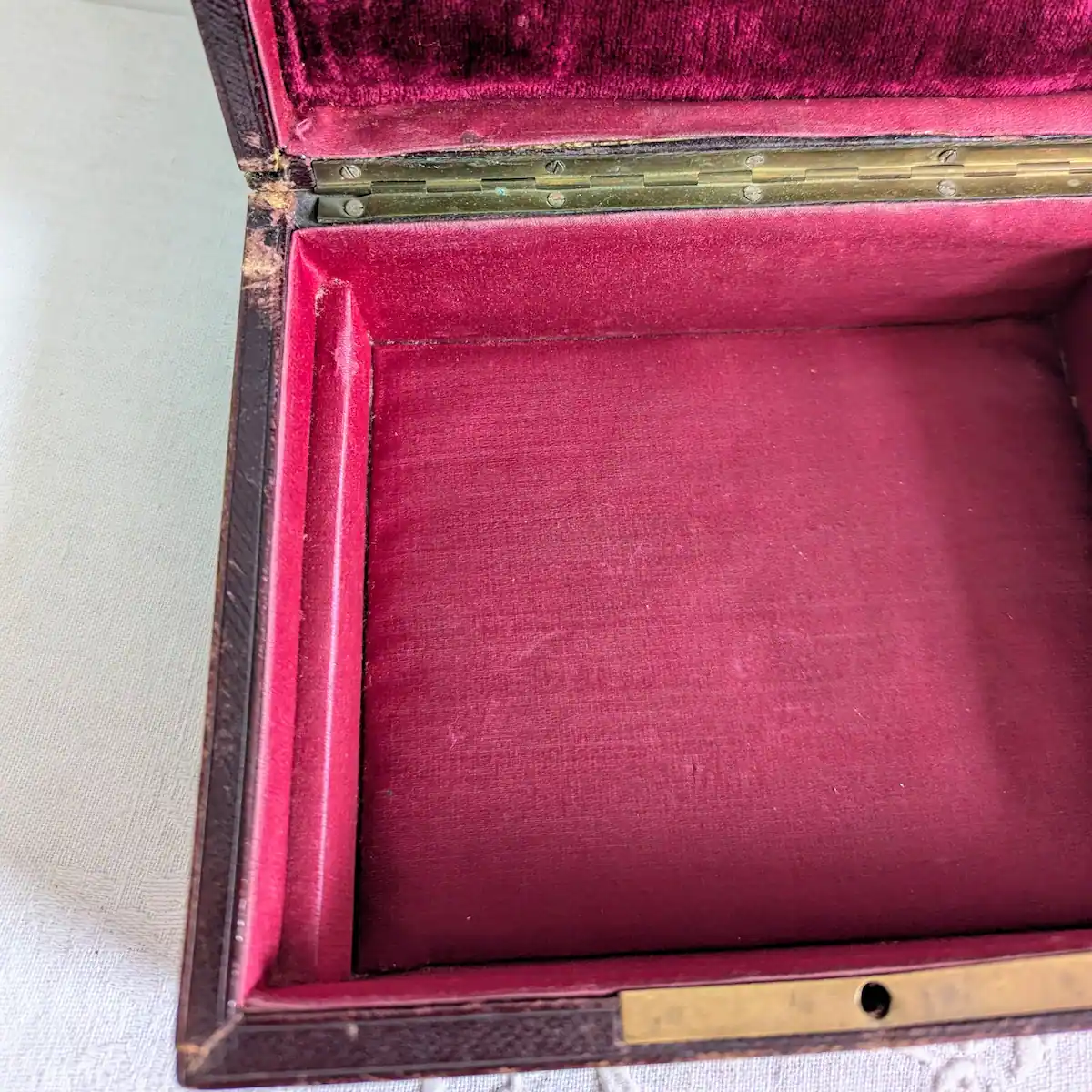 Le velours bordeaux à l’intérieur de cette boîte à bijoux en cuir a conservé son éclat. Cet intérieur textile servait de protection douce pour des objets fragiles comme des bijoux en or. C’est cette dualité entre la résistance du cuir et la tendresse du textile qui fait toute la valeur de ces antiquités domestiques.