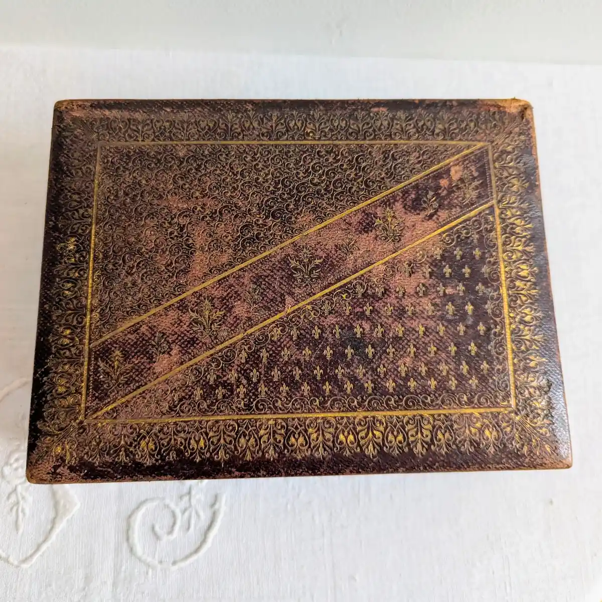 L’authenticité se confirme par plusieurs indices : la charnière en laiton fixée par de petites vis d’époque, la nature du velours intérieur et surtout la technique de gaufrage du cuir, très spécifique au XIXe siècle.