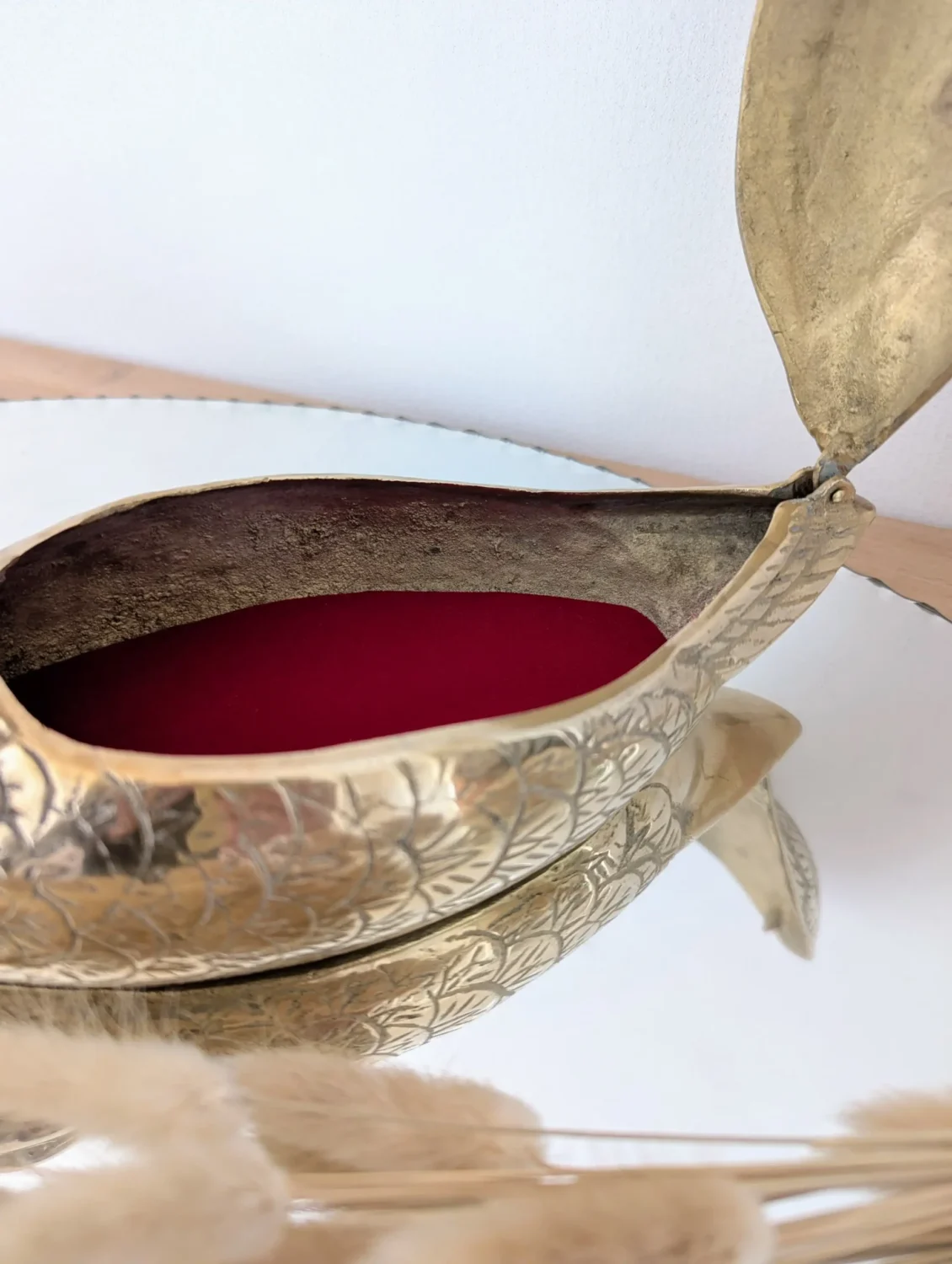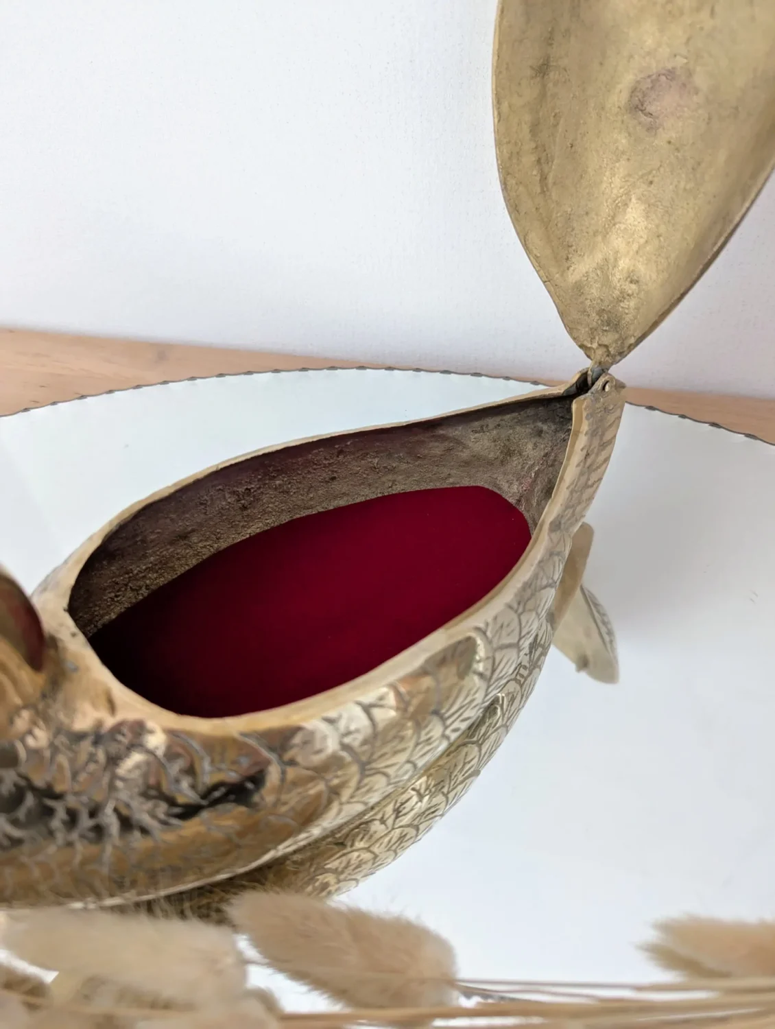 Cette boîte canard en laiton vintage est un véritable objet coup de cœur. Sa silhouette douce et travaillée lui confère une présence pleine de poésie. Les ciselures qui marquent les plumes sont finement exécutées, évoquant un savoir-faire artisanal ancien.