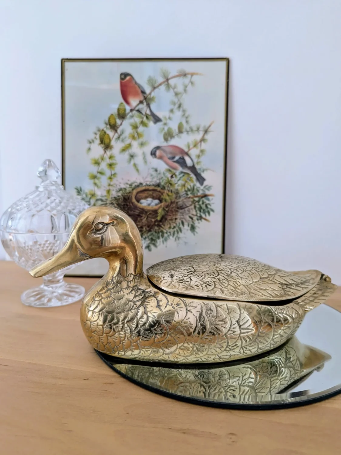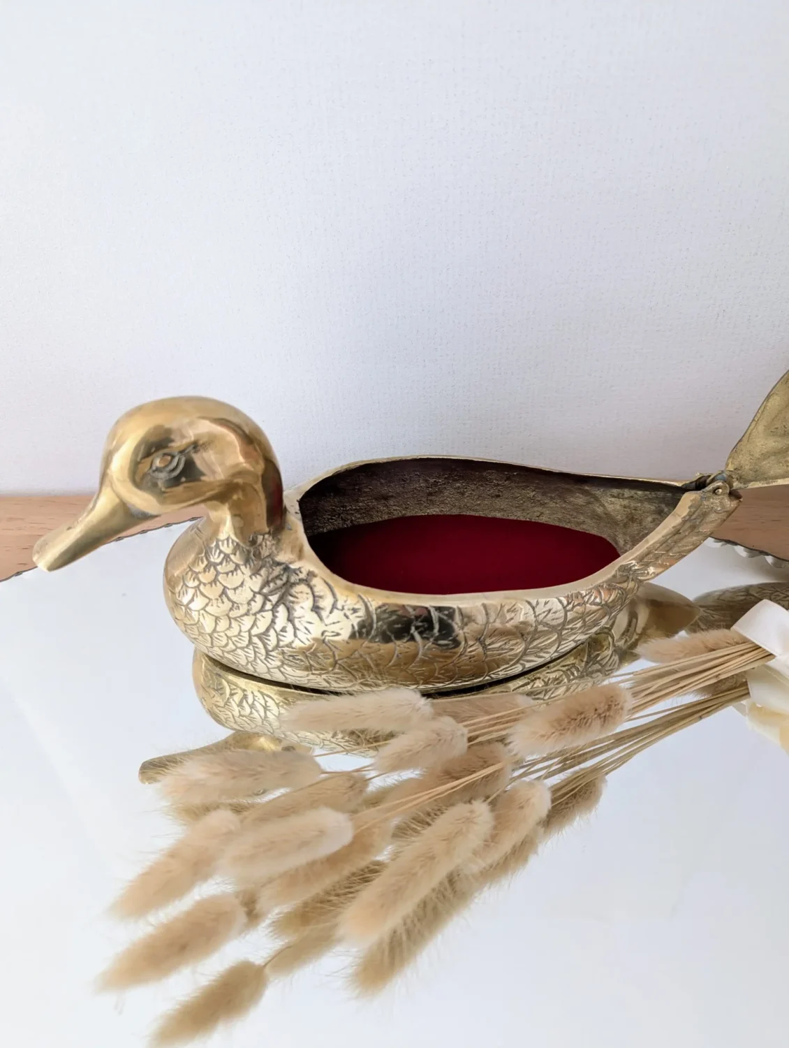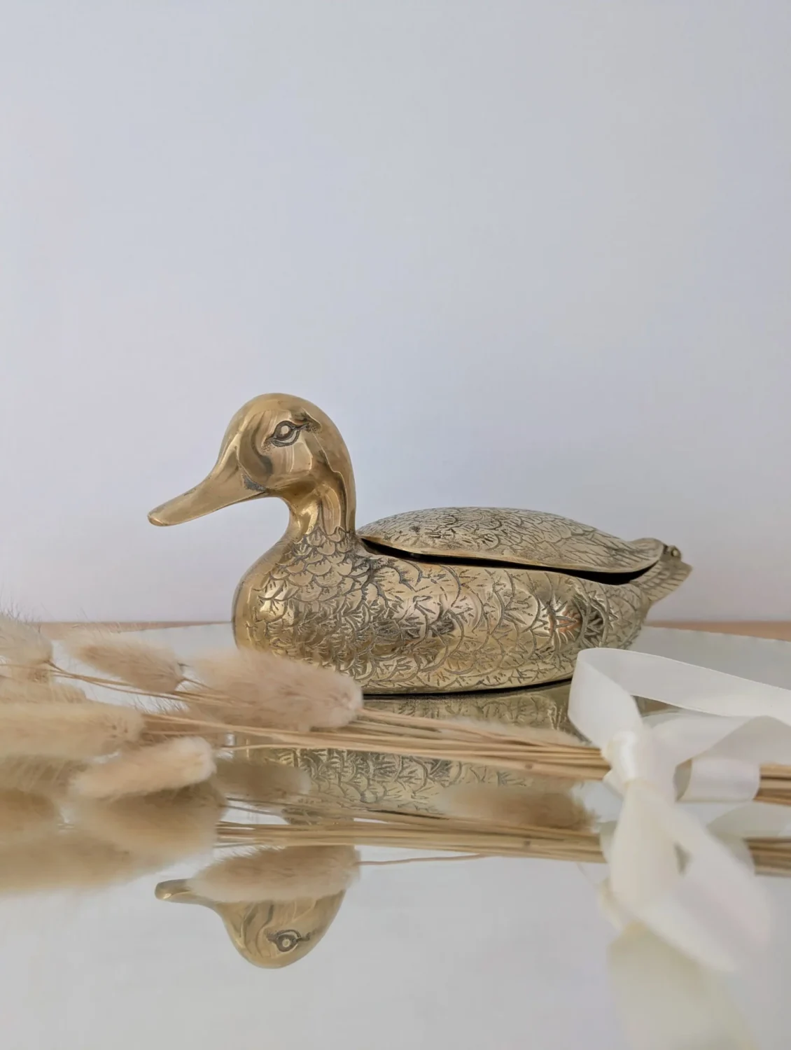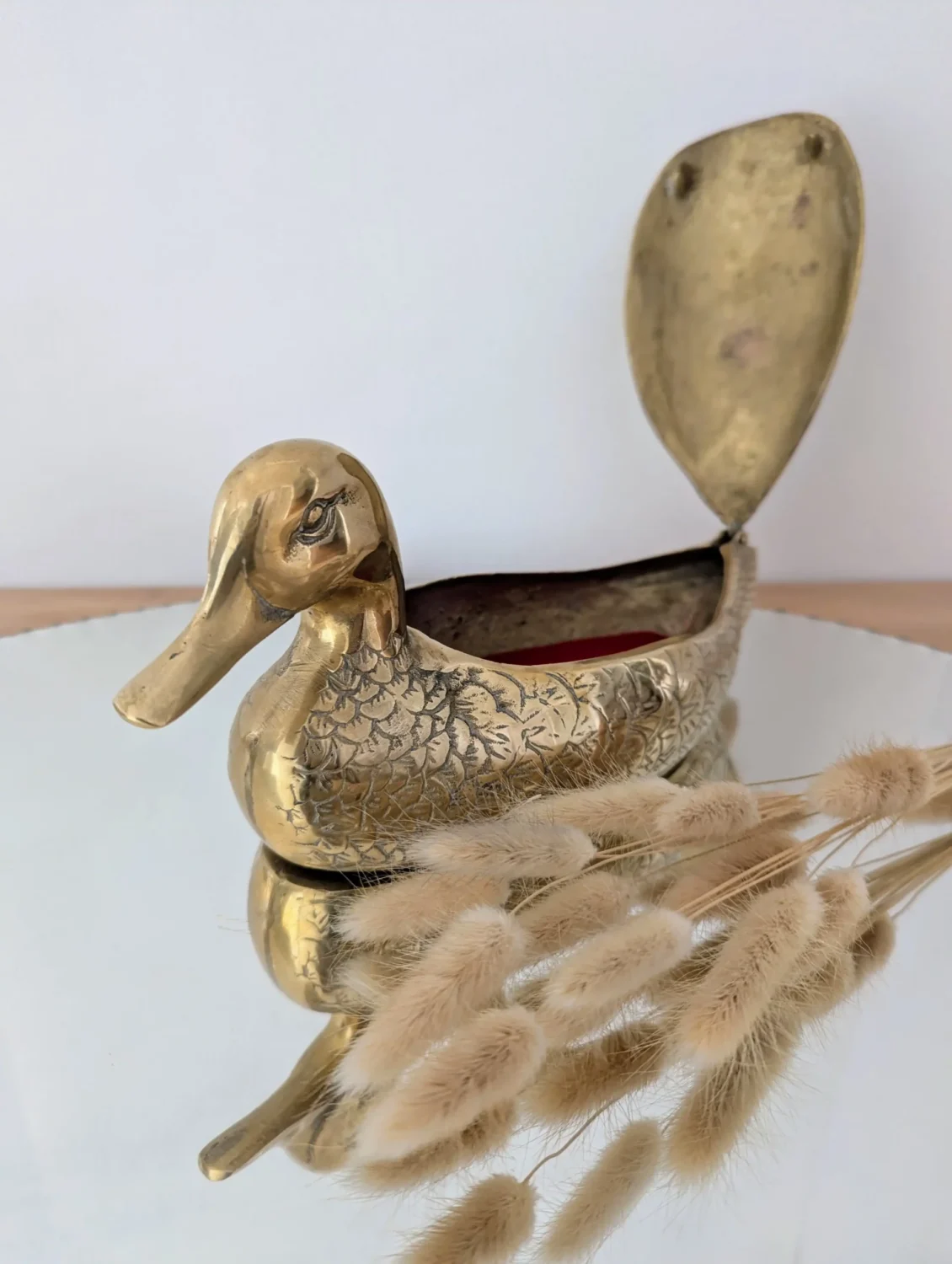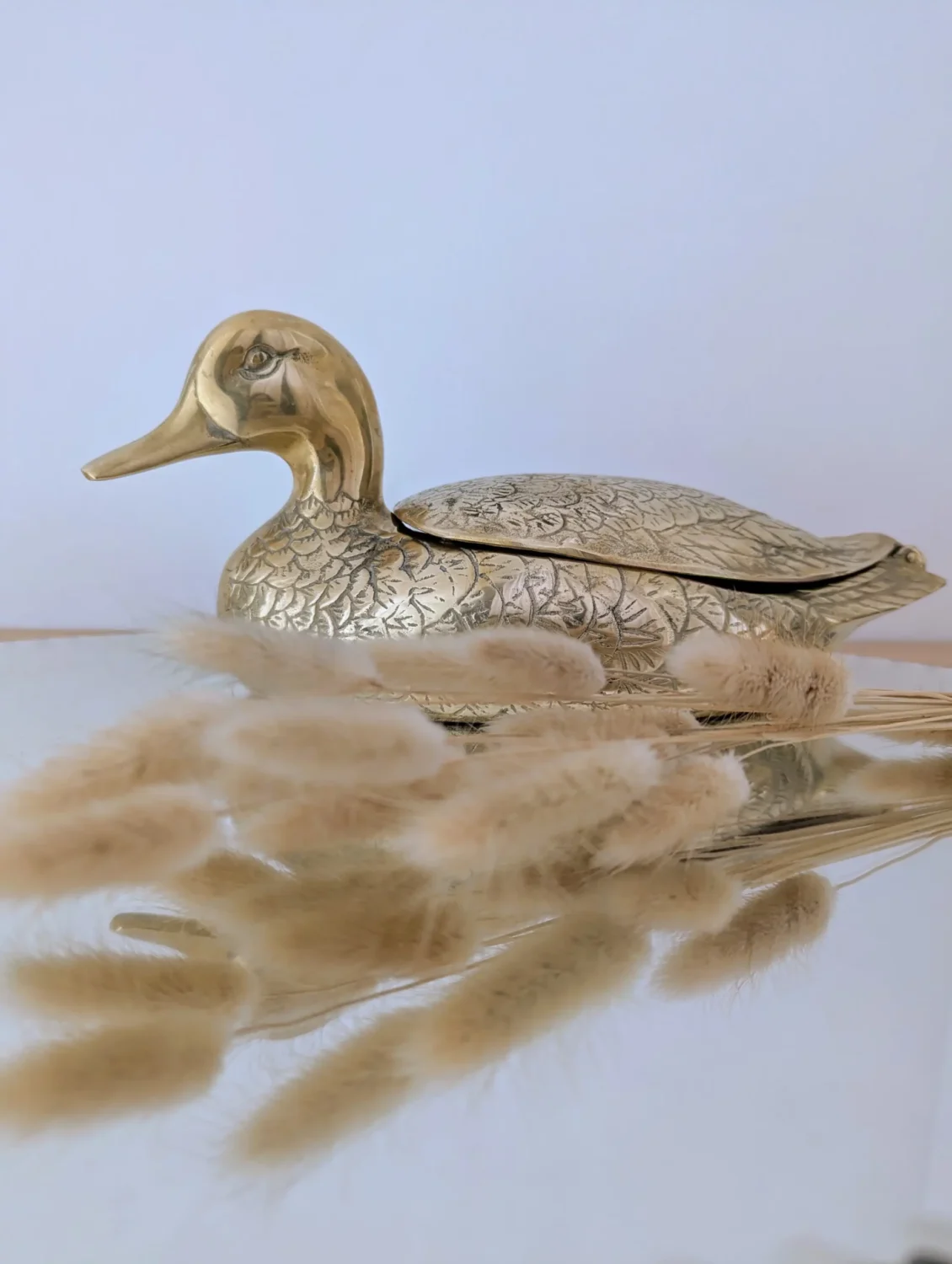 Ajoutez une touche vintage élégante à votre décoration avec cette boîte canard en laiton doré. Une pièce unique à la fois utile et décorative.