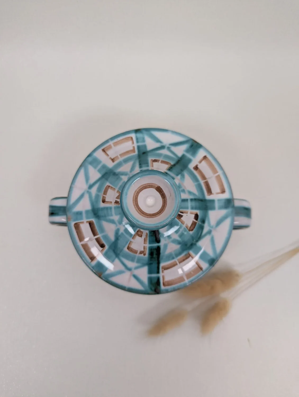Apportez une note d’art vintage français à votre intérieur avec cette bonbonnière en céramique émaillée signée Robert Picault, figure emblématique de la grande époque de Vallauris. Artiste complet, Picault marie avec brio fonction utilitaire et esthétique graphique dans ses créations.