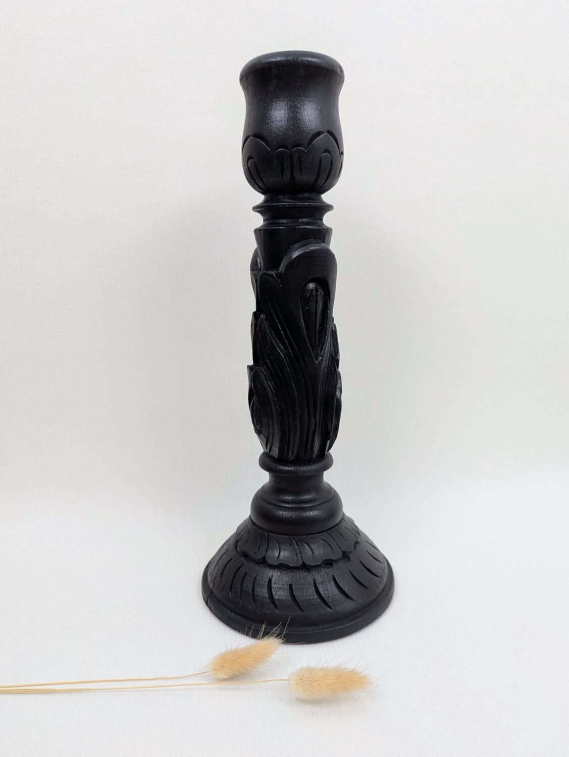 Ce grand bougeoir en bois sculpté se distingue par sa silhouette travaillée et sa finition profonde. Peint en noir mat et soigneusement verni, il attire immédiatement le regard. Son style affirmé, à la fois sobre et raffiné, s’adapte à toutes les ambiances. Il habille aussi bien une console ancienne qu’une étagère contemporaine.