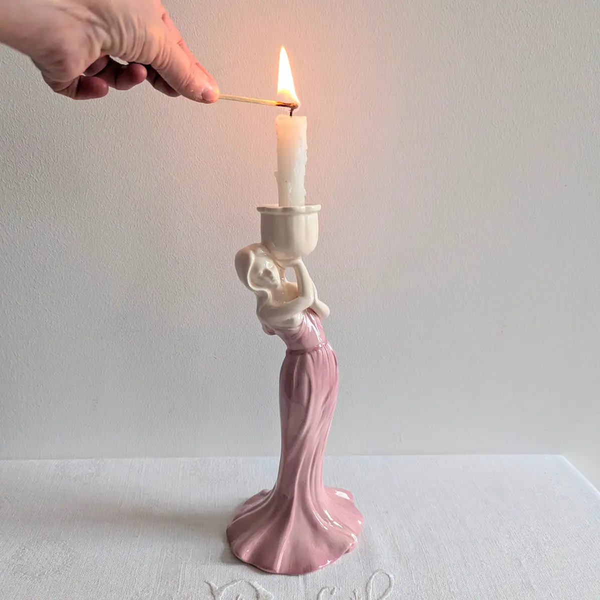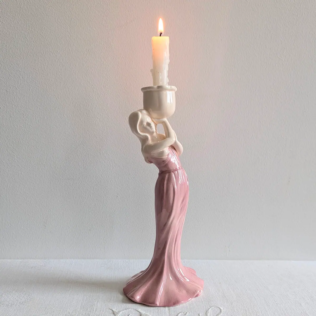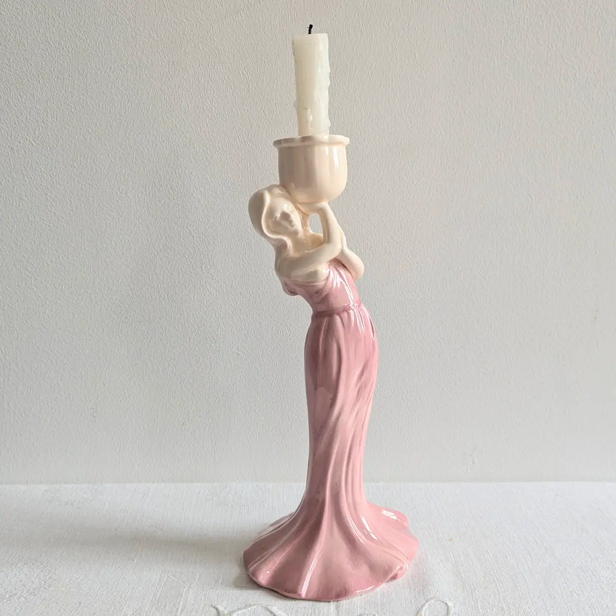 Bougeoir vintage céramique rose silhouette féminine Art Nouveau