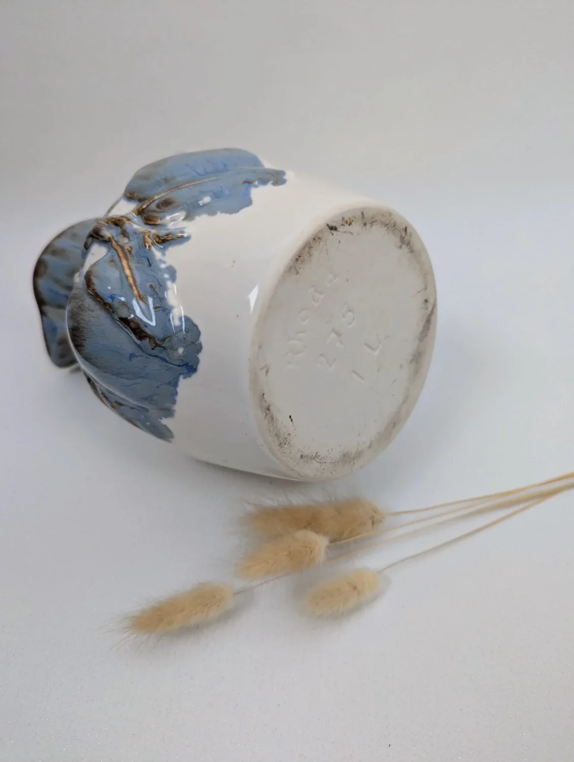La finition « nuage » crée un subtil dégradé de bleu, de gris et de reflets bruns, accentuant les volumes de la pièce et valorisant les motifs en relief représentant des fruits. Chaque détail témoigne d’un savoir-faire traditionnel, propre à la céramique de caractère.
