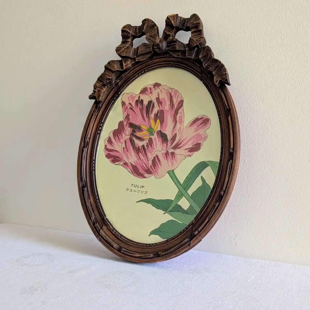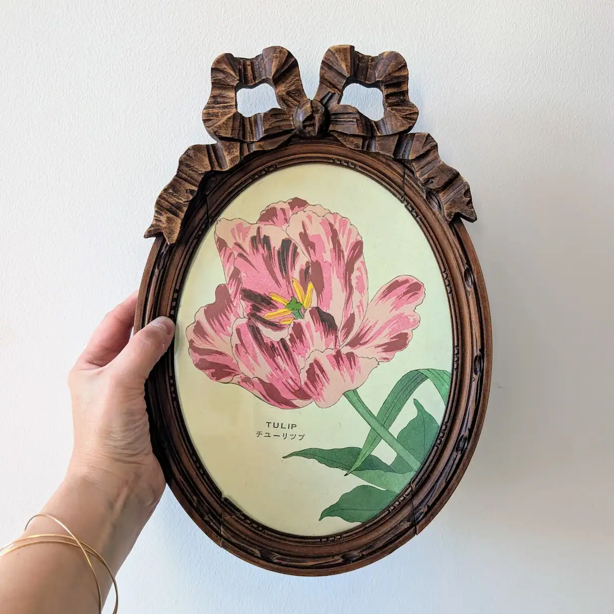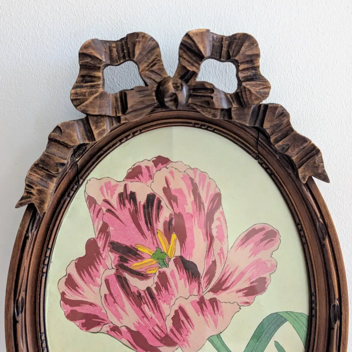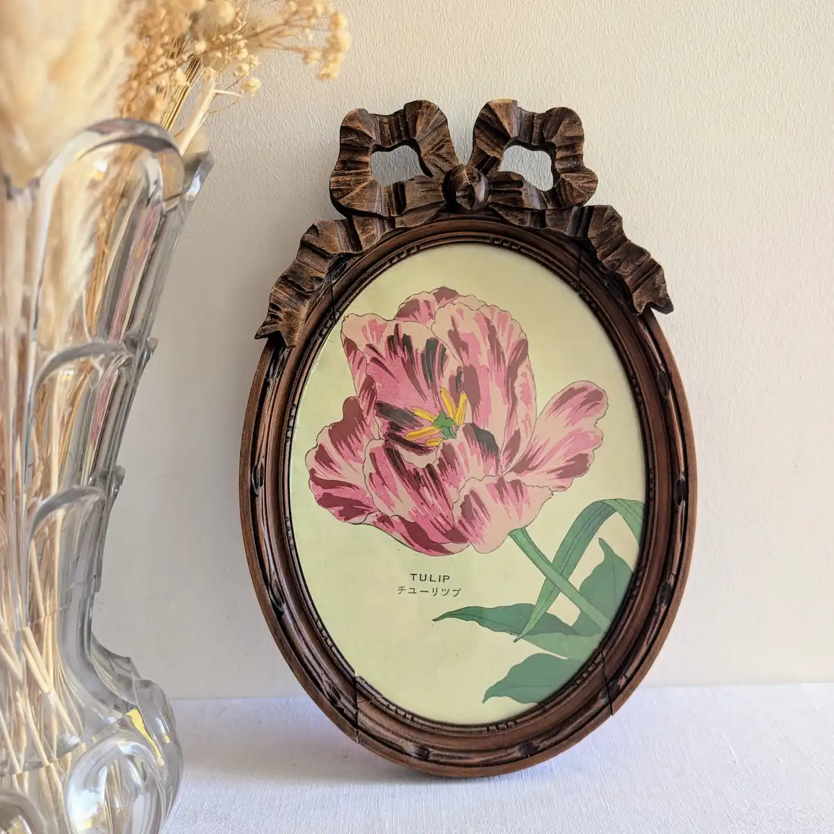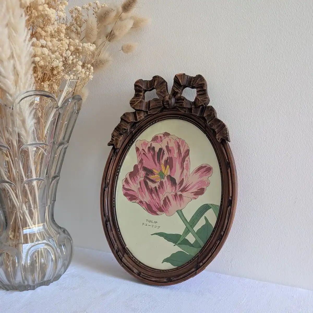 Ce cadre ancien bois sculpté semble avoir traversé les décennies en conservant cette dignité silencieuse propre aux beaux objets de famille. En le tenant entre les mains, on perçoit immédiatement la densité de la matière et la précision du travail de restauration effectué dans notre atelier. Le nœud complexe qui couronne l’ovale est une signature esthétique forte, typique du goût classique. L’illustration « Japonica », avec ses nuances de rose poudré, crée un contraste saisissant et moderne avec la rigueur du cadre. C’est une pièce qui n’impose rien mais qui transforme immédiatement l’atmosphère d’une pièce par sa simple présence, une véritable pépite de notre déco murale et arts graphiques.