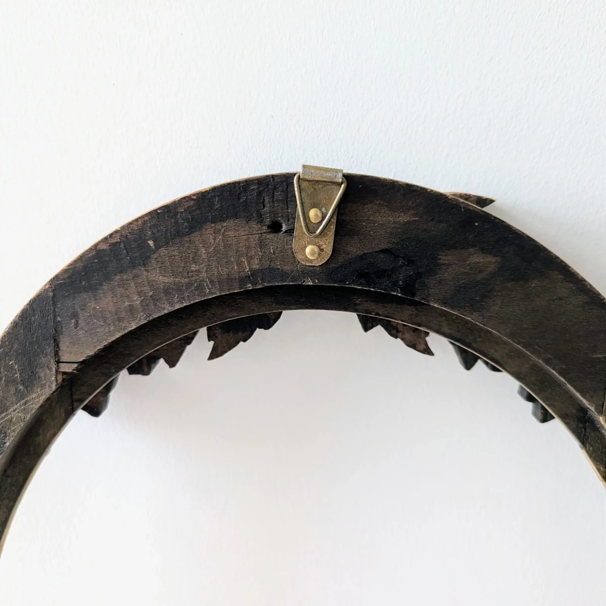 Ce cadre ovale attire immédiatement l’œil par la générosité de ses sculptures florales qui semblent s’enrouler avec souplesse autour de la structure en bois de tilleul. En le tenant entre les mains, on perçoit les traces légères laissées par le temps sur sa patine sombre, un témoignage silencieux de son passé durant l’entre-deux-guerres. C’est précisément ce relief irrégulier et ces nuances de brun profond qui font de ce déco murale & arts graphiques une pièce singulière. On sent ici le travail de l’artisan sur une essence de bois tendre et noble, offrant ainsi des objets anciens qui racontent une véritable histoire. Cette pièce unique, dénichée pour Villa Brieg, possède cette imperfection sublime qui donne du relief à un mur nu.