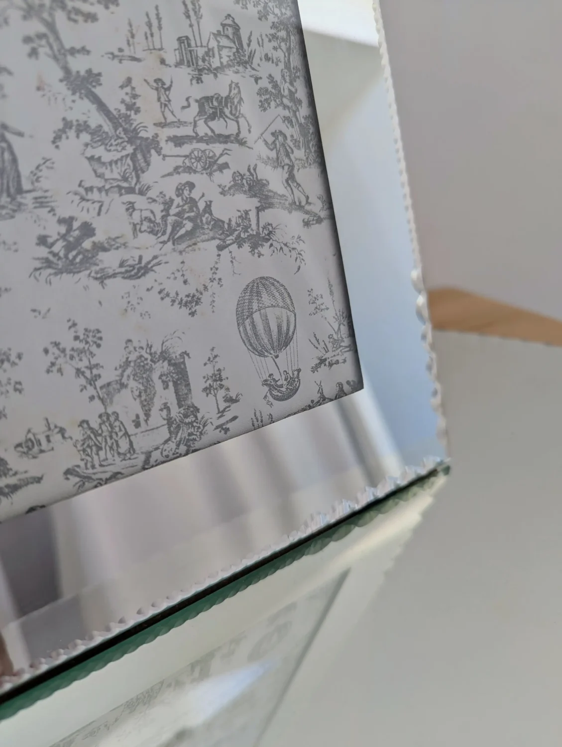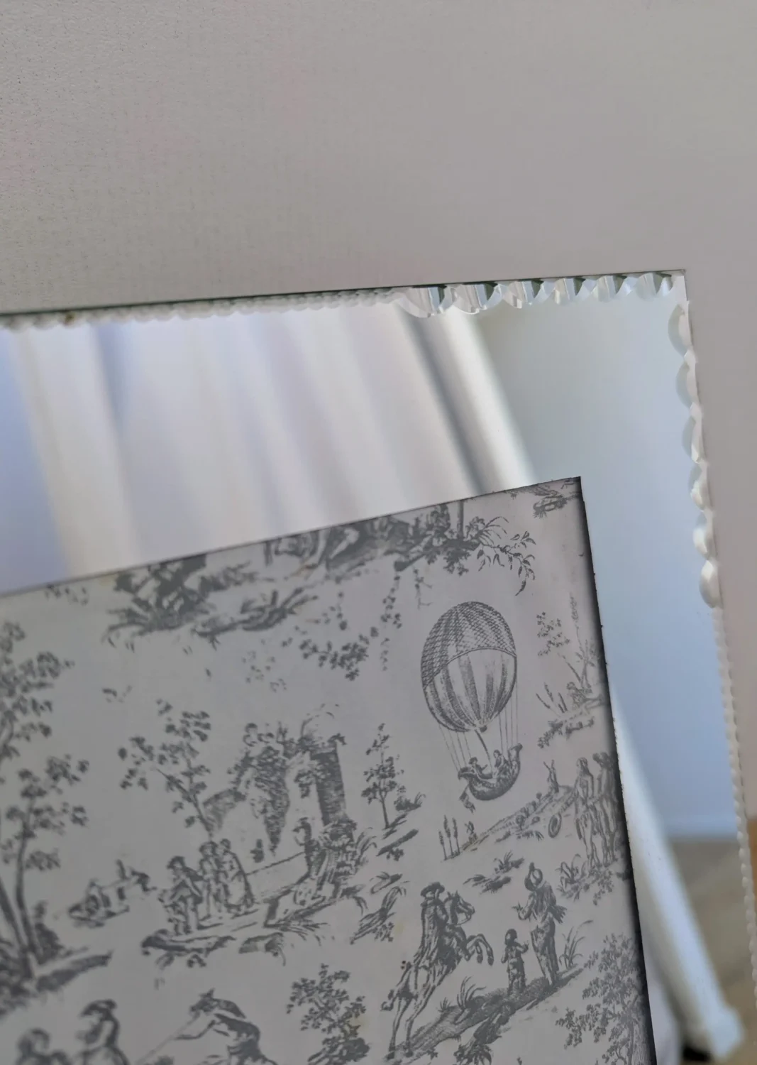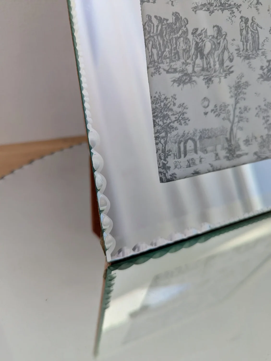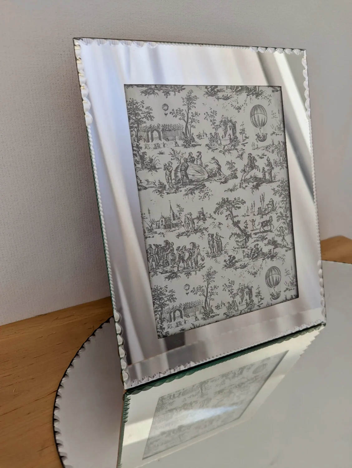 Avant tout, ce magnifique cadre photo ancien en miroir taillé, au format 30 x 24 cm, conjugue raffinement, délicatesse et lumière. De plus, son pourtour en miroir biseauté, finement découpé sur les bords, reflète avec subtilité la lumière ambiante et attire le regard sans jamais voler la vedette à ce qu’il encadre.