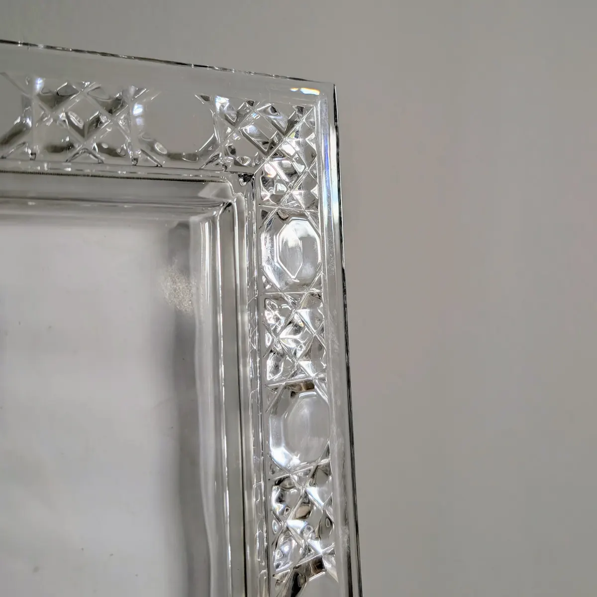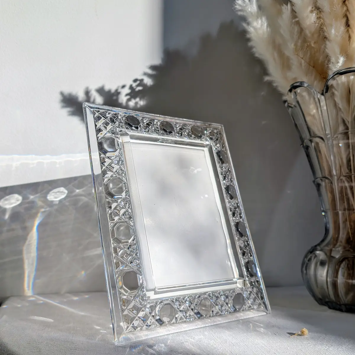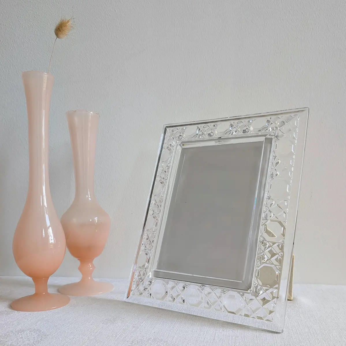 Pourquoi ces motifs étaient-ils si populaires ? Dans les années 60 et 70, la décoration ancienne s’émancipait de l’ornementation florale pour se tourner vers l’abstraction et la géométrie. Ce style, qui puise ses racines dans le mouvement Art Déco, cherchait à magnifier la matière brute par la répétition de formes mathématiques. Ce cadre photo ancien en verre pressé est l’exemple parfait de cette transition : il conserve le prestige visuel du cristal taillé tout en adoptant une silhouette rectangulaire stricte et épurée. C’est une pièce unique qui raconte ce moment où l’objet du quotidien est devenu une petite sculpture domestique.