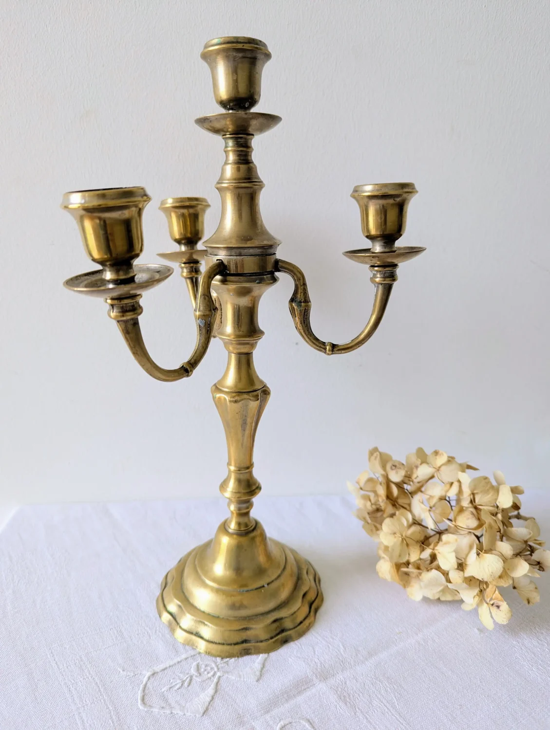 Ce chandelier vintage en laiton a été entièrement démonté et nettoyé avec soin. Le nettoyage révéle sa belle patine dorée qui raconte son histoire. Le laiton, matière noble et lumineuse, apporte de la chaleur à votre décoration. Les détails du socle et des bras témoignent de son authenticité et de son charme vintage.