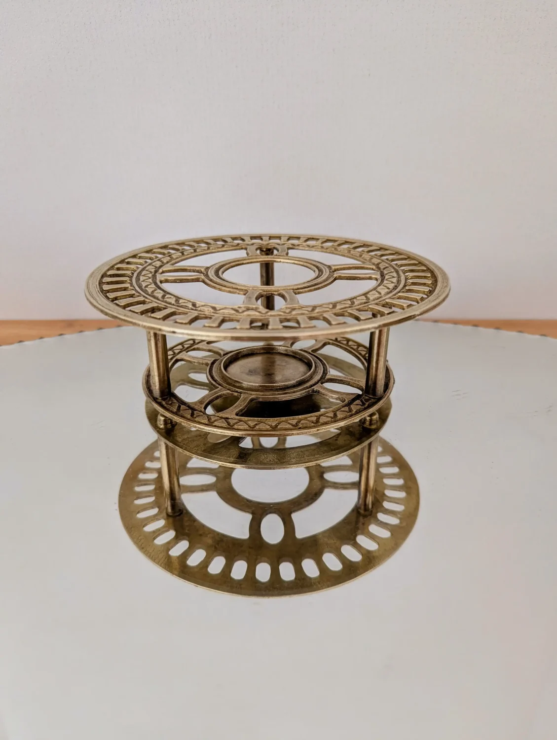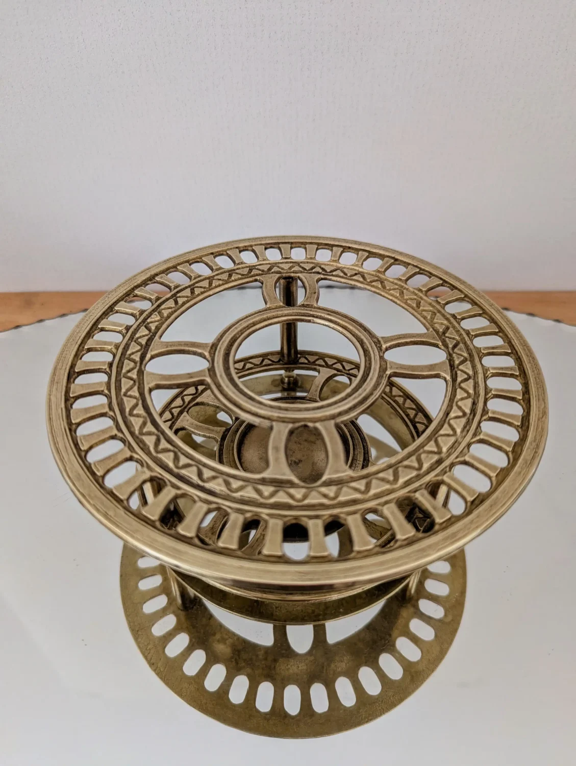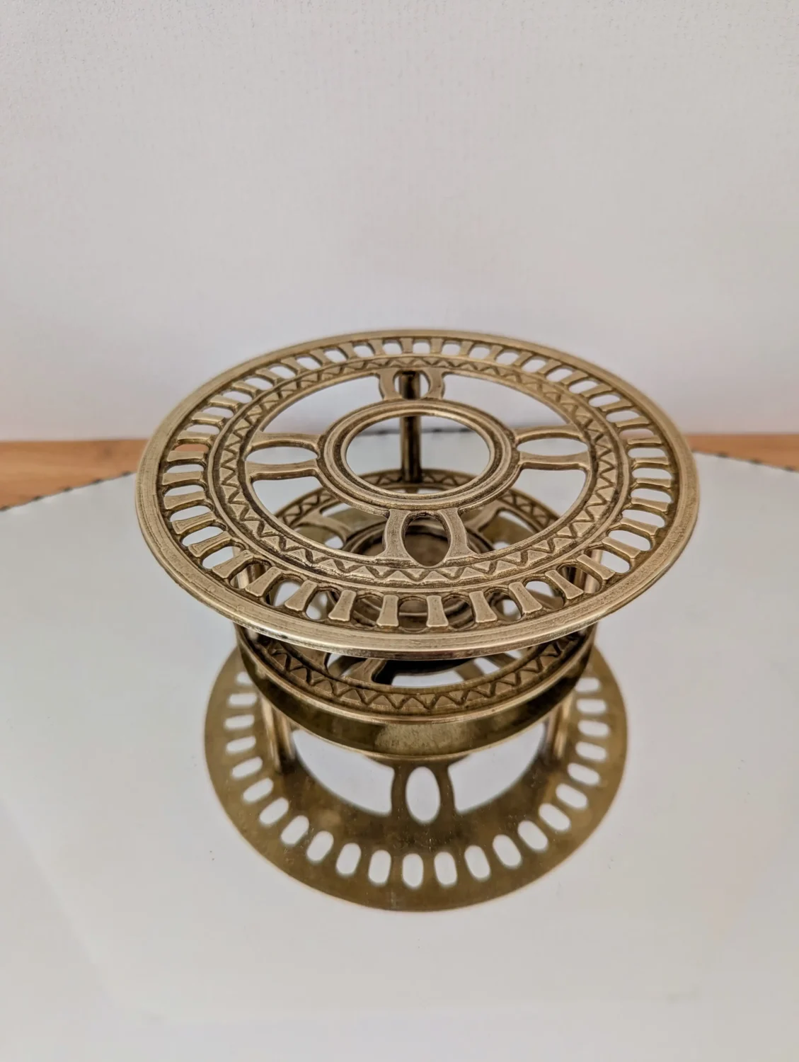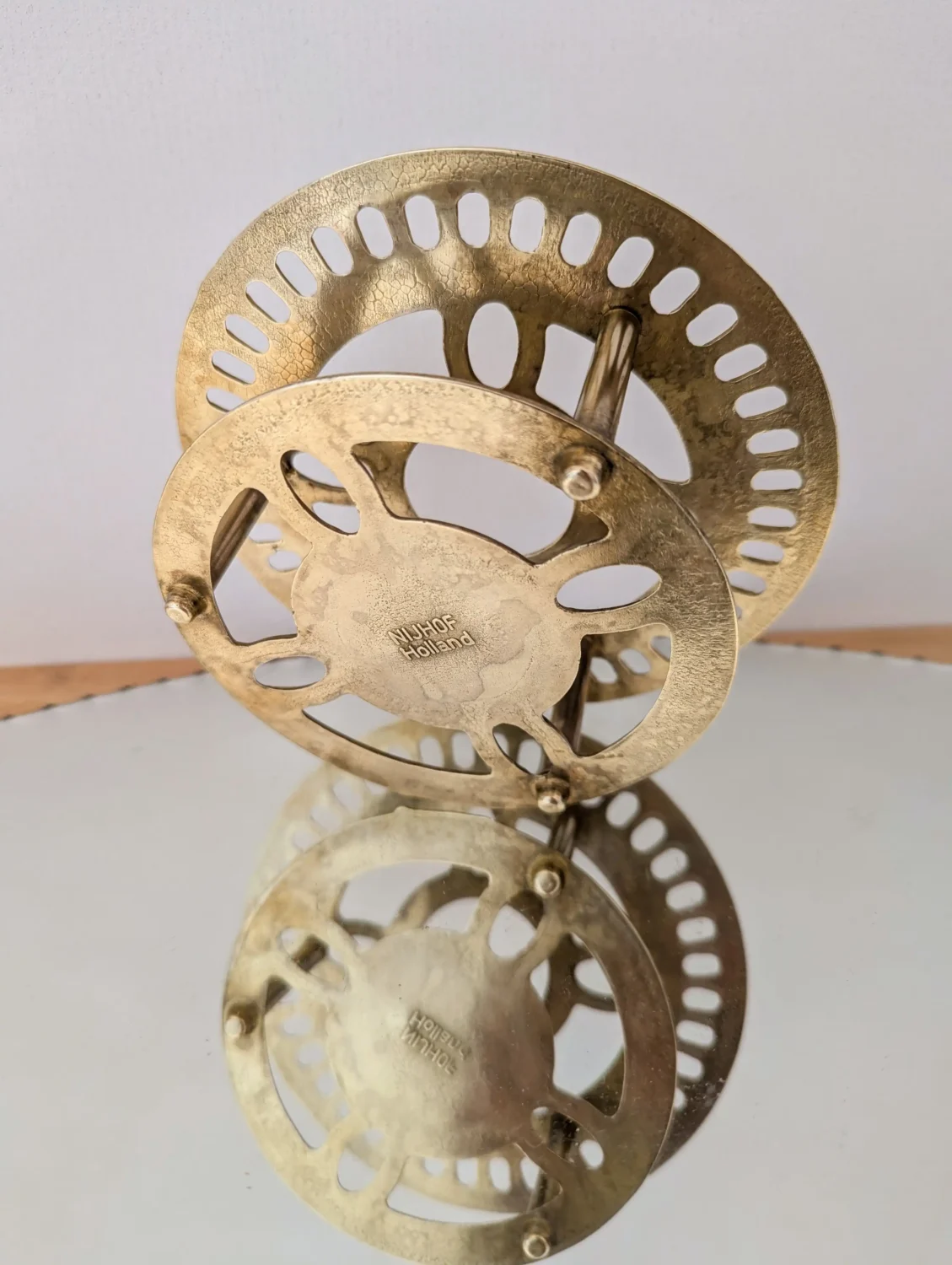 Tout d’abord, ce superbe chauffe-plat en laiton doré, signé Nijhof Holland, associe utilité et esthétisme avec brio. Ensuite, son design ajouré, ses lignes symétriques et sa finition dorée légèrement patinée en font une pièce aussi fonctionnelle que décorative.