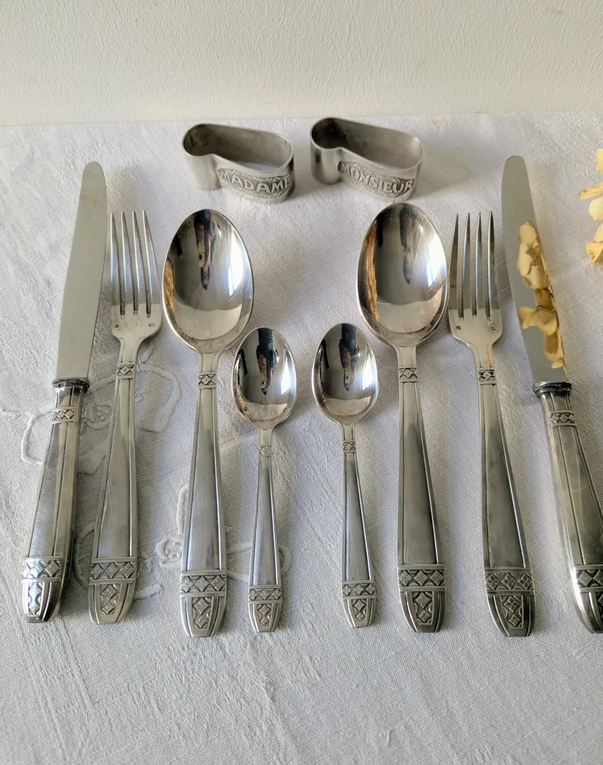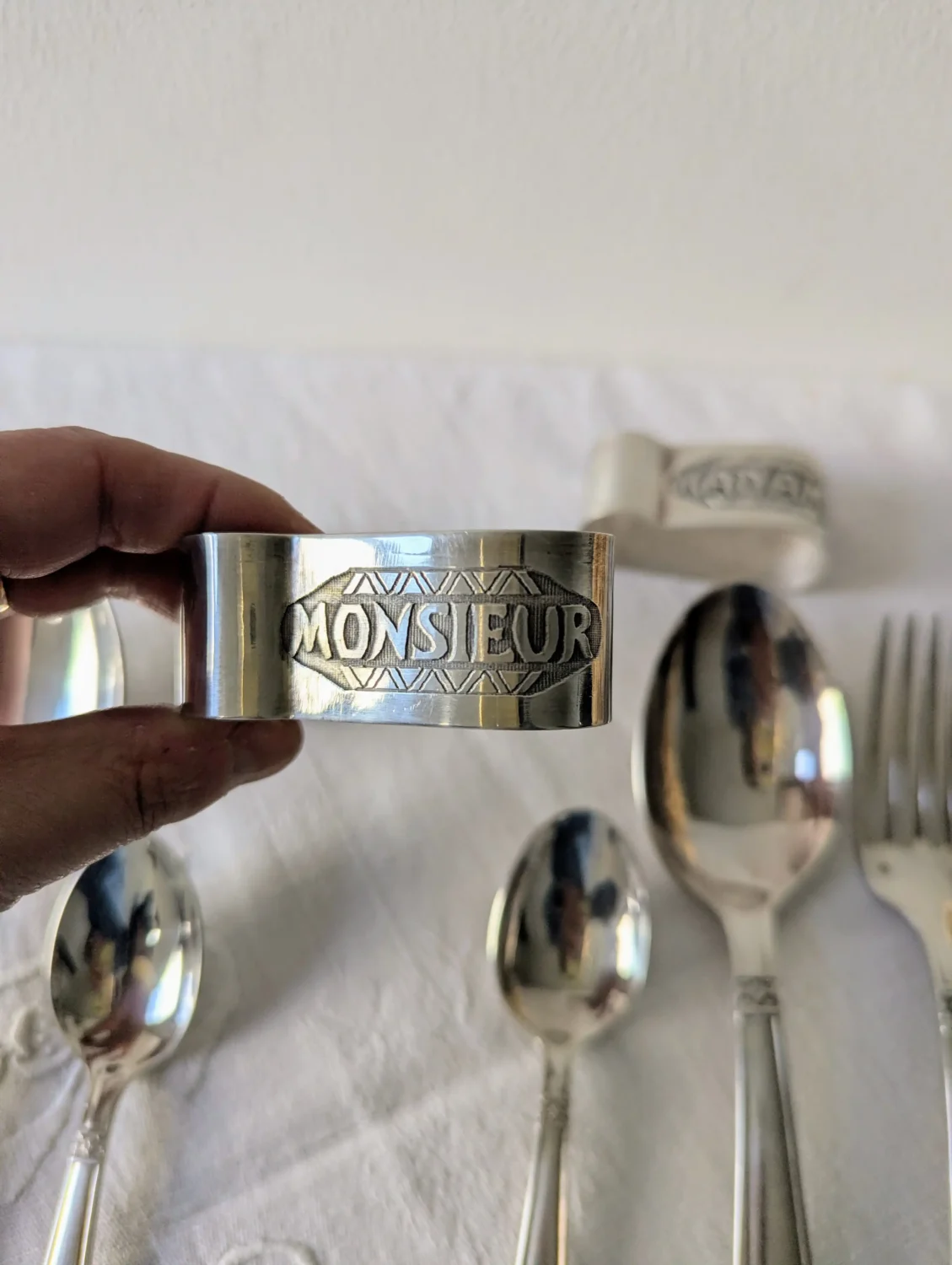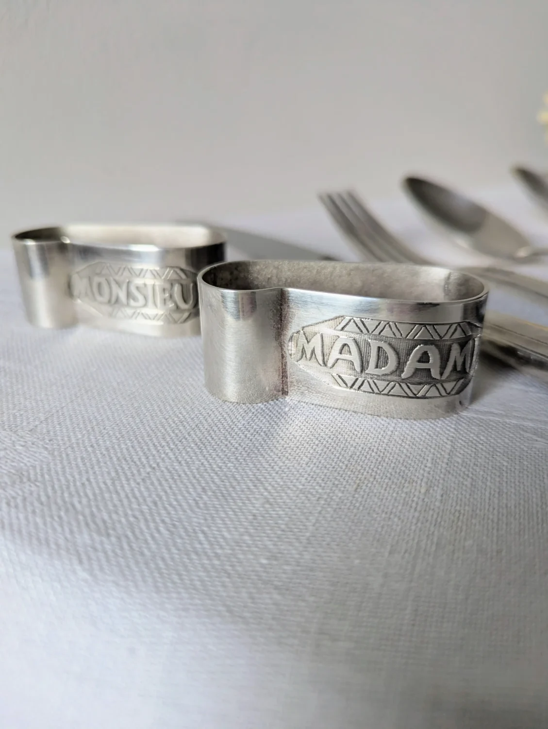 Ronds de serviette assortis gravés “Monsieur” et “Madame”, décor géométrique ciselé.