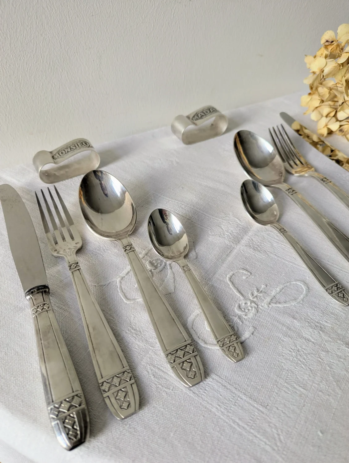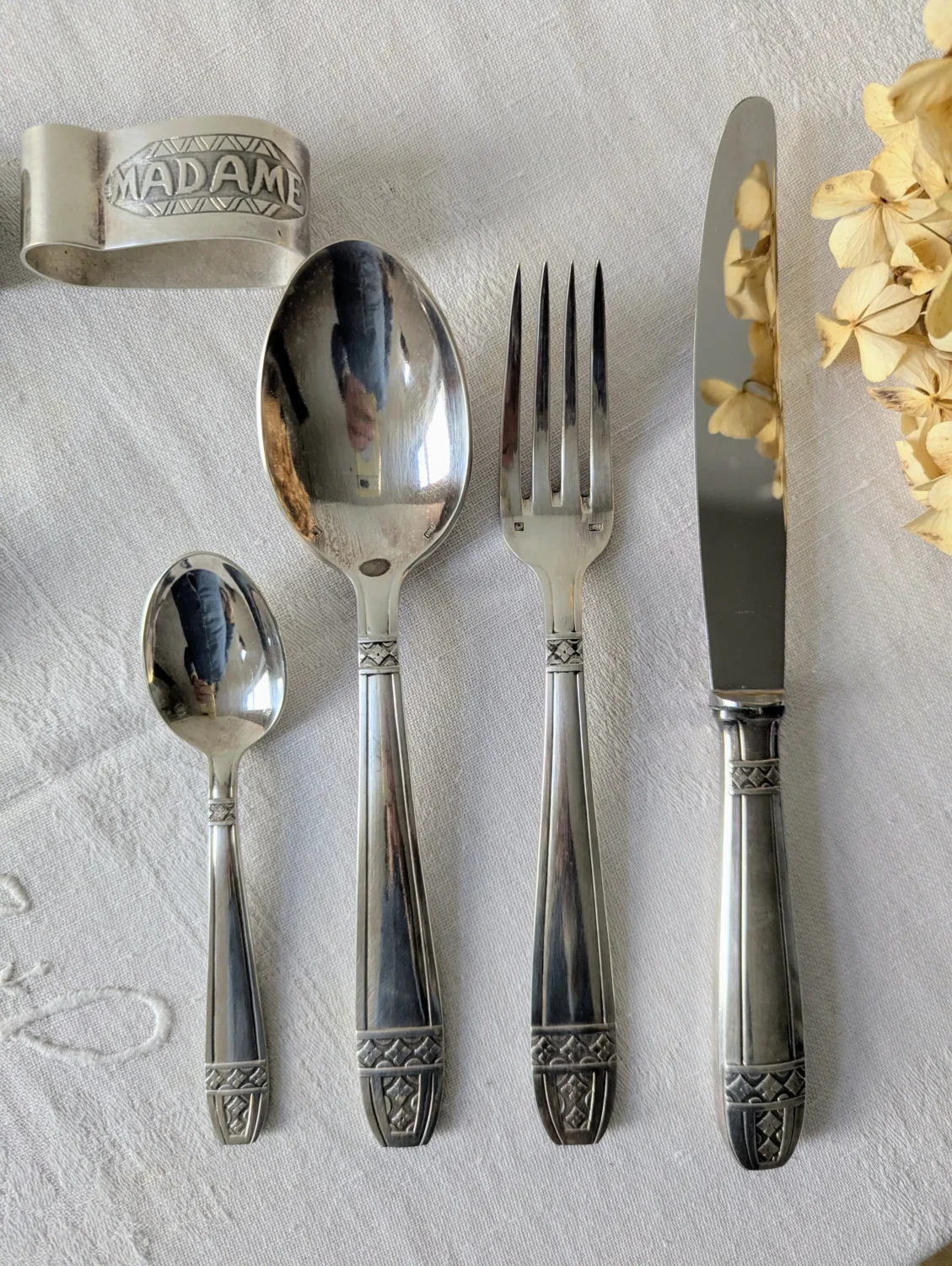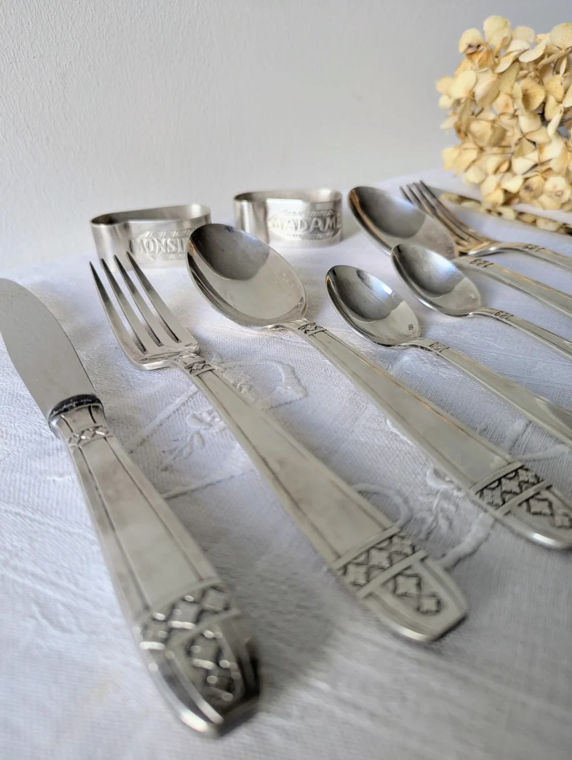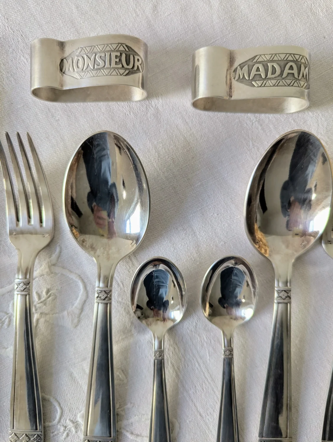 Ronds de serviette assortis gravés “Monsieur” et “Madame”, décor géométrique ciselé.
