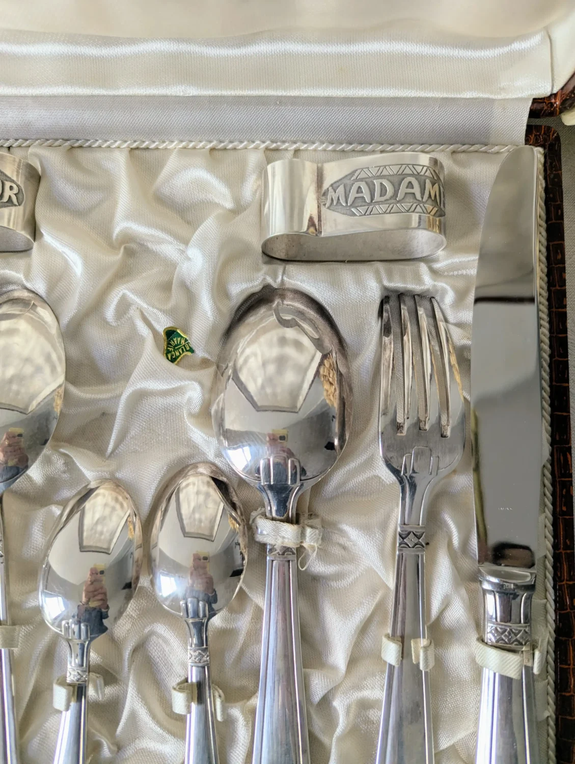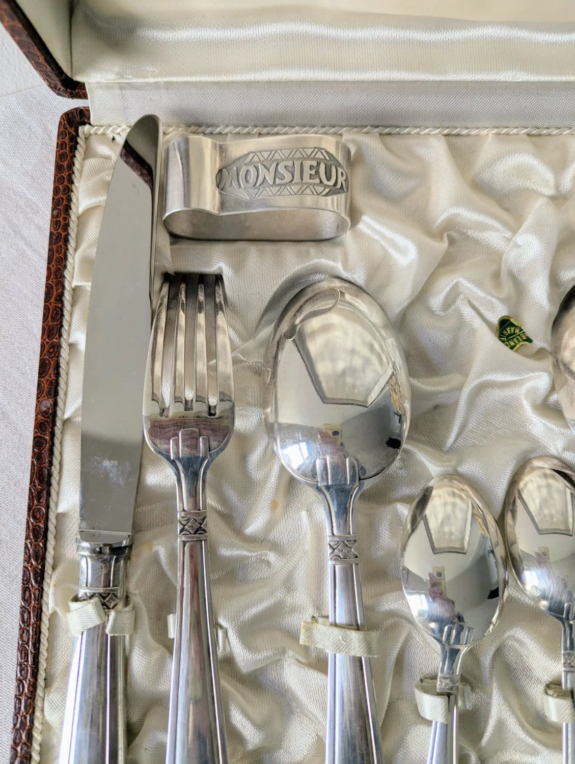 Ce coffret de couverts en métal argenté Monsieur & Madame raconte une histoire d’amour et de raffinement. Chaque pièce reflète le charme des tables d’antan : finement ciselée, soigneusement argentée, patinée par le temps. L’ensemble comprend couteaux, fourchettes et cuillères, accompagnés de deux ronds de serviette assortis gravés “Monsieur” et “Madame”. Présenté dans un coffret ancien en simili cuir brun, doublé de satin blanc, il constitue une idée cadeau parfaite pour un mariage ou un anniversaire de noces.