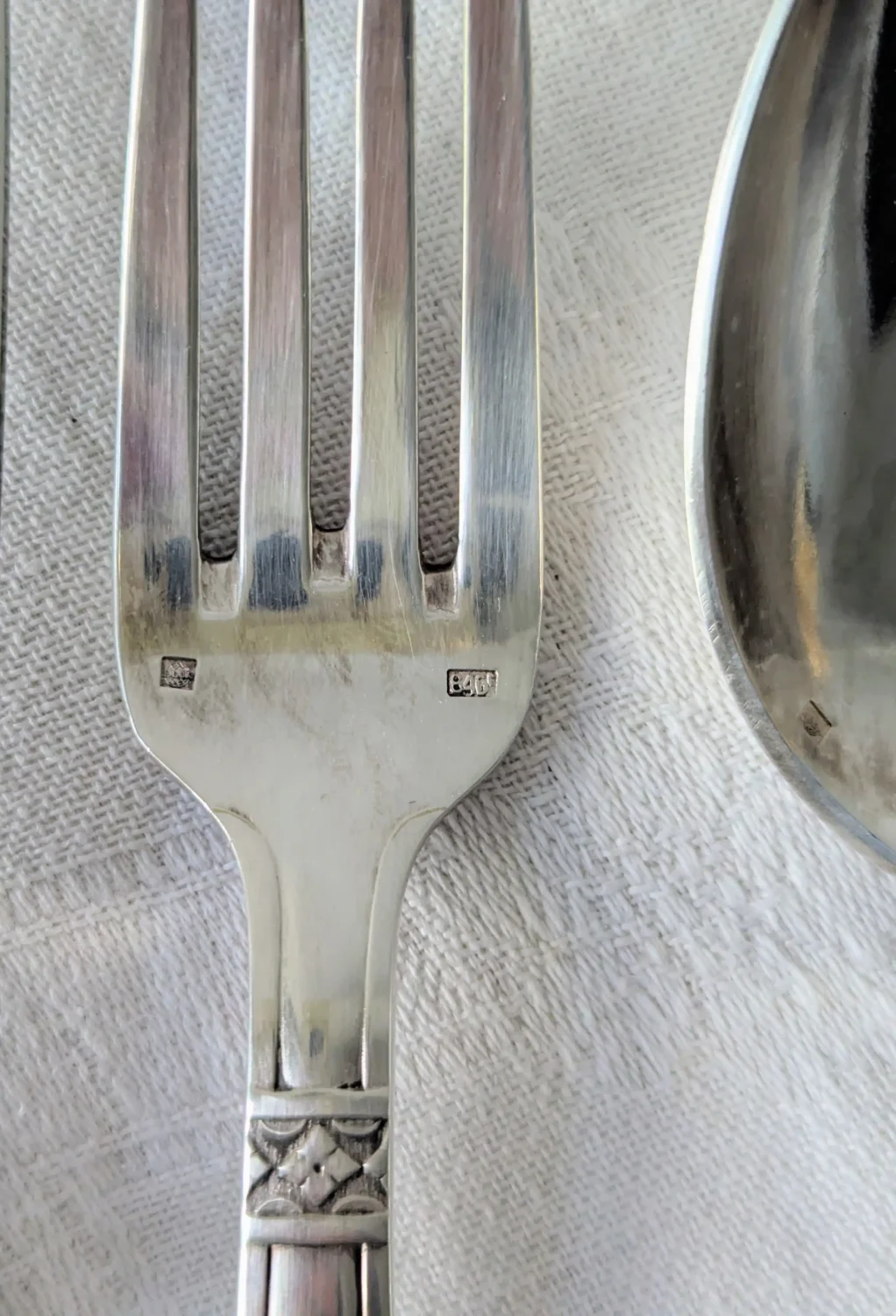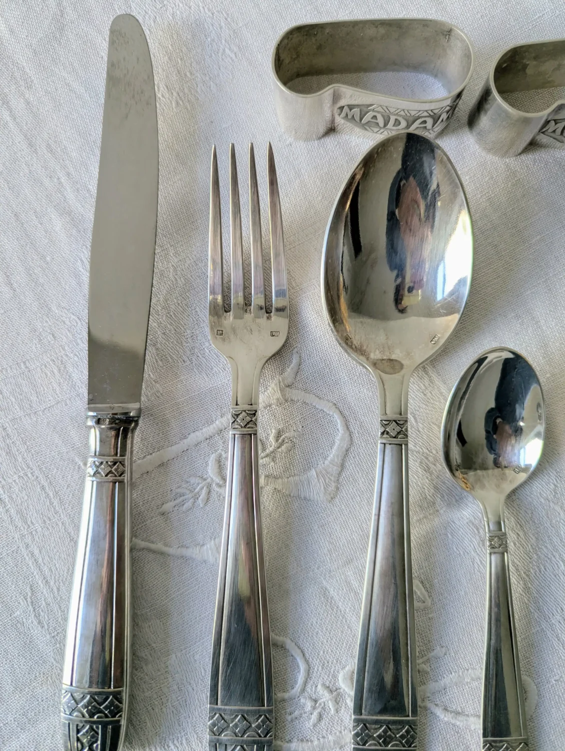 Lames en acier inoxydable, manches et couverts en métal argenté poinçonné 84 G (argenture de belle qualité).