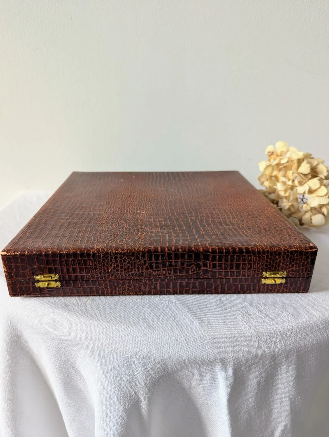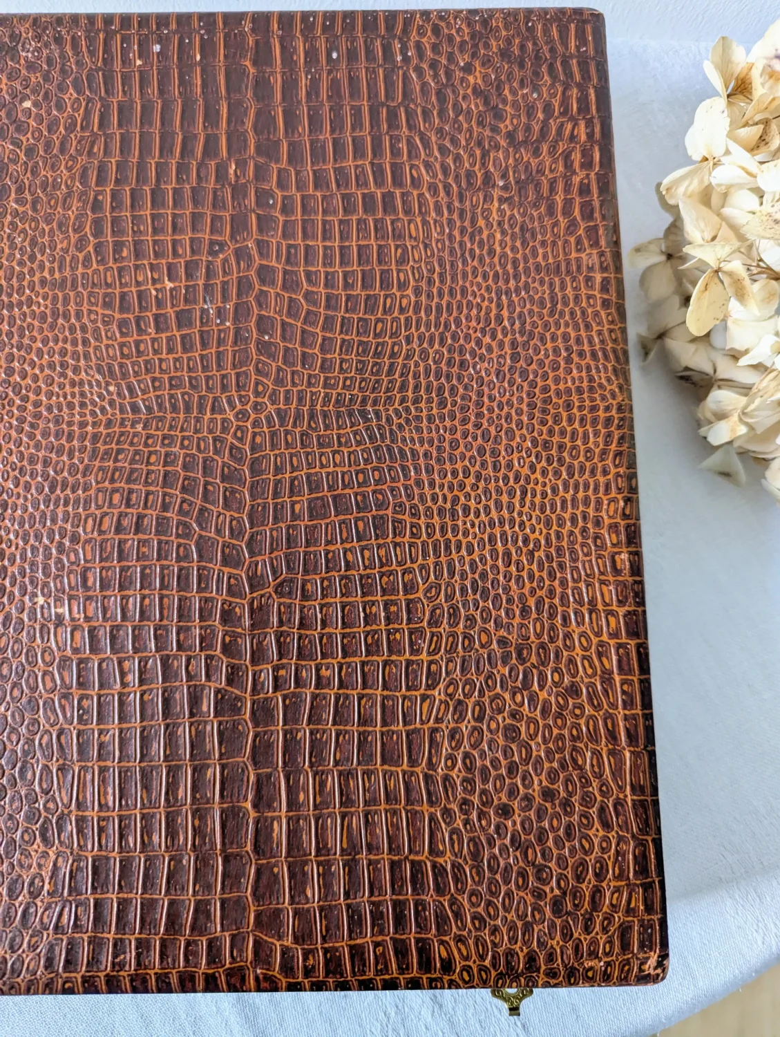 Coffret : 29 × 29 cm, extérieur simili cuir brun effet croco, intérieur satin blanc.