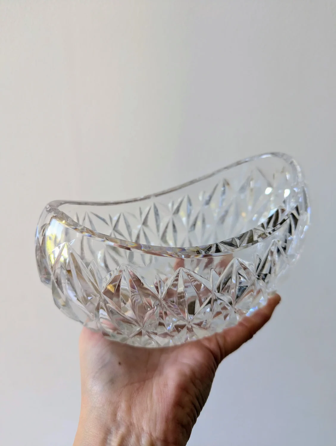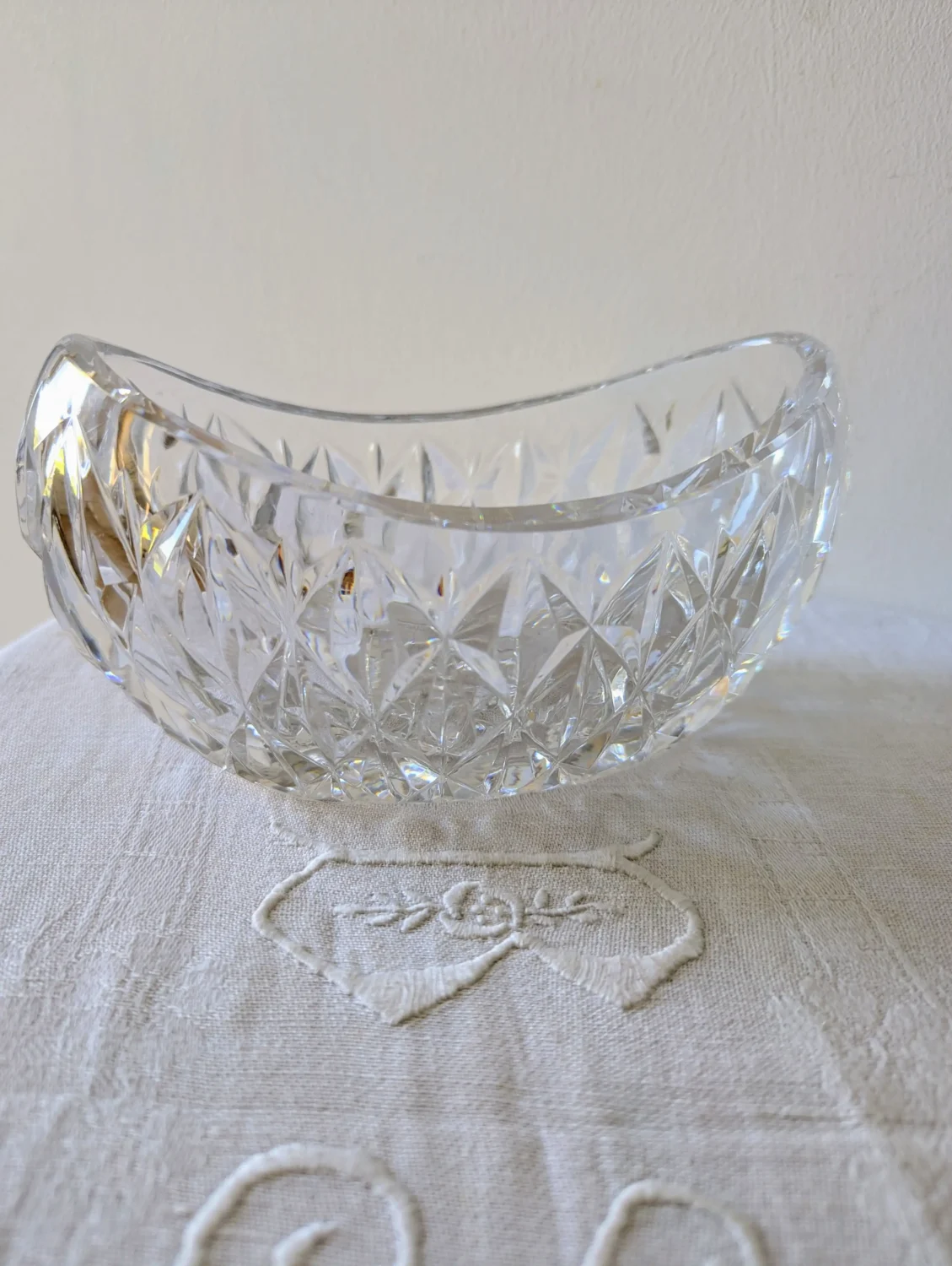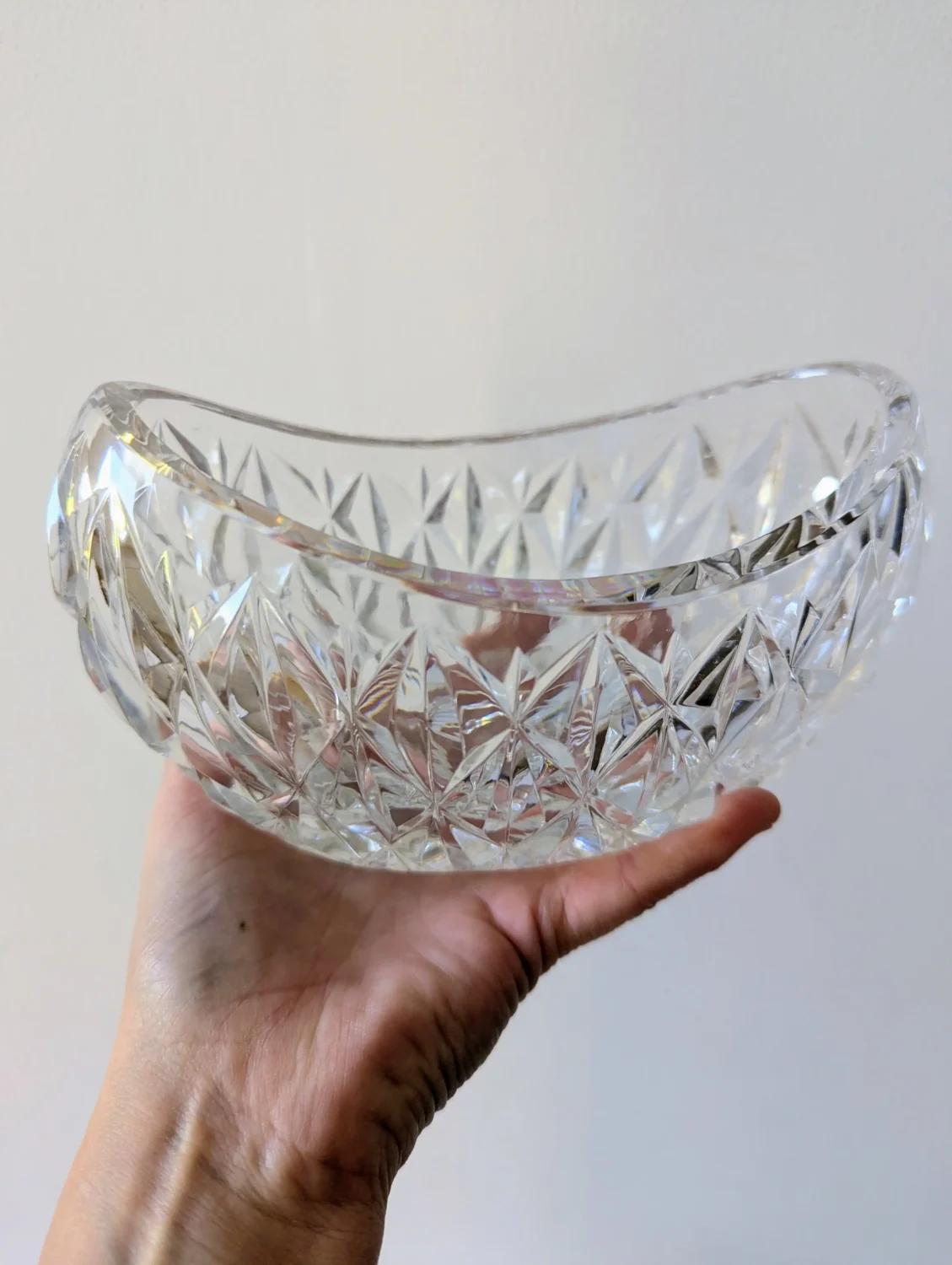 Cette corbeille en cristal vintage mesure 18 cm de longueur, idéale pour un usage décoratif ou fonctionnel.