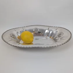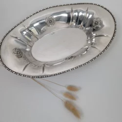 Fabriquée en métal argenté de haute qualité, cette corbeille porte le numéro 5838 gravé. Ce détail confirme son authenticité et renforce son intérêt historique. Sa forme ovale reste élégante, tandis que ses bords perlés créent une ligne graphique subtile. De plus, ses quatre motifs en relief rappellent l’esthétique Art déco, ce qui donne à l’objet une allure à la fois classique et structurée. Grâce à ces choix esthétiques, la corbeille exprime parfaitement l’esprit de la maison Christofle, et plus particulièrement de sa ligne Gallia, synonyme depuis toujours de tradition, d’excellence et d’élégance française.