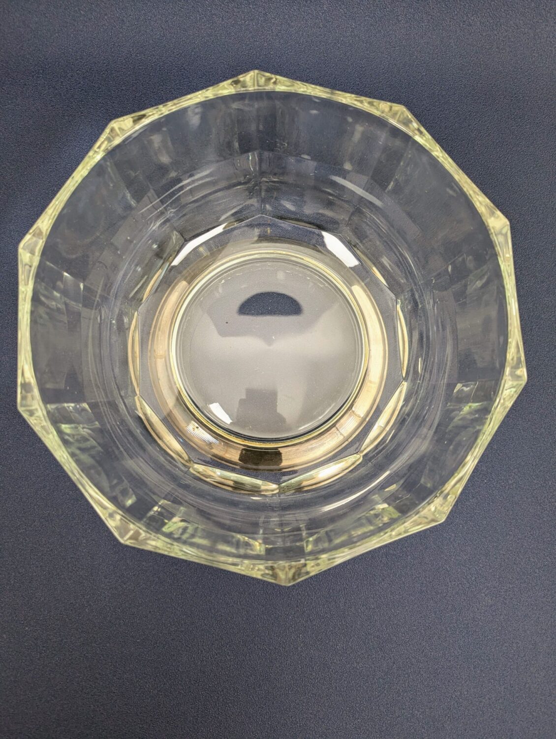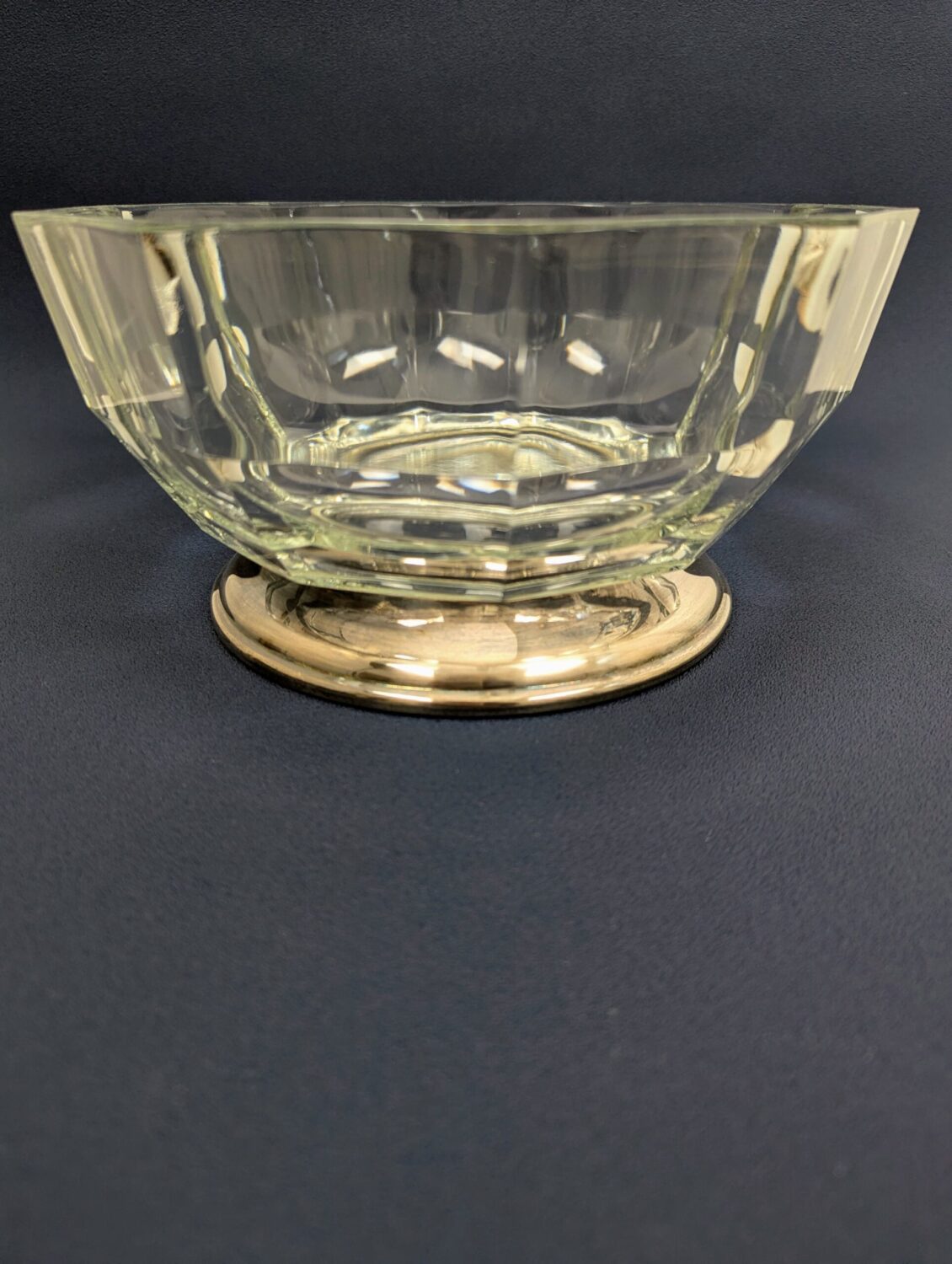 Cette magnifique coupe en cristal en métal argenté sur pied , d’origine italienne, conjugue avec brio élégance décorative et polyvalence d’usage. Sa forme originale à dix pans (décagone) lui donne immédiatement un style art déco affirmé, qui ne laisse personne indifférent. Dès le premier regard, on remarque son éclat et sa structure géométrique sophistiquée, qui évoquent la grande époque du design des années 1930.