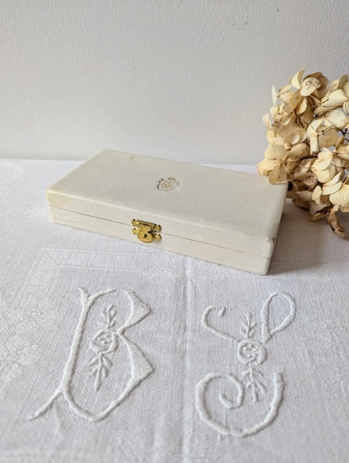 - Écrin d’origine écru, satin blanc imprimé doré