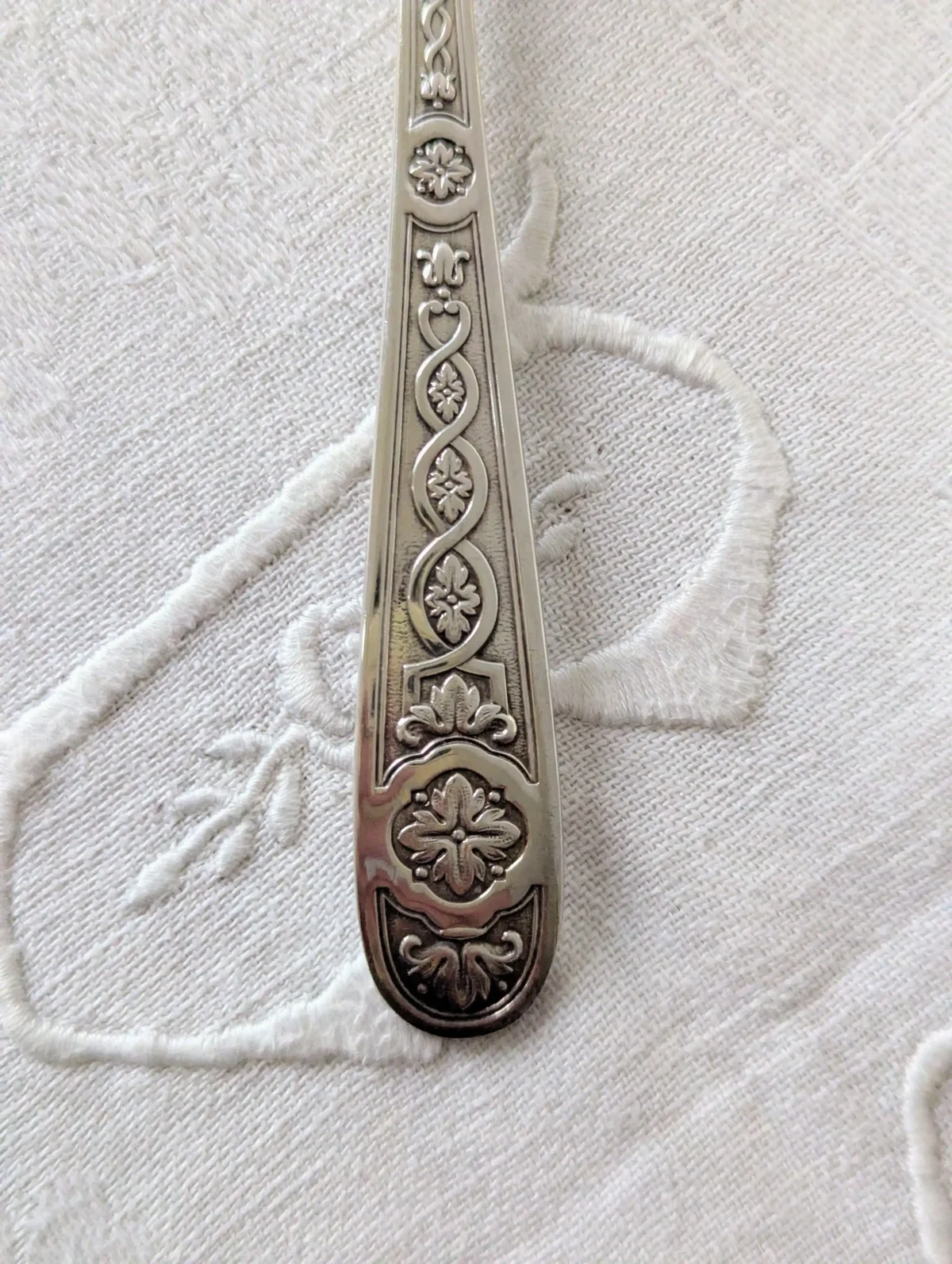 La cuillère semble issue d’un modèle ancien de la maison Christofle, maîtresse dans l’orfèvrerie française depuis le XIXe siècle. Sa forme légèrement creuse facilite le service des sauces, du bouillon, du chocolat fondu ou d’une crème anglaise. Elle apporte ainsi une touche d’élégance à chaque geste. Quelques marques d’usage discrètes confirment son authenticité et son histoire. Elles n’affectent en rien la beauté ni l’utilité de cette pièce.