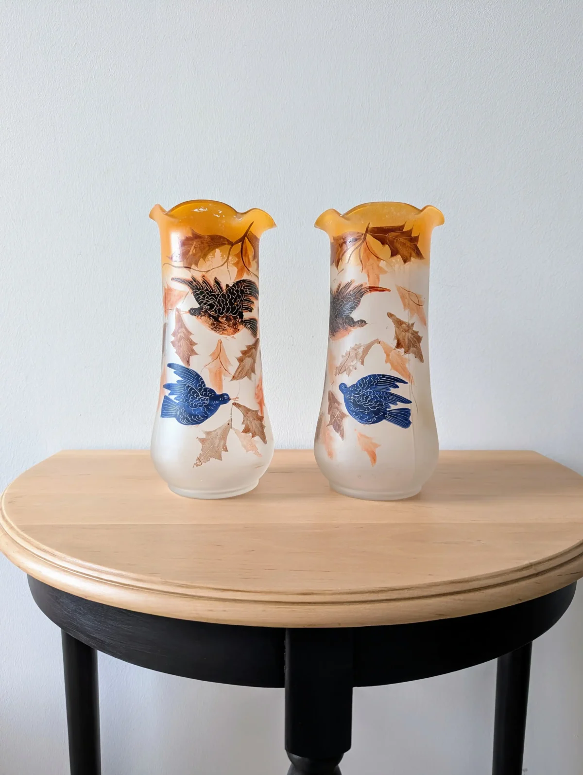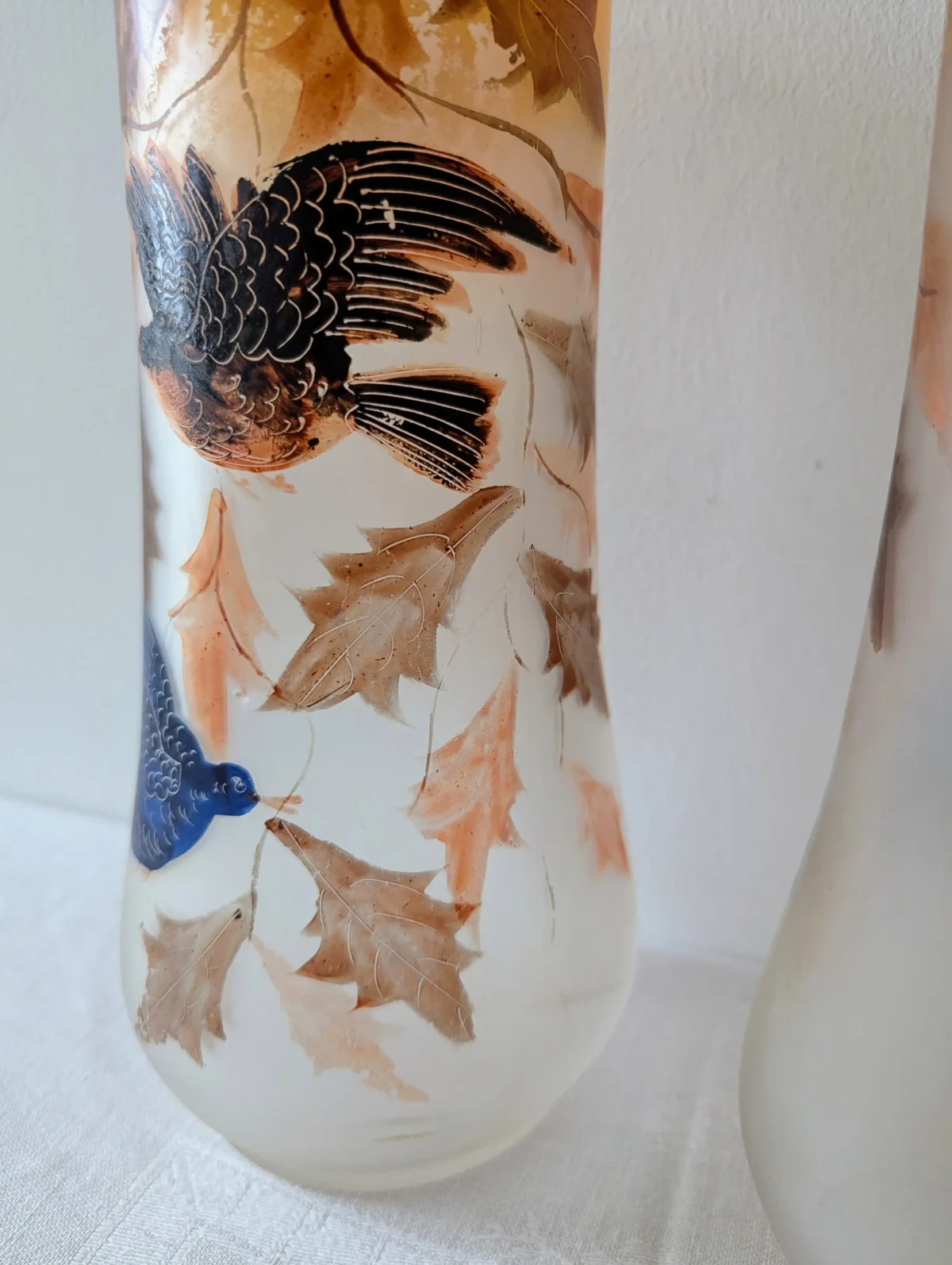 Ce charmant duo de vases Art Nouveau séduit immédiatement par son élégance subtile et son esprit délicatement romantique, qui évoquent ensemble l’âme artistique du début du XXe siècle. En effet, chacun des deux vases présente de jolis décors peints à la main, où les oiseaux bleus et bruns se font face dans un équilibre visuel harmonieux et vivant.