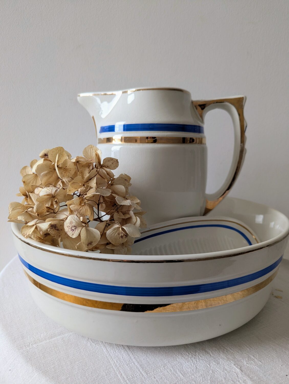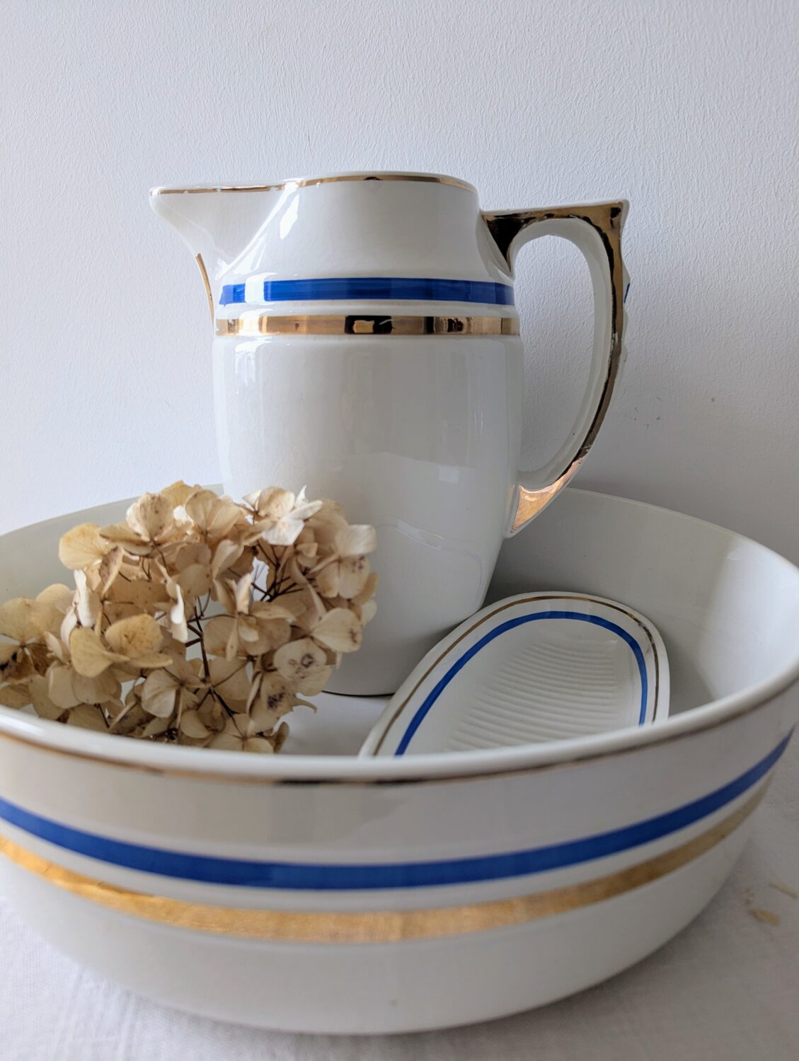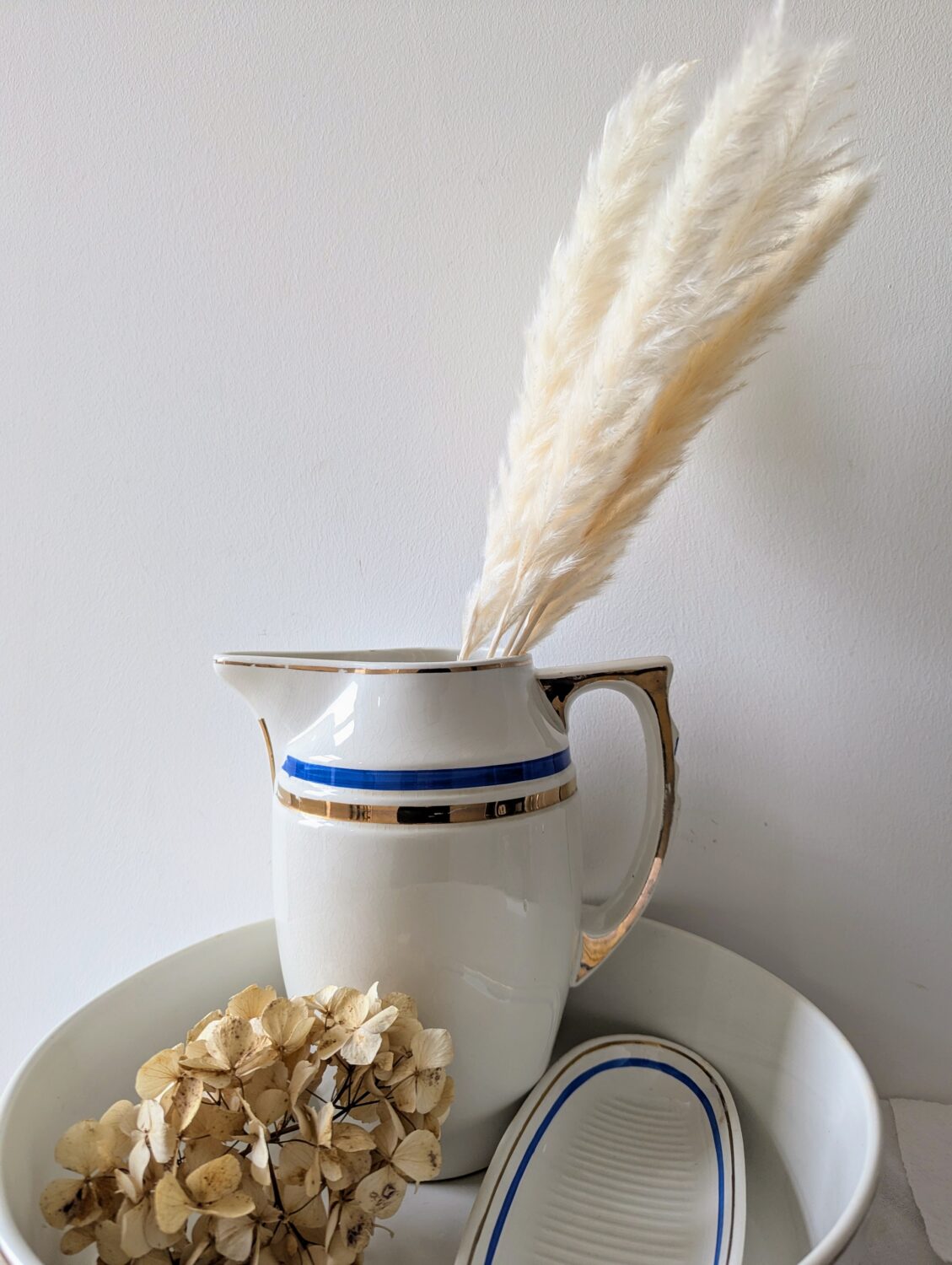 Aujourd’hui, ce service de toilette devient un objet déco unique. Le broc, aux proportions généreuses, se transforme en vase pour pampas ou fleurs séchées ; la bassine peut accueillir fruits, bougies ou compositions florales ; et le porte-savon devient une jolie vide-poche. Chaque élément raconte une histoire et sublime la lumière.
