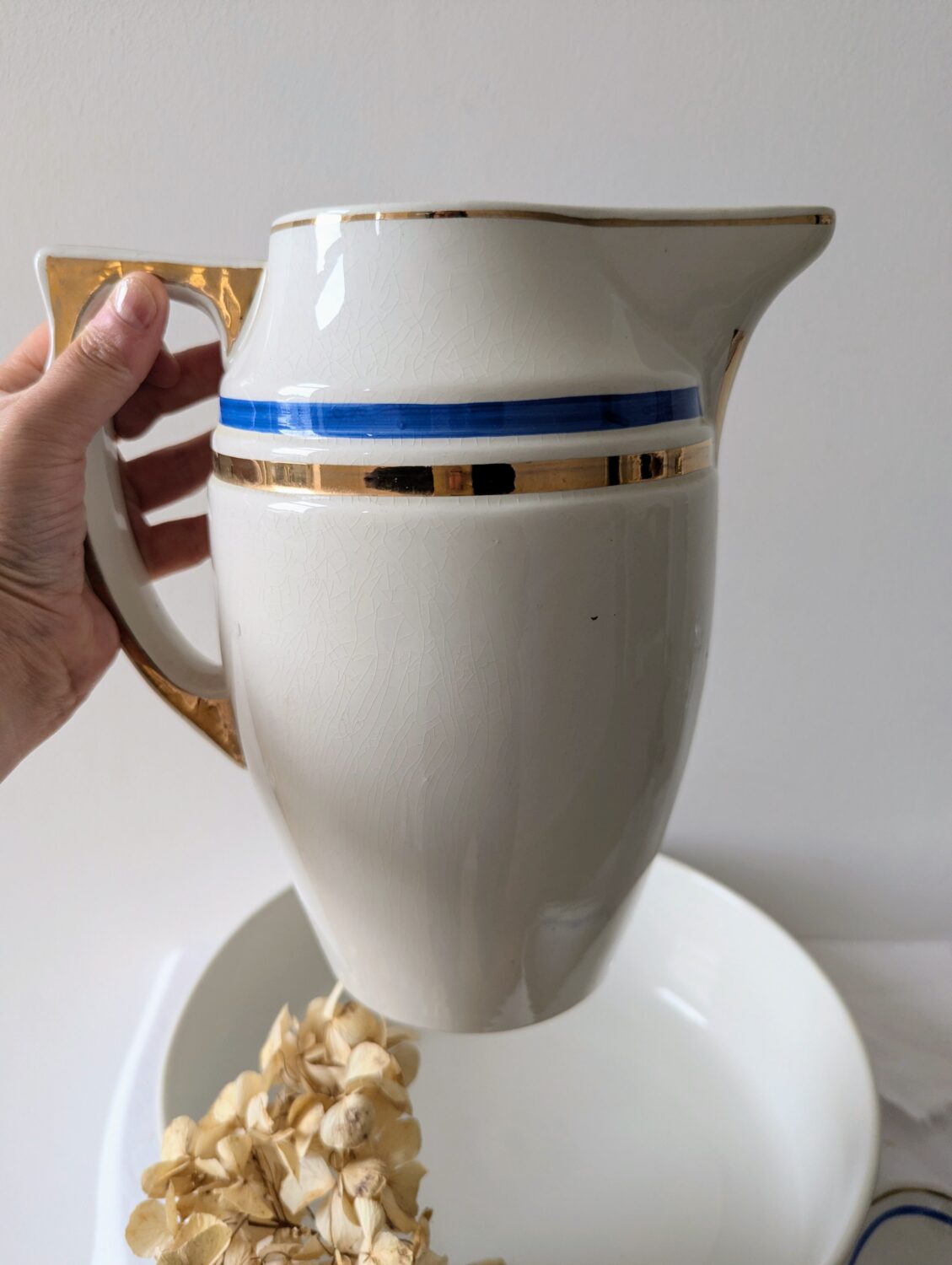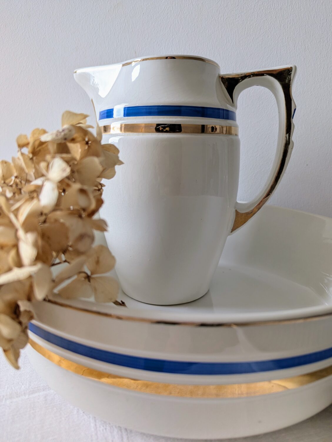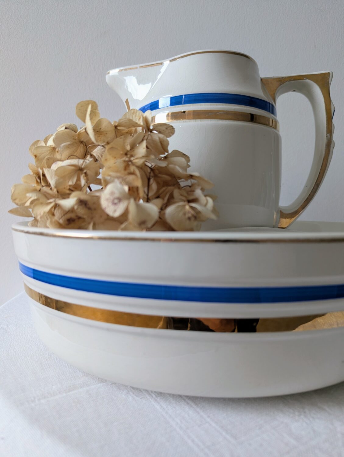 Aujourd’hui, ce service de toilette devient un objet déco unique. Le broc, aux proportions généreuses, se transforme en vase pour pampas ou fleurs séchées ; la bassine peut accueillir fruits, bougies ou compositions florales ; et le porte-savon devient une jolie vide-poche. Chaque élément raconte une histoire et sublime la lumière.