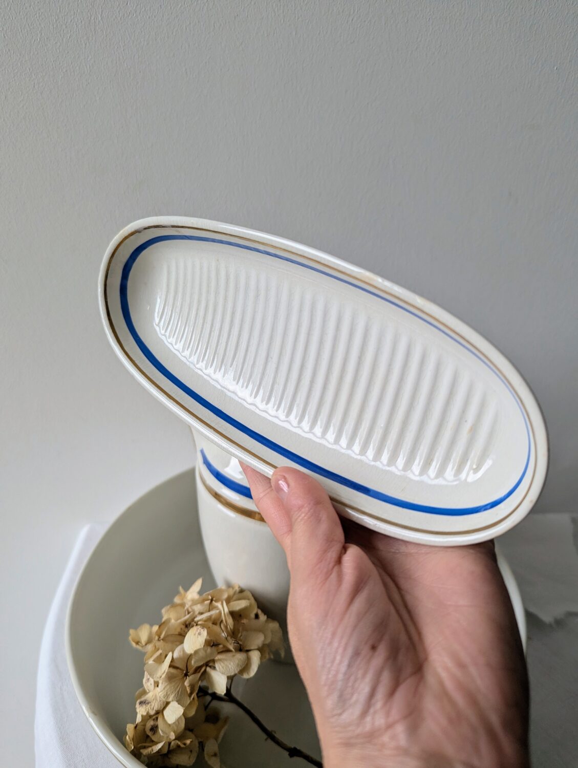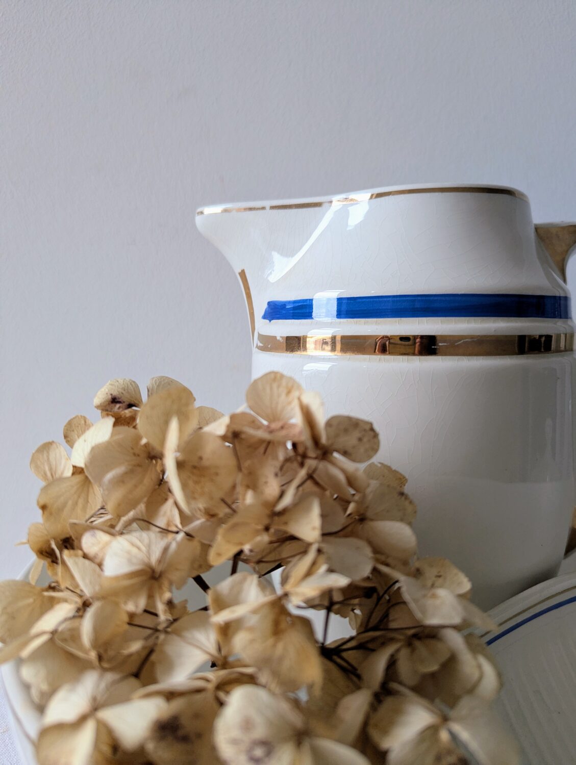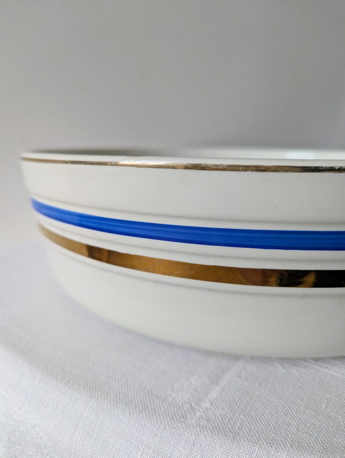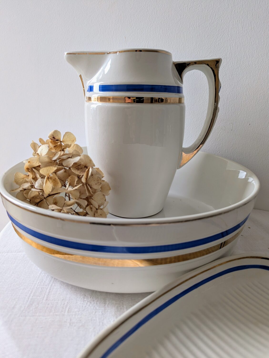 Ce magnifique ensemble en faïence blanche signé Hamage Moulin des Loups incarne le raffinement des arts de la table et de la toilette des années 1930. Ses lignes géométriques Art déco sont rehaussées d’un liseré bleu roi et d’un filet doré à la main. L’ensemble comprend :