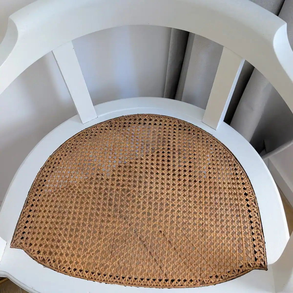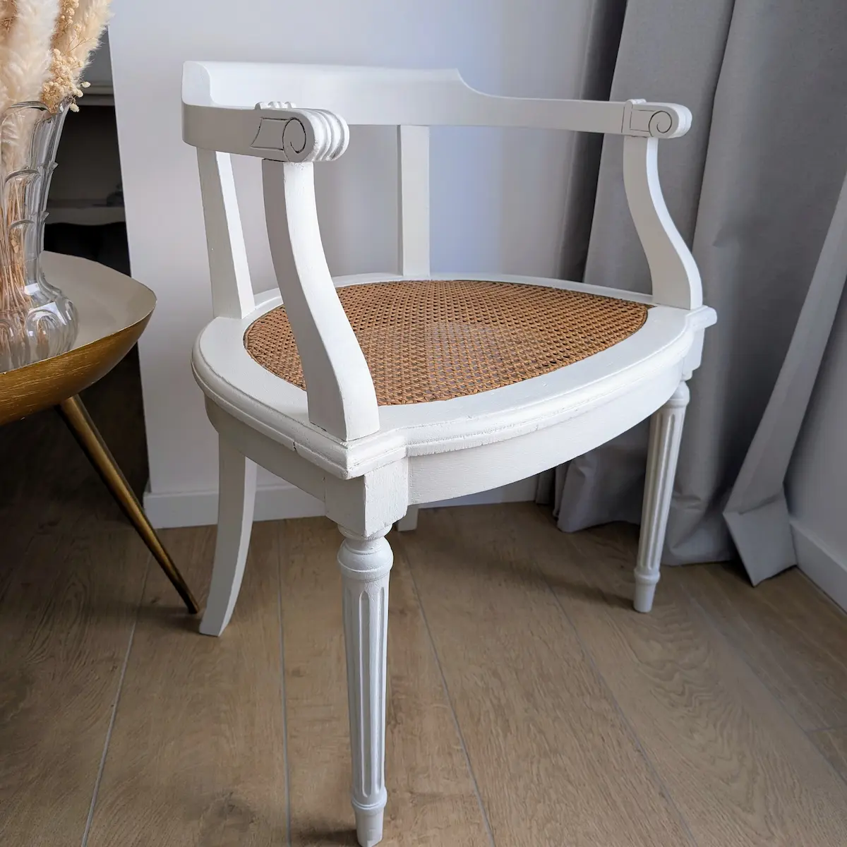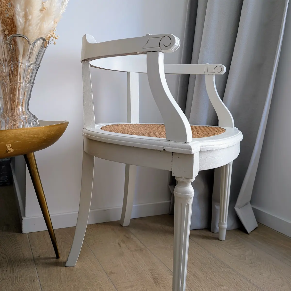 La restauration d’un Fauteuil ancien cannage style Louis XVI datant de l’époque 1930-1960 demande une sensibilité particulière. Contrairement à une chaise Louis XVI ancienne cannée plus traditionnelle, ce modèle a été travaillé pour assumer ses marques du temps. Le ponçage manuel a permis de conserver les reliefs sculptés sur les montants, tandis que le blanc « craie » a été choisi pour sa capacité à capter la lumière naturelle. Cette pièce sélectionnée avec soin illustre parfaitement l’engagement de Villa Brieg : redonner vie à des objets anciens sans en trahir l’origine.