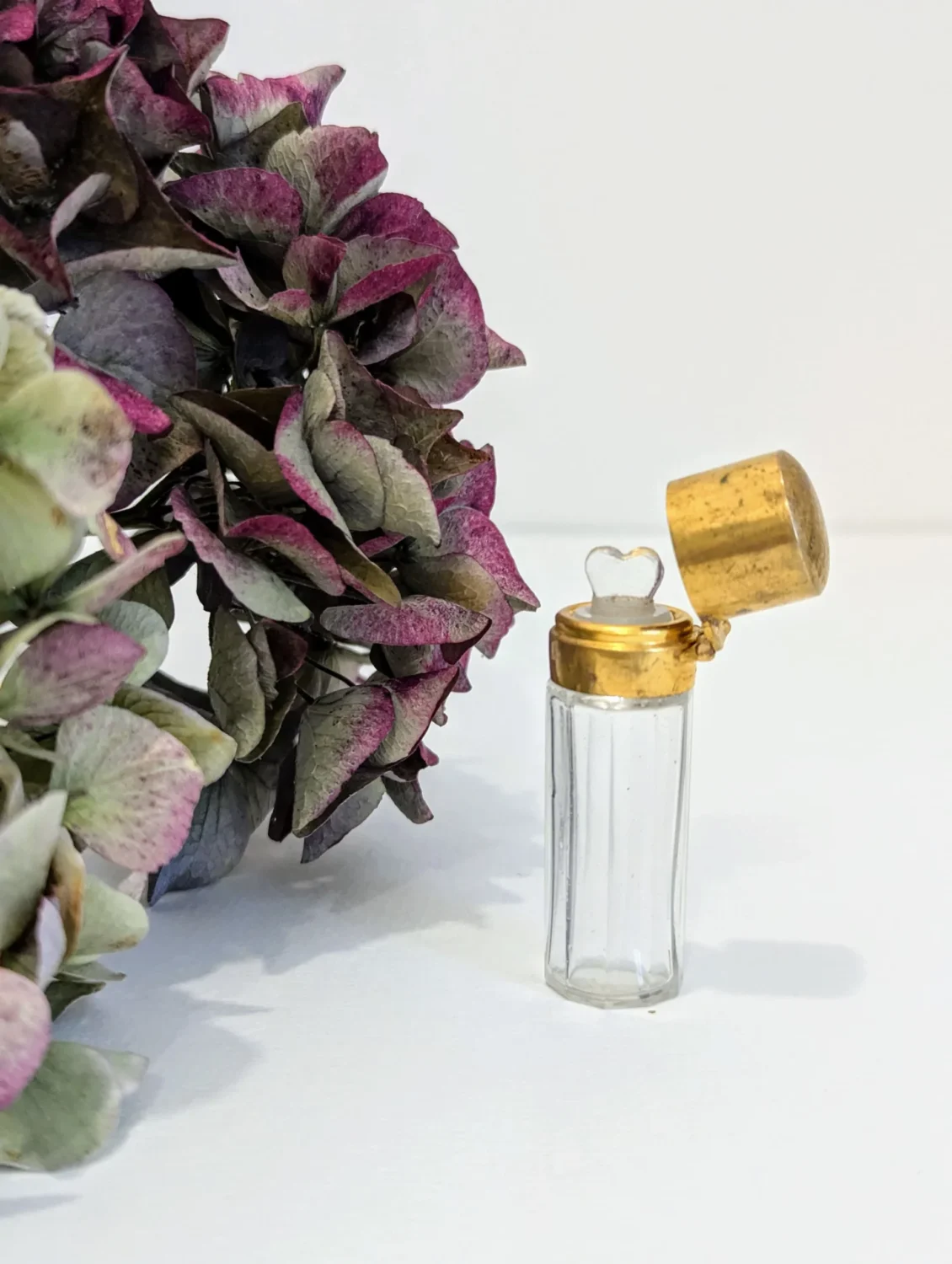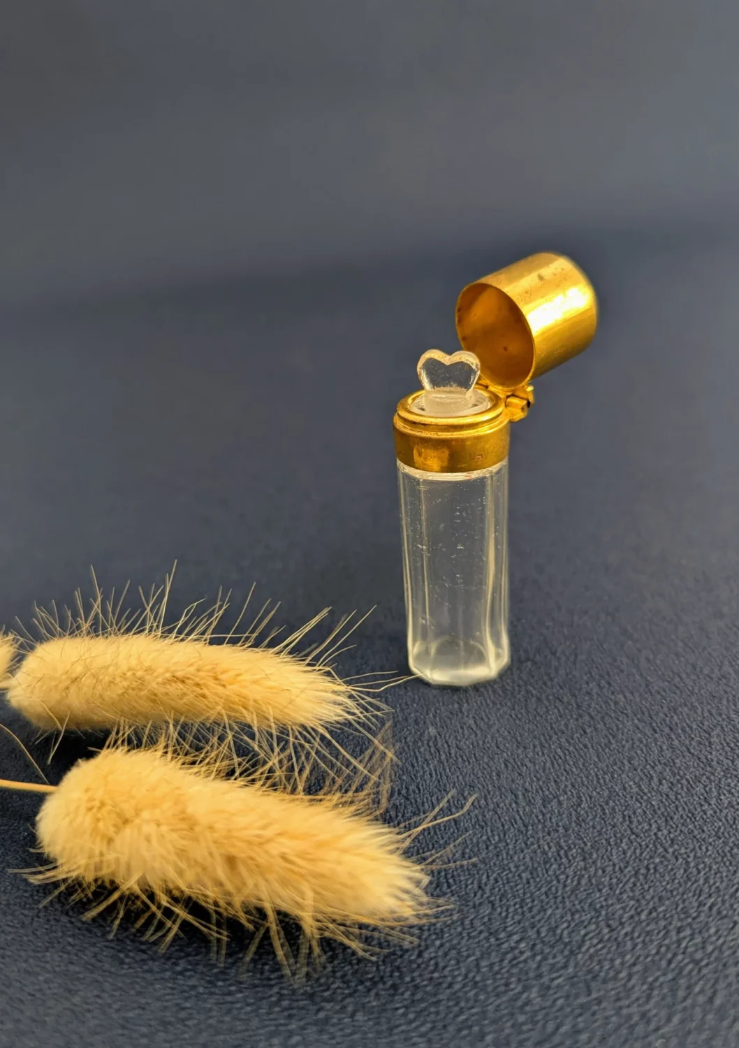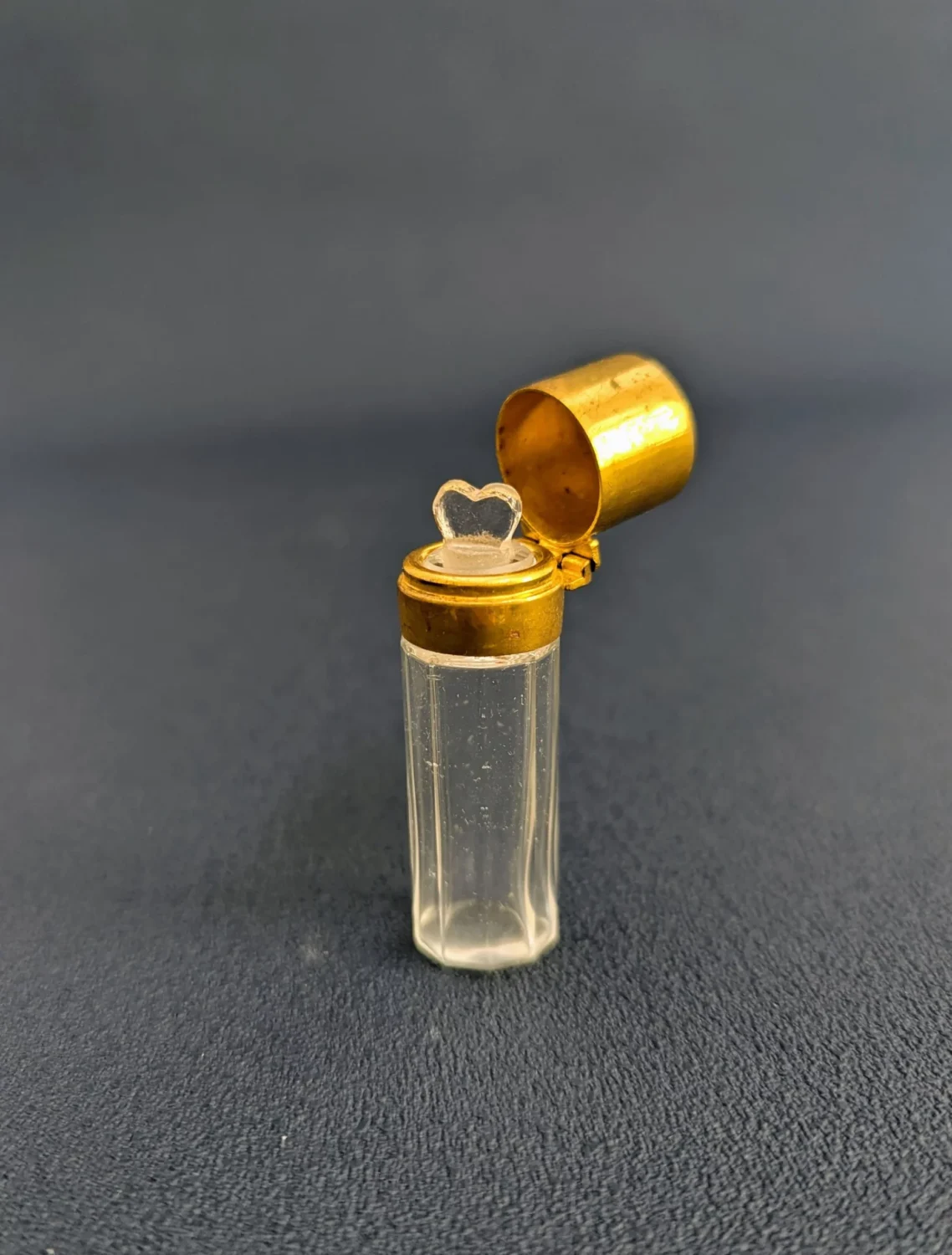 Flacon de parfum de poche ancien en verre et métal doré, Élégant, délicat, rare.
