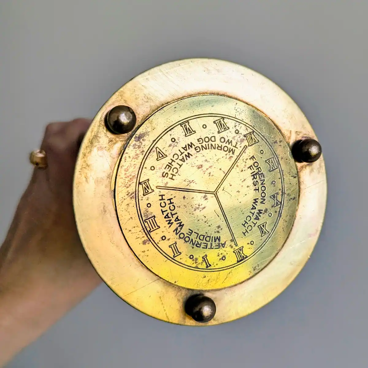 Le laiton provient de fonderies européennes d’après-guerre. Sa haute densité explique pourquoi l’objet est si stable et possède cette couleur dorée profonde, typique des instruments de marine de haute qualité.