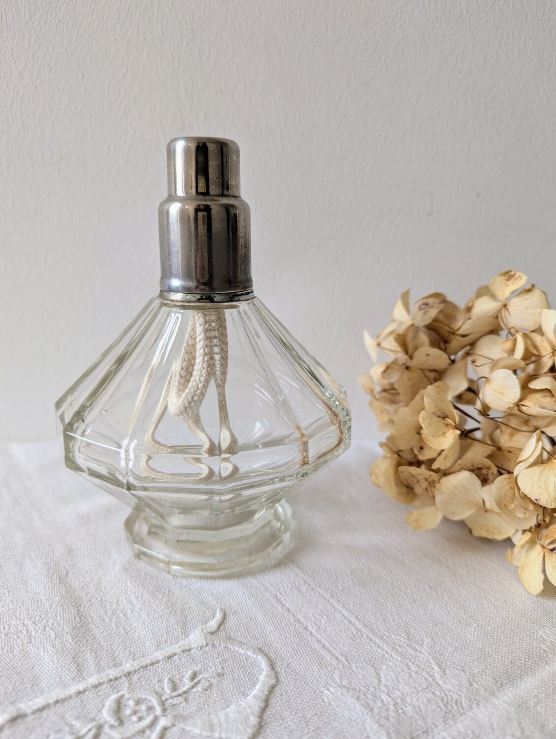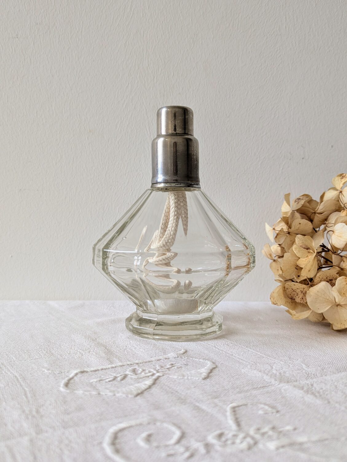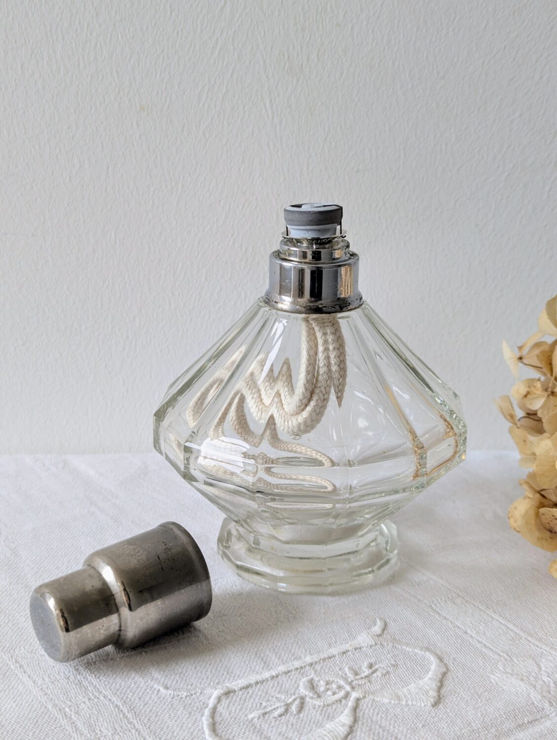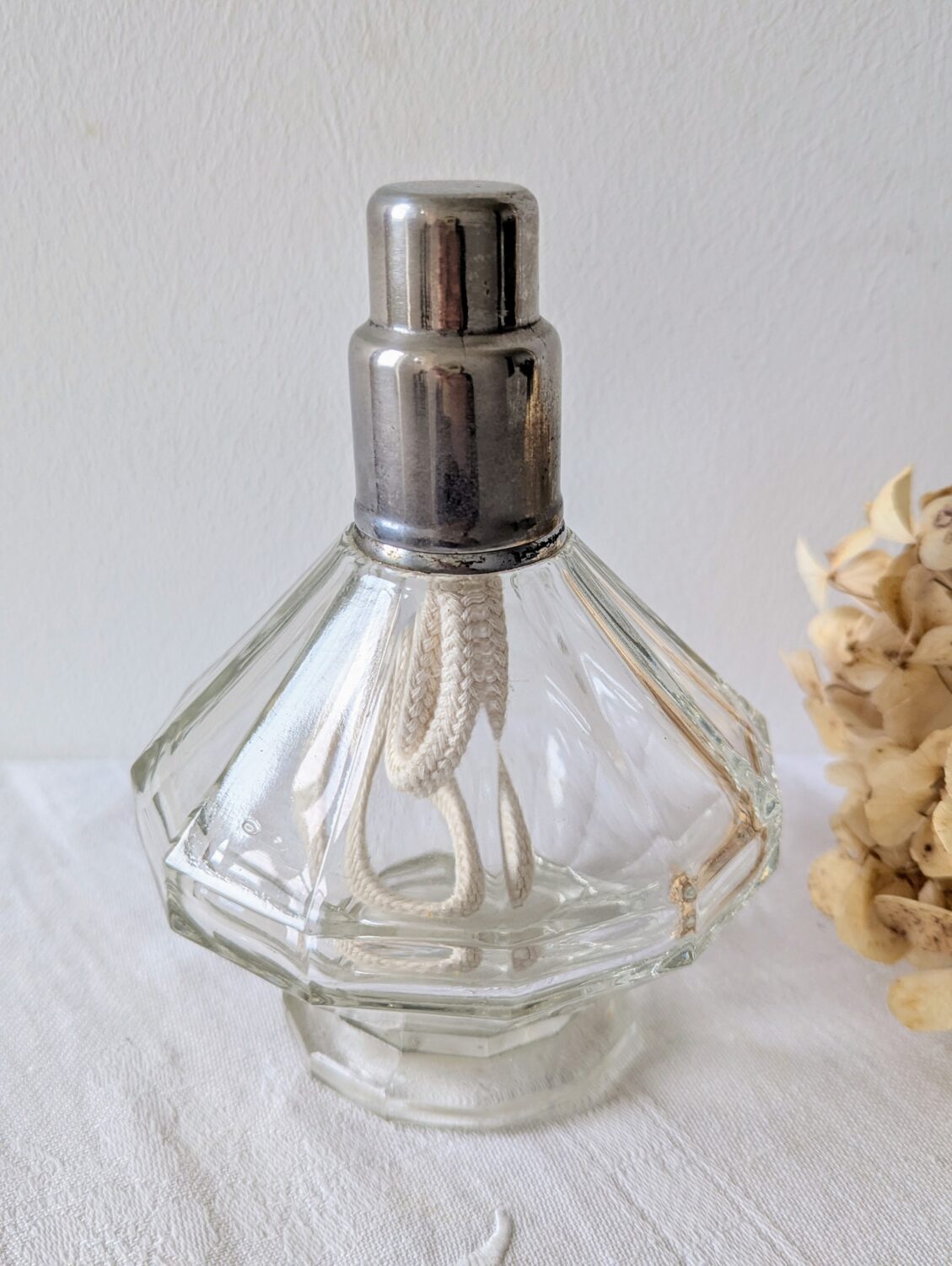 Tout d’abord, son corps en verre moulé transparent offre une vraie présence visuelle. Ensuite, ses facettes apportent de la structure, du graphisme et de la lumière. De plus, sa monture métallique argentée possède une jolie patine naturelle qui souligne son âge avec charme. Enfin, cette ancienne lampe Berger présente un très bel état général, sans fissure ni éclat.