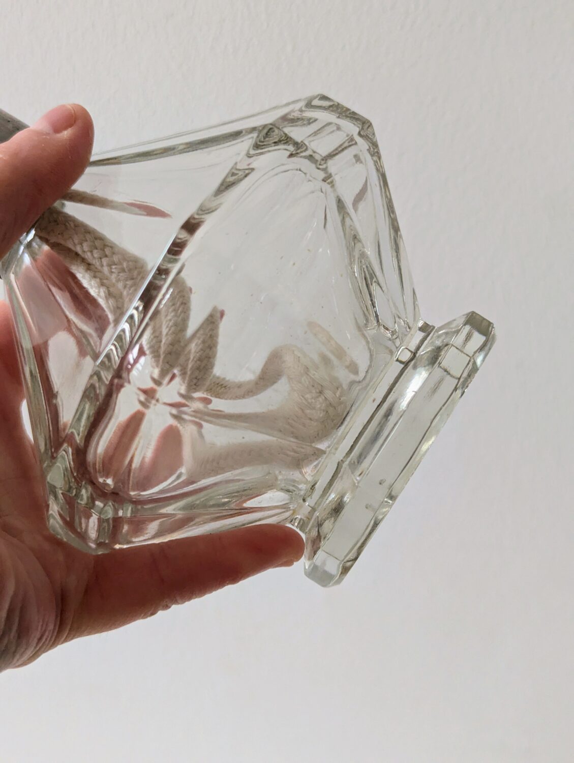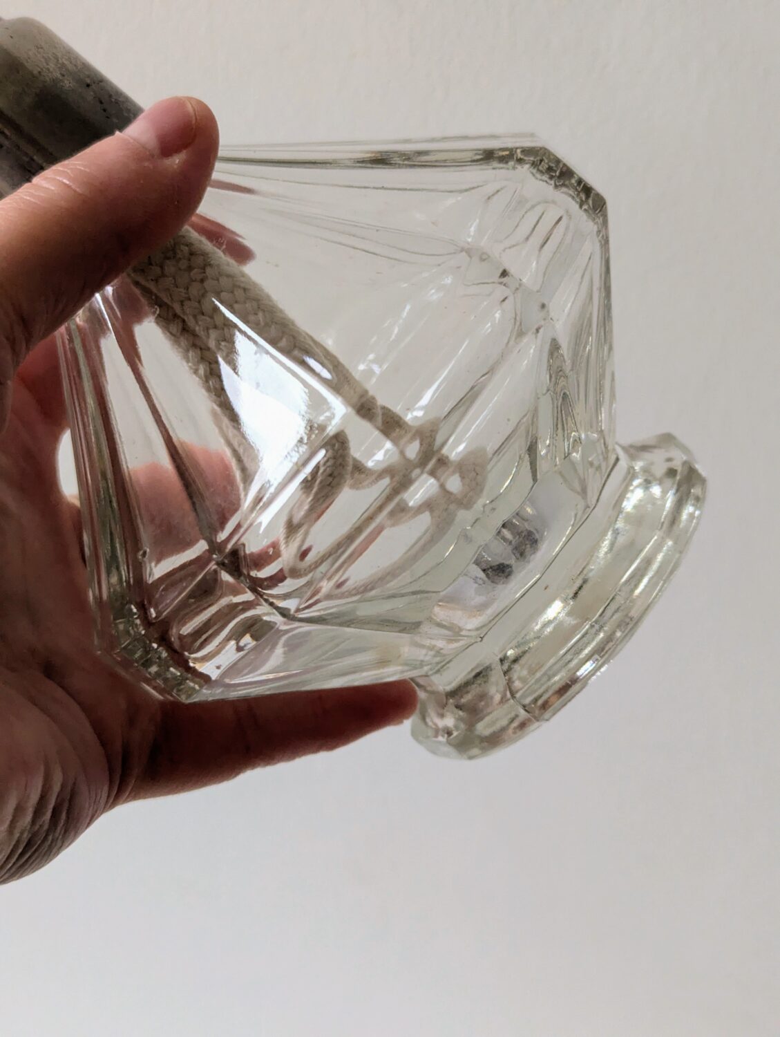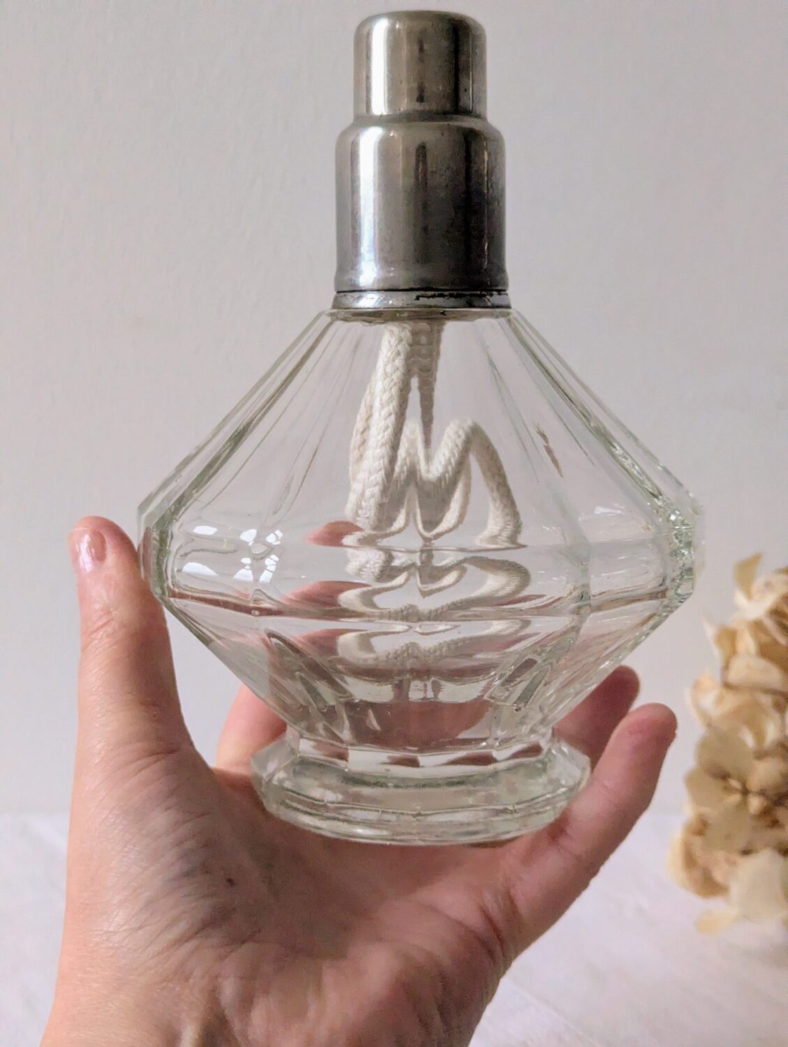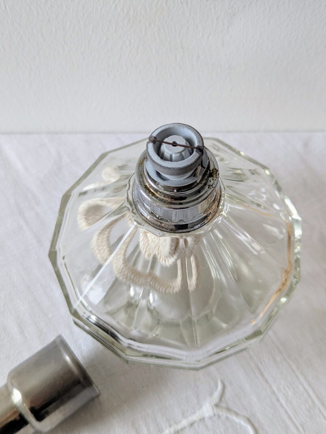 Tout d’abord, son corps en verre moulé transparent offre une vraie présence visuelle. Ensuite, ses facettes apportent de la structure, du graphisme et de la lumière. De plus, sa monture métallique argentée possède une jolie patine naturelle qui souligne son âge avec charme. Enfin, cette ancienne lampe Berger présente un très bel état général, sans fissure ni éclat.