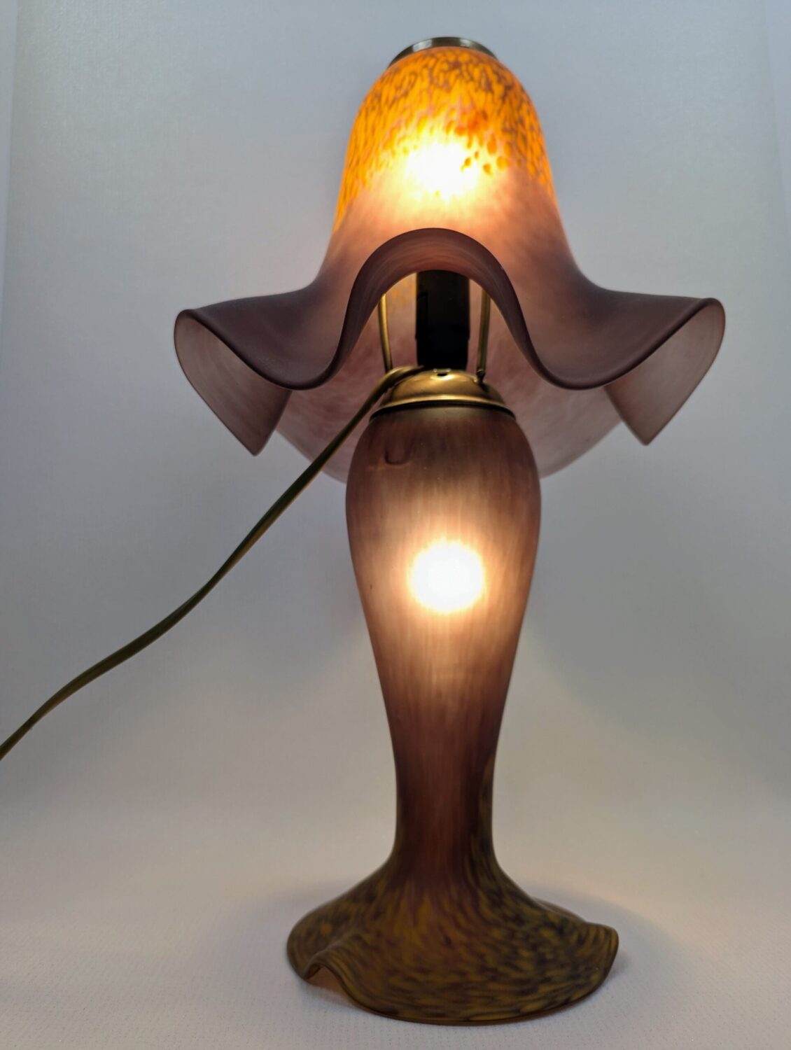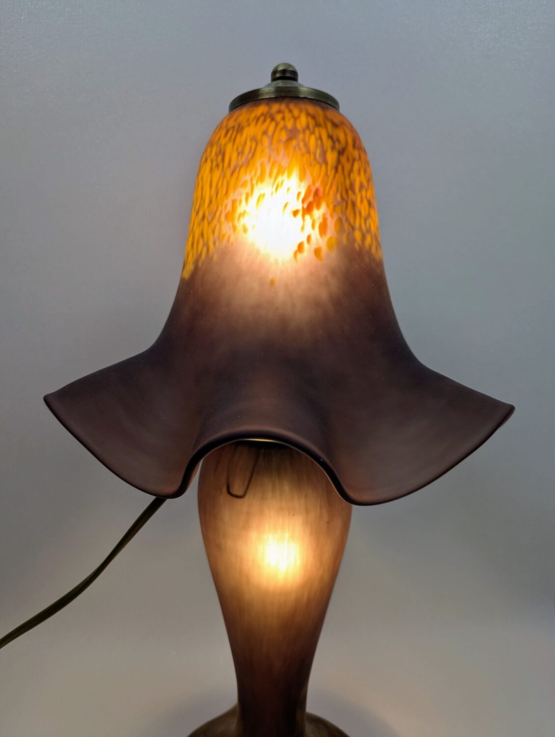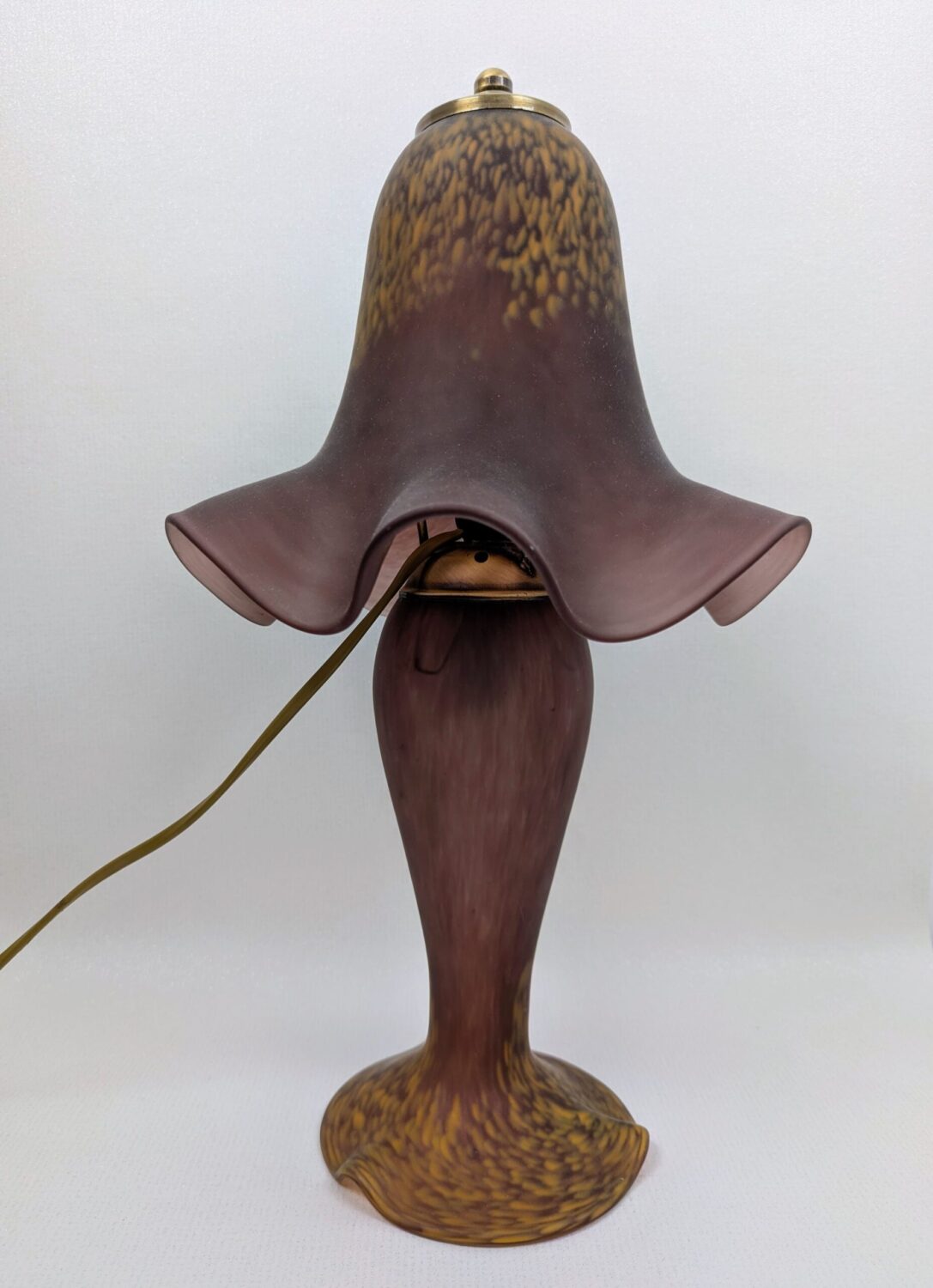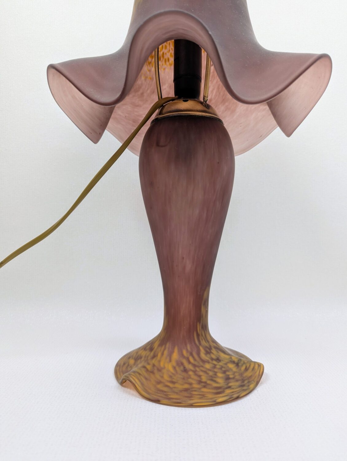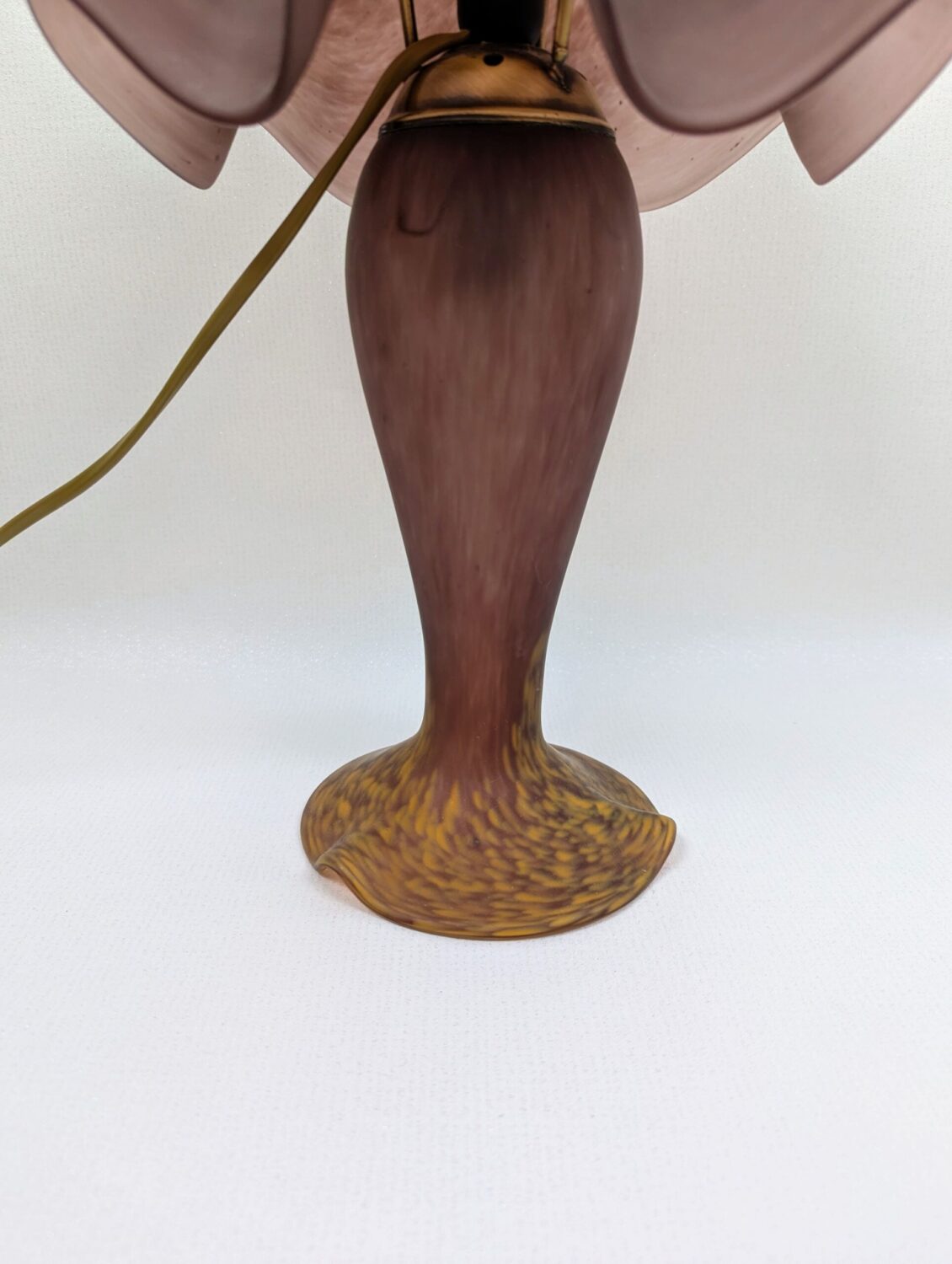 Pied de couleur aubergine moucheté de jaune à la base et abat jour en forme de tulipe couleur aubergine moucheté également.