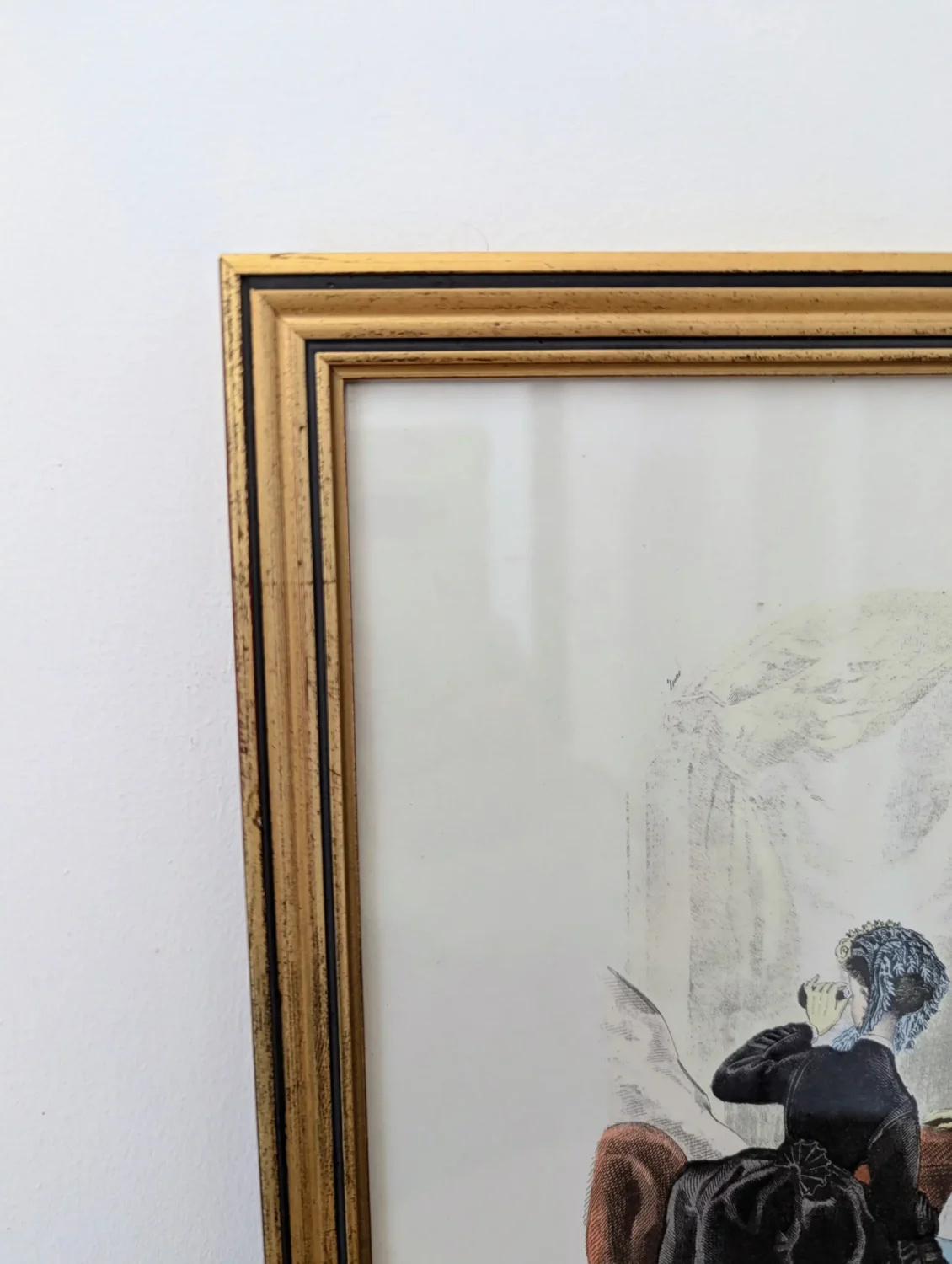 Lithographie Mode illustrée mise en valeur dans un cadre doré élégant, ponctué de lignes vertes qui ajoutent une note colorée discrète et raffinée. Ce cadre en bois, sobre mais soigné, accentue le côté vintage et chic de l’œuvre.